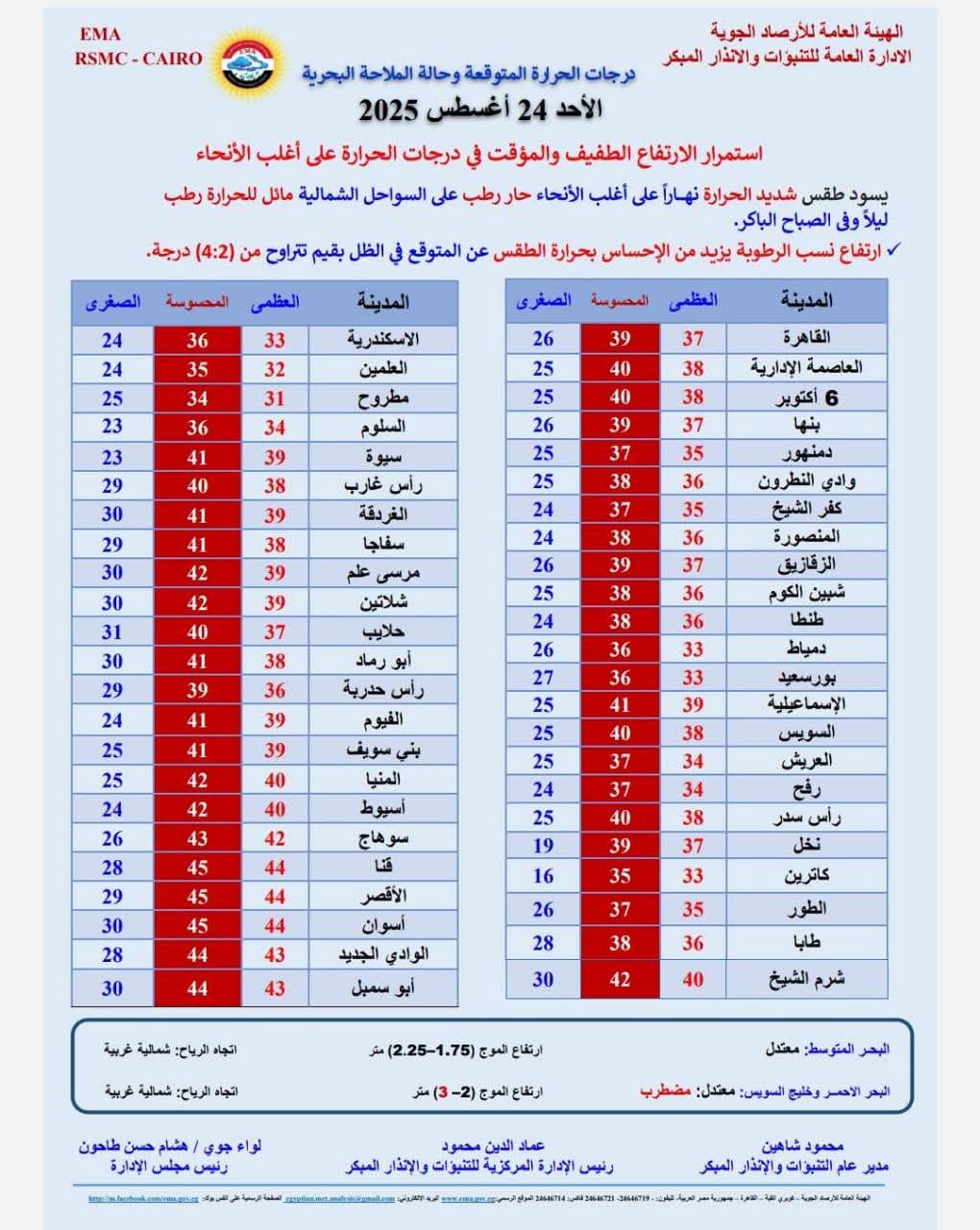 اخبار محلية توقعات حالة الطقس غدًا الأحد 24 أغسطس .. « شديد الحرارة» بواسطة اسلام فضل 23 أغسطس 2025 | 8:40 م كتب اسلام فضل حول حالة الطقس غدًا الأحد.. توقعت الهيئة العامة للأرصاد الجوية الإدارة العامة للتنبؤات والإنذار المبكر يسود طقس شديد الحرارة نهارًا على أغلب الأنحاء، حار رطب على السواحل الشمالية مائل للحرارة رطب ليلًا وفي الصباح الباكر. وفقا لبيان هيئة الأرصاد، فإن حالة الطقس غدًا يسودها مجموعة من الظواهر الجوية، فى القاهرة الكبري والوجة البحري ومدن القناة تشهد رياح نشطة بسرعة 30 كيلو/متر في الساعة. أما فى السواحل الشمالية الغربية والشرقية وشمال الصعيد تشهد رياح نشطة بسرعة 32 كيلو/متر في الساعة. بينما في جنوب سيناء وسلاسل جبال البحر الأحمر وجنوب الصعيد والصحراء الغربية تشهد فرص ضعيفة لأمطار خفيفة احيانا رياح نشطة مع فرص أمطار خفيفة بسرعة 38 كيلو/متر في الساعة. درجة الحرارة درجة الحرارة غدا في القاهرة: العظمى 37 والصغرى 26 درجة الحرارة غدا فى العاصمة الإدارية: العظمى 38 الصغرى 25 درجة الحرارة غدا في الاسكندرية: العظمى 33 والصغرى 24 درجة الحرارة غدا في العلمين الجديدة: العظمى 32 والصغرى 24 درجة الحرارة غدا في مطروح: العظمي 31 والصغرى 25 درجة الحرارة غدا في بورسعيد: العظمى 32 والصغرى 27 درجة الحرارة غدا في الاسماعيلية: العظمى 37 والصغرى 24 درجة الحرارة غدا في العريش: العظمى 33 والصغري 25 درجة الحرارة غدا في رأس سدر: العظمى 36 والصغري 25 درجة الحرارة غدا في شرم الشيخ: العظمى 40 والصغرى 30 درجة الحرارة غدا في الغردقة: العظمى 38 والصغرى 28 درجة الحرارة غدا في الاقصر: العظمى 44 والصغري 29 درجة الحرارة غدا في أسوان: العظمى 44 والصغري 30 حالة الطقس ودرجات الحرارة بجميع المدن المصرية حالة الملاحة المتوقعة غدًا الأحد طبقا لتقرير هيئة الأرصاد الجوية، فإنه من المتوقع أن يكون البحر المتوسط معتدل، ارتفاع الموج 1.75 إلى 2.25 متر واتجاه الرياح شمالية غربية. اما البحر الأحمر فيكون معتدل: مضطرب الموج بين 2 إلى 3 متر واتجاه الرياح: شمالية غربية. 23 أغسطس 2025 | 8:40 م FacebookTwitterPinterestLinkedinWhatsappTelegramEmail