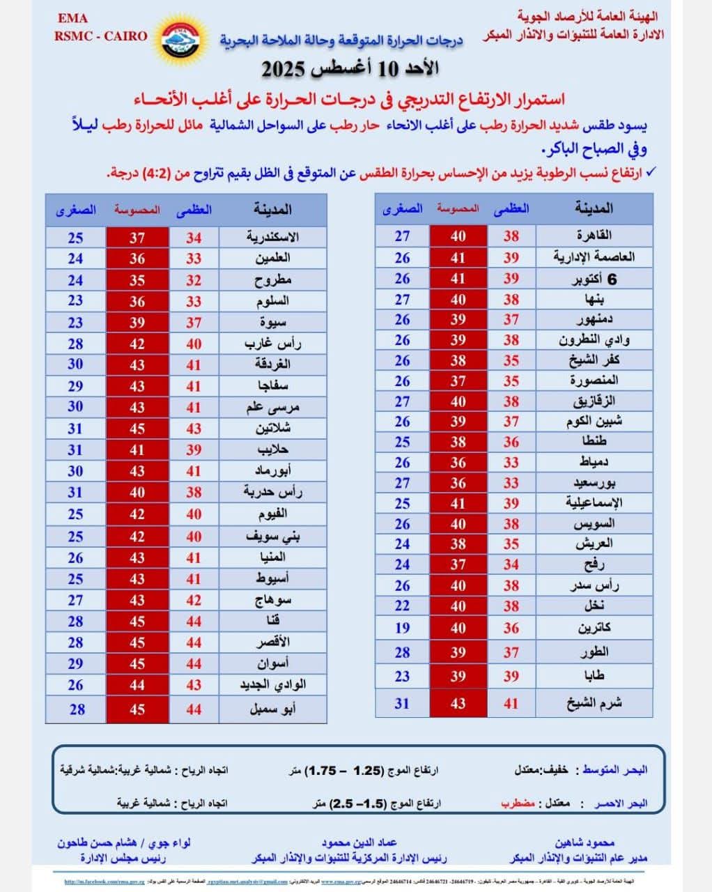 اخبار محلية توقعات حالة الطقس غدًا الأحد 10 أغسطس.. «حار رطب على السواحل الشمالية» بواسطة اسلام فضل 9 أغسطس 2025 | 7:18 م كتب اسلام فضل حول حالة الطقس غدًا الأحد.. توقعت الهيئة العامة للأرصاد الجوية الإدارة العامة للتنبؤات والإنذار المبكر يسود طقس حار رطب نهارا على أغلب الأنحاء، حار رطب على السواحل الشمالية، مائل للحرارة رطب ليلًا وفي الصباح الباكر. وفقا لبيان هيئة الأرصاد، فإن حالة الطقس غدًا يسودها مجموعة من الظواهر الجوية، فى القاهرة الكبري والوجة البحري ومدن القناة رياح معتدلة بسرعة 26 كيلو/متر في الساعة. أما فى السواحل الشمالية الغربية والشرقية وشمال الصعيد تشهد رياح معتدلة بسرعة 28 كيلو/متر في الساعة. بينما في جنوب سيناء وسلاسل جبال البحر الأحمر وجنوب الصعيد والصحراء الغربية رياح نشطة مع فرص أمطار خفيفة بسرعة 40 كيلو/متر في الساعة. درجة الحرارة درجة الحرارة غدا في القاهرة: العظمى 38 والصغرى 27 درجة الحرارة غدا فى العاصمة الإدارية: العظمى 39 الصغرى 26 درجة الحرارة غدا في الاسكندرية: العظمى 34 والصغرى 2425 درجة الحرارة غدا في العلمين الجديدة: العظمى 33 والصغرى 24 درجة الحرارة غدا في مطروح: العظمي 32 والصغرى 24 درجة الحرارة غدا في بورسعيد: العظمى 33 والصغرى 27 درجة الحرارة غدا في الاسماعيلية: العظمى 39 والصغرى 25 درجة الحرارة غدا في العريش: العظمى 35 والصغري 24 درجة الحرارة غدا في رأس سدر: العظمى 38 والصغري 26 درجة الحرارة غدا في شرم الشيخ: العظمى 41 والصغرى 31 درجة الحرارة غدا في الغردقة: العظمى 41 والصغرى 30 درجة الحرارة غدا في الاقصر: العظمى 44 والصغري 28 درجة الحرارة غدا في أسوان: العظمى 44 والصغري 29 حالة الطقس ودرجات الحرارة بجميع المدن المصرية حالة الملاحة المتوقعة غدًا الأحد طبقا لتقرير هيئة الأرصاد الجوية، فإنه من المتوقع أن يكون البحر المتوسط خفيف: معتدل، ارتفاع الموج 1.25 إلى 1.75 متر واتجاه الرياح شمالية غربية: شمالية شرقية. اما البحر الأحمر فيكون معتدل: مضطرب الموج بين 1.5 إلى 2.5 متر واتجاه الرياح: شمالية غربية. 9 أغسطس 2025 | 7:18 م FacebookTwitterPinterestLinkedinWhatsappTelegramEmail