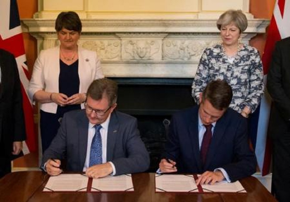 رئيسة وزراء بريطانيا تعقد اتفاقا يعطي ايرلندا الشمالية تمويلا إضافيا بقيمة مليار جنيه استرليني بواسطة أموال الغد 26 يونيو 2017 | 5:47 م كتب أموال الغد 26 يونيو 2017 | 5:47 م رئيسة وزراء بريطانيا زعيمة حزب المحافظين (يمينا) تقف إلى جوار زعيمة الحزب الديمقراطي الوحدوي بينما يوقع اتفاق بين الجانبين بصفقة بقيمة مليار جنيه استرليني لأيرلندا الشمالية مقابل الحصول على دعم أكبر حزب بروتستانتي هناك. صورة لرويترز من ممثل لوكالات الأنباء النشر FacebookTwitterPinterestLinkedinWhatsappTelegramEmail 13 عقدت اليوم تيريزا ماي رئيسة الوزراء البريطانية اتفاقا لدعم حكومة الأقلية التي تقودها بالموافقة على تمويل إضافي بقيمة مليار جنيه استرليني لأيرلندا الشمالية مقابل الحصول على دعم أكبر حزب بروتستانتي في الإقليم. وسيدعم الحزب الديمقراطي الوحدوي ومشرعيه العشرة الآن حزب المحافظين للإبقاء على حكومته في السلطة ولكن ليس كشريك في الائتلاف. إقرأ أيضاً بريطانيا تعتزم حظر خدمات بحرية لصادرات الغاز الروسي بريطانيا تعلن اعترافها بدولة فلسطينية.. رسميا بريطانيا وكندا وأستراليا يعلنون اعترافهم رسميًا بدولة فلسطين وترأست ماي وزعيمة الحزب الديمقراطي الوحدوي أرلين فوستر مراسم توقيع الاتفاق في مقر رئاسة الوزراء بداوننج ستريت يوم الاثنين. وابتسمت السيدتان وتبادلتا المزاح فيما وقع مفاوضان من الجانبين الاتفاق الذي يستمر حتى انتهاء فترة البرلمان الحالي في عام 2022. وقالت في بيان لها اليوم “أرحب بهذا الاتفاق الذي سيمكننا من العمل معا على لصالح المملكة المتحدة برمتها ويعطينا التيقن المطلوب مع بدئنا الخروج من الاتحاد الأوروبي ويساعدنا في بناء مجتمع أكثر قوة وعدالة في الداخل”. وفي إطار الإتفاق وافقت ماي على زيادة الإنفاق على الإقليم بمقدار مليار جنيه استرليني (1.27 مليار دولار) على مدى عامين في حين وافق الحزب على دعم ماي في عمليات تصويت برلمانية بشأن الموازنة وكل جوانب الانسحاب من الاتحاد الأوروبي والأمن القومي والخطة التشريعية بشكل عام. ويتيح الاتفاق لماي تمرير تشريعات بدعم الحزب في البرلمان المؤلف من 650 مقعدا وأن تبقى في السلطة فيما تحاول التفاوض على خروج بريطانيا من التكتل الأوروبي. اللينك المختصرللمقال: https://amwalalghad.com/2qti ايرلندا الشماليةبريطانياحكومة أقليةرئيسة وزراء بريطانيا