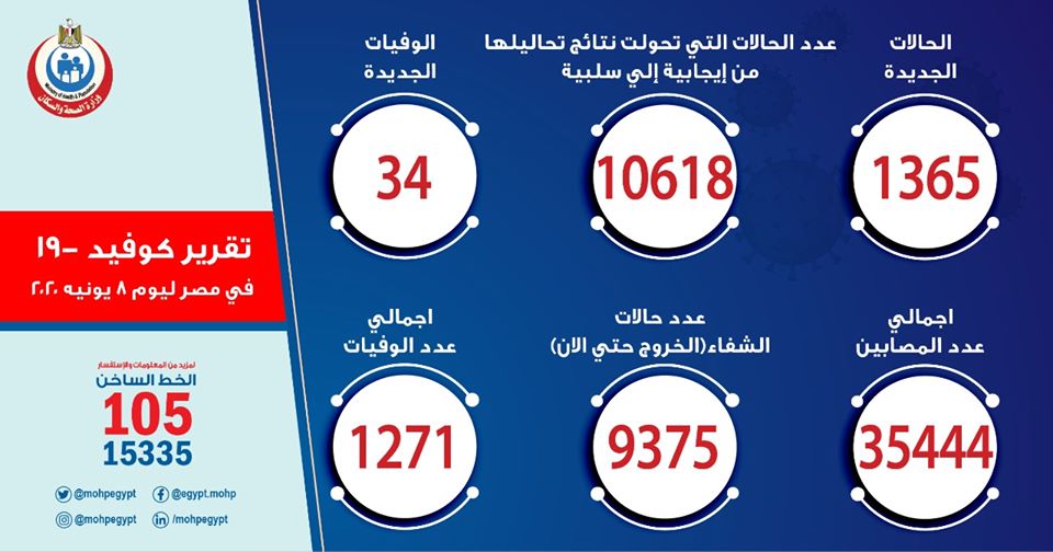 مصر تسجل 1365 حالة إيجابية جديدة لفيروس كورونا.. و 34 حالة وفاة بواسطة هشام ابراهيم 8 يونيو 2020 | 9:38 م كتب هشام ابراهيم 8 يونيو 2020 | 9:38 م النشر FacebookTwitterPinterestLinkedinWhatsappTelegramEmail 26 أعلنت وزارة الصحة والسكان، اليوم الإثنين، عن خروج 414 من المصابين بفيروس كورونا من مستشفيات العزل والحجر الصحي، وذلك بعد تلقيهم الرعاية الطبية اللازمة وتمام شفائهم وفقًا لإرشادات منظمة الصحة العالمية، ليرتفع إجمالي المتعافين من الفيروس إلى 9375 حالة حتى اليوم. وأوضح الدكتور خالد مجاهد، مستشار وزيرة الصحة والسكان لشئون الإعلام والمتحدث الرسمي للوزارة، أن عدد الحالات التي تحولت نتائج تحاليلها معمليًا من إيجابية إلى سلبية لفيروس كورونا (كوفيد-19) ارتفع ليصبح 10618 حالة، من ضمنهم الـ 9375 متعافيًا. إقرأ أيضاً «الصحة»: 2.59 مليار جنيه إجمالي المبالغ المنصرفة للقطاع الخاص ضمن التأمين الصحي الشامل خلال 2024/2025 الحكومة تُسرّع تنفيذ المرحلة الثانية من التأمين الصحي الشامل وتدرس ضم الإسكندرية البنك الزراعي يساهم في القضاء على قوائم الانتظار في عمليات زراعة القرنية بالتعاون مع وزارة الصحة وأضاف أنه تم تسجيل 1365 حالة جديدة ثبتت إيجابية تحاليلها معمليًا للفيروس، وذلك ضمن إجراءات الترصد والتقصي التي تُجريها الوزارة وفقًا لإرشادات منظمة الصحة العالمية، لافتًا إلى وفاة 34 حالة جديدة. وقال “مجاهد” إن جميع الحالات المسجل إيجابيتها للفيروس بمستشفيات العزل والحجر الصحي تخضع للرعاية الطبية، وفقًا لإرشادات منظمة الصحة العالمية. وتابع أن المحافظات التي سجلت أعلى معدل إصابات بفيروس كورونا هي “القاهرة، الجيزة والقليوبية”، بينما سجلت محافظات “البحر الأحمر، مطروح وجنوب سيناء” أقل معدلات إصابات بالفيروس، مناشدًا المواطنين الالتزام بالإجراءات الوقائية والاحترازية واتباع إجراءات التباعد الاجتماعي، خاصة في المحافظات ذات معدلات الإصابة العالية. وذكر “مجاهد” أن إجمالي العدد الذي تم تسجيله في مصر بفيروس كورونا المستجد حتى اليوم الإثنين، هو 35444 حالة من ضمنهم 9375 حالة تم شفاؤها وخرجت من مستشفيات العزل والحجر الصحي، و 1271 حالة وفاة. وتواصل وزارة الصحة والسكان رفع استعداداتها بجميع محافظات الجمهورية، ومتابعة الموقف أولاً بأول بشأن فيروس “كورونا المستجد”، واتخاذ كافة الإجراءات الوقائية اللازمة ضد أي فيروسات أو أمراض معدية، كما قاما الوزارة بتخصيص عدد من وسائل التواصل لتلقي استفسارات المواطنين بشأن فيروس كورونا المستجد والأمراض المعدية، منها الخط الساخن “105”، و”15335″ ورقم الواتساب “01553105105”، بالإضافة إلى تطبيق “صحة مصر” المتاح على الهواتف . اللينك المختصرللمقال: https://amwalalghad.com/pi94 تقرير وزارة الصحةحالات كورونا في مصر اليومعدد مصابي كورونا في مصروزارة الصحة