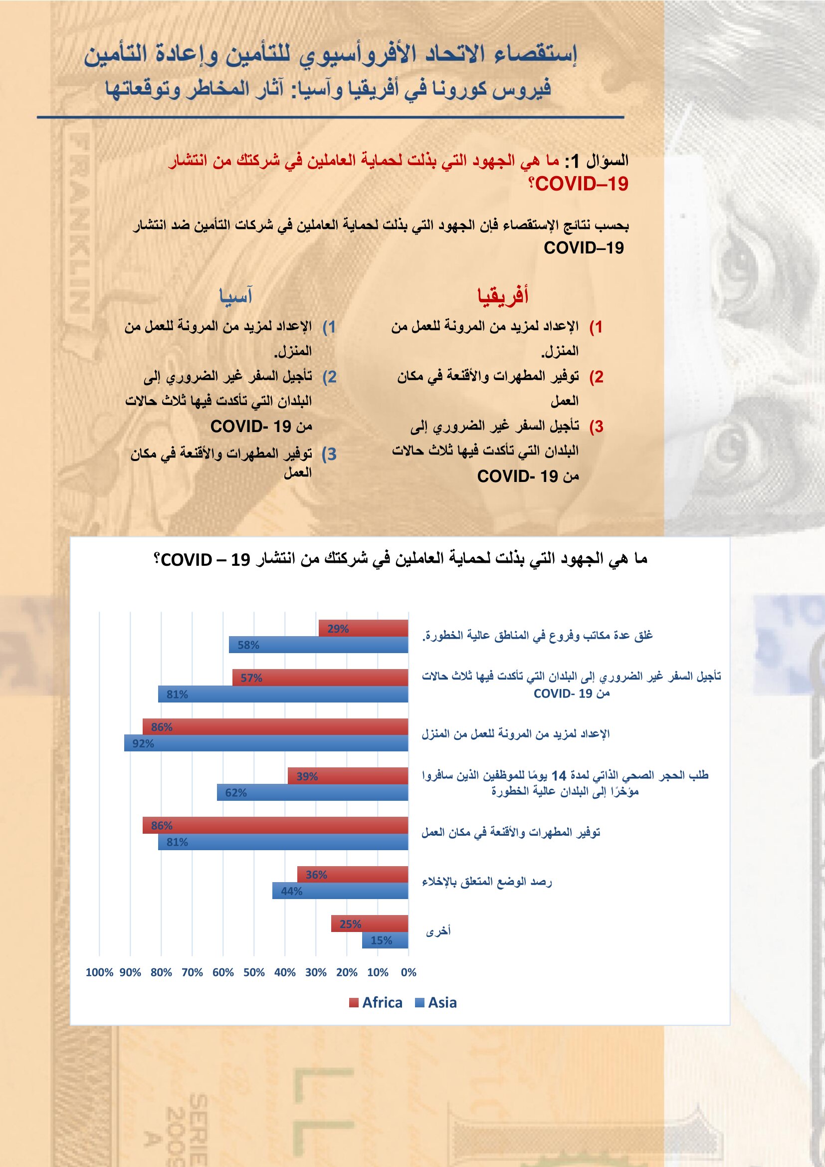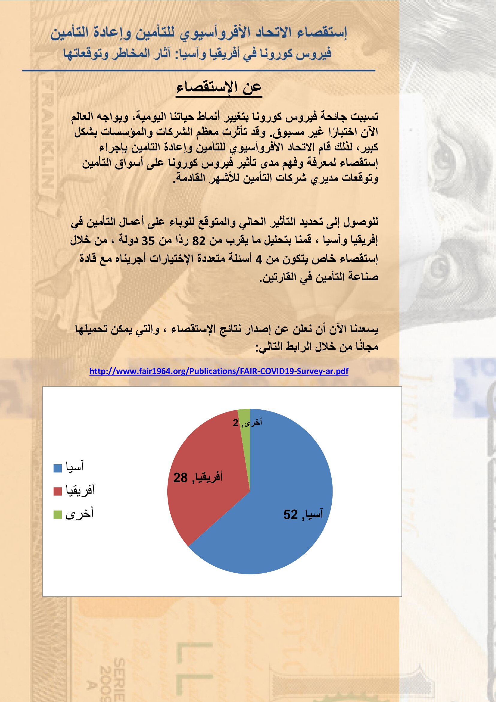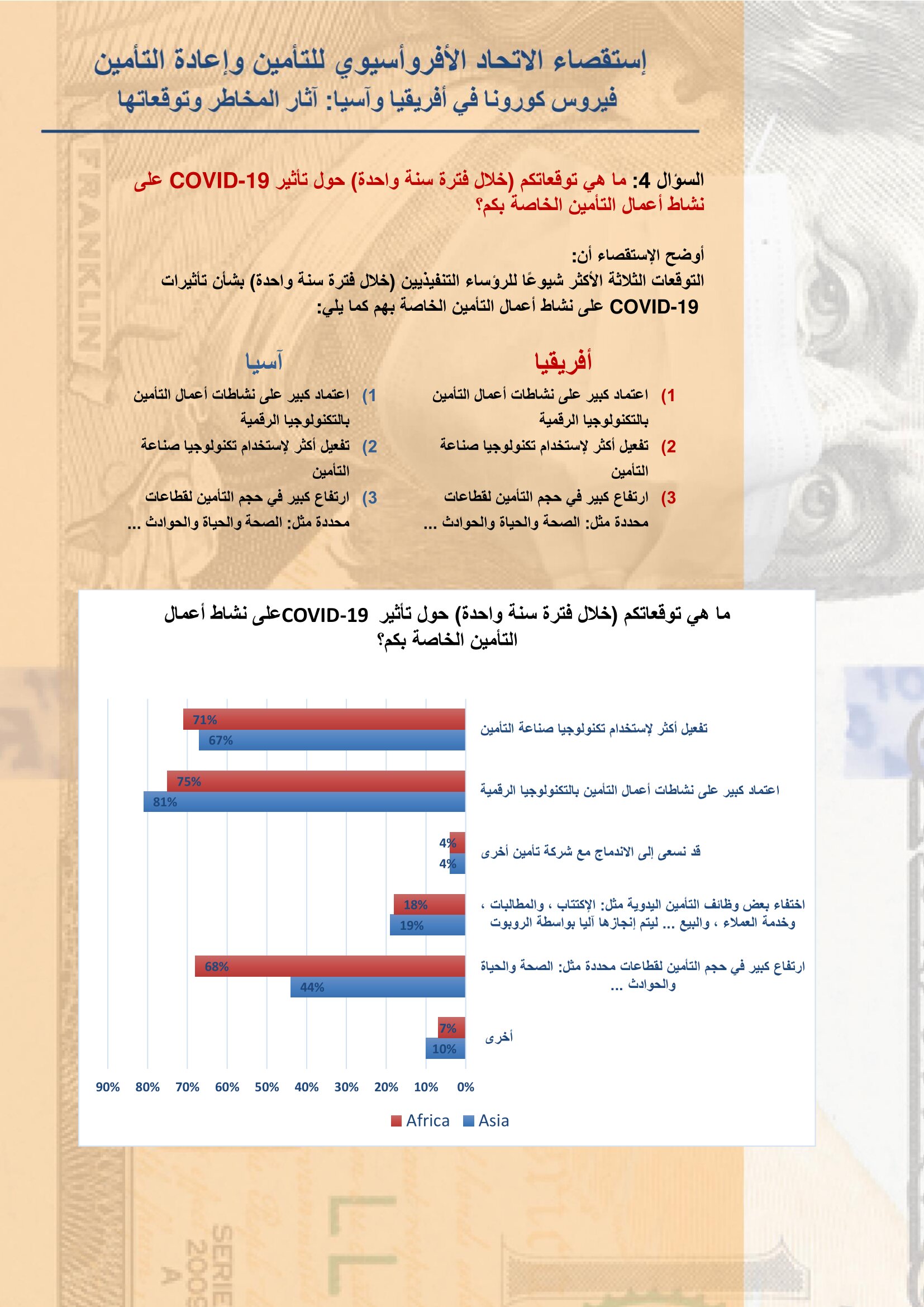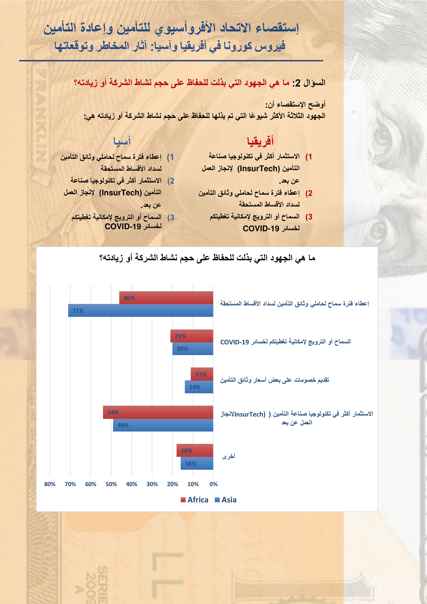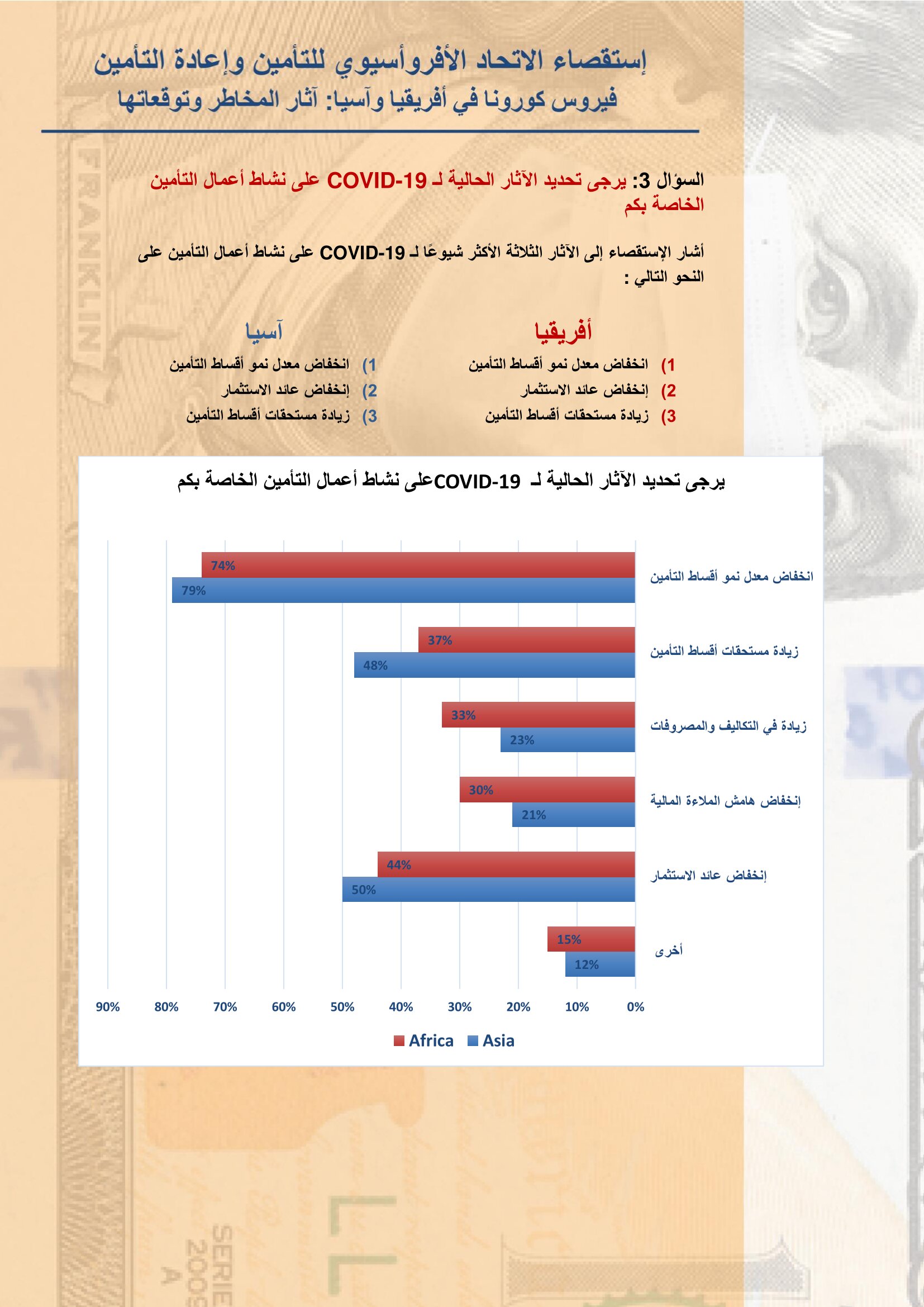 الإتحاد الأفروآسيوي للتأمين يعلن نتائح استقصاء عن آثار مخاطر وتداعيات كورونا على الصناعة بواسطة أموال الغد 15 يونيو 2020 | 1:14 م كتب أموال الغد 15 يونيو 2020 | 1:14 م النشر FacebookTwitterPinterestLinkedinWhatsappTelegramEmail 31 أعلن الإتحاد الأفروأسيوي للتأمين وإعادة التأمين عن نتائح البحث الاستقصائي الذي أجراه الإتحاد على نحو 35 سوق تأميني في قارتي أفريقيا وأسيا، حول آثار مخاطر وتداعيات فيروس كورونا على صناعة التأمين بهما والتوقعات المستقبلية في ظل استمرار هذه الجائحة. وأوضح الإتحاد أن جائحة فيروس كورونا تسببت بتغيير أنماط الحياة اليومية، ويواجه العالم الآن اختبارًا غير مسبوق، مضيفاً أن معظم الشركات والمؤسسات قد تأثرت بشكل كبير، لذلك قام الاتحاد بإجراء إستقصاء لمعرفة وفهم مدى تأثير فيروس كورونا على أسواق التأمين وتوقعات مديري شركات التأمين للأشهر القادمة. إقرأ أيضاً الرقابة المالية تُخطر شركات وساطة التأمين بضرورة موافاتها بتشكيل مجالس الإدارة وتحديد العضو المستقل جهاز مدينة المنيا الجديدة يطرح مناقصة للتأمين على معداته وسياراته الرئيس التنفيذي لكورونا: مصر مركز إنتاج إقليمي.. والكفاءات المحلية أساس التنافسية وتابع “للوصول إلى تحديد التأثير الحالي والمتوقع للوباء على أعمال التأمين في إفريقيا وآسيا ، قمنا بتحليل ما يقرب من 82 ردًا من 35 دولة ، من خلال إستقصاء خاص يتكون من 4 أسئلة متعددة الإختيارات أجريناه مع قادة صناعة التأمين في القارتين”. وقد نصت نتائج الإستقصاء على التالي:- اللينك المختصرللمقال: https://amwalalghad.com/4cg8 الاتحاد الافرو آسيويتأمينكورونا