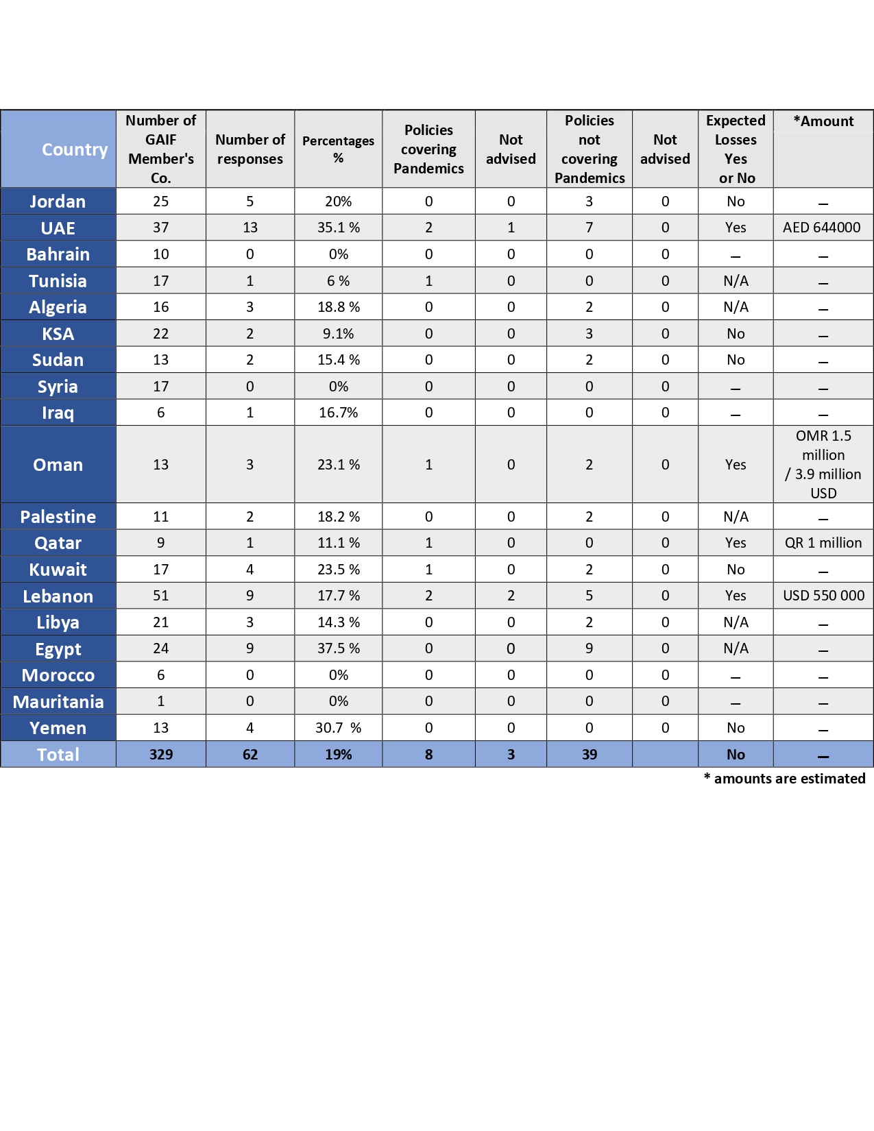 الاتحاد العربي للتأمين يعلن نتائج استبيان حول تأثير جائحة كورونا على الشركات الأعضاء بواسطة الزهراء مصطفى 18 يونيو 2020 | 6:24 م كتب الزهراء مصطفى 18 يونيو 2020 | 6:24 م النشر FacebookTwitterPinterestLinkedinWhatsappTelegramEmail 59 قامت الأمانة العامة للاتحاد العام العربي للتأمين بنشر نتائج الاستبيان، الذي قامت بإعداده وتوزيعه على اعضاء الاتحاد محاولة من خلاله الوقوف على الوضع الراهن جراء جائحة فيروس الكورونا وتداعياته على شركات التأمين. وقد تمكن الاتحاد خلال شهري ابريل ومايو 2020 الحصول على عدد من الأجوبة لتقييم التغطيات وآثار الوباء على الشركات العربية من جهة وحث الشركات بضرورة أخذ إجراءات استباقية لمعرفة التأثير المالي المرتقب لجهة الخسائر. إقرأ أيضاً شركات التأمين تسدد تعويضات تتخطى 18 مليار جنيه خلال الربع الثالث من العام 30.9 مليار جنيه حصيلة أقساط شركات التأمين خلال الربع الثالث من 2025 وزير الزراعة يوقع اتفاقية تجديد استضافة مصر للمركز الدولي للأسماك كما أوضحت الأمانة العامة للاتحاد العام العربي للتأمين أن هذه النتائج لا تمثل كل أطياف الاسواق العربية. وقد بين التقرير الصادر عن الاتحاد العام العربي للتأمين أن عملية مسح كل الأضرار وتقييم الكُلفة الحقيقية ستأخذ وقتا طويلا بسبب المنازعات القضائية واستمرار الوباء. وأظهرت نتائج الاستبيان حصول الإتحاد على ردود 37.5% من إجمالي شركات التأمين الاعضاء في الاتحاد من السوق المصرية بواقع 9 شركات، وجاءت ردود هذه الشركات بنحو 3 شركات أفادت ان عقود التأمين المباشر او إعادة التأمين لا تغطي الأوبئة، وشركة واحدة تكون التغطية حسب البوليصة، و6 شركات لا تتضمن وثائق إيقاف العمل بها تغطية الأوبئة ولم تتسلم مطالبات. وجاءت نتائج الاستبيان كاملة كالتالي:- اللينك المختصرللمقال: https://amwalalghad.com/37ek أوبئةالاتحاد العربي للتأمينشركات التأمينكورونامصر