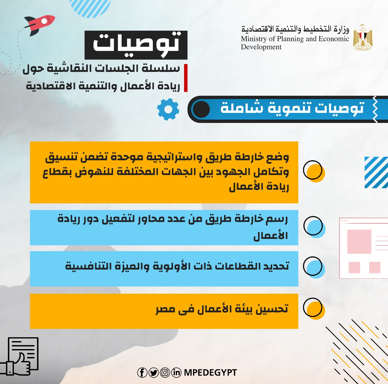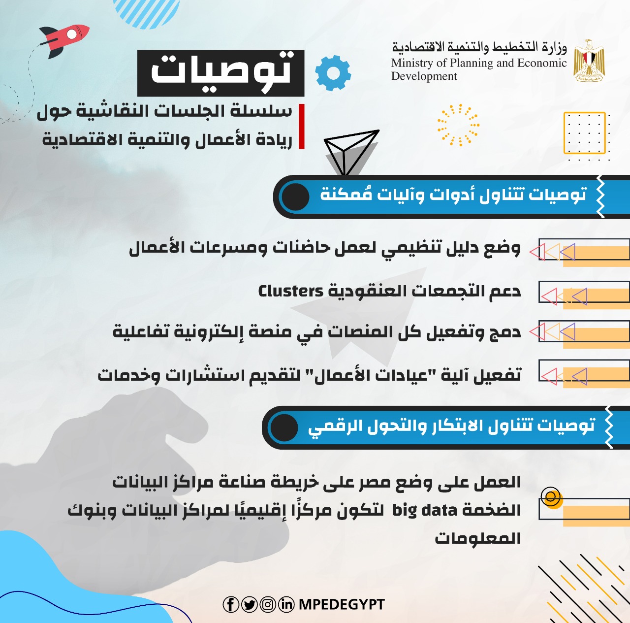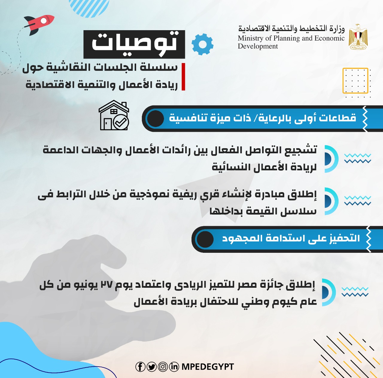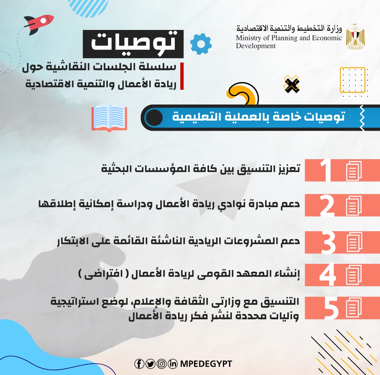 وزارة التخطيط تصدر توصيات الجلسات النقاشية حول ريادة الأعمال والتنمية الاقتصادية بواسطة إسلام عبد الحميد 6 يوليو 2020 | 10:26 ص كتب إسلام عبد الحميد 6 يوليو 2020 | 10:26 ص الدكتورة هالة السعيد النشر FacebookTwitterPinterestLinkedinWhatsappTelegramEmail 73 أعلنت وزارة التخطيط والتنمية الاقتصادية ممثلة فى مشروع رواد 2030 التوصيات النهائية لسلسة الجلسات النقاشية المنعقدة عبر خاصية الفيديو كونفرانس حول “ريادة الأعمال والتنمية الاقتصادية” وهى السلسة التي انطلقت الأسبوع الماضي؛ لمدة ثمانية أيام متصلة، برعاية وحضور الدكتورة هالة السعيد وزيرة التخطيط والتنمية الاقتصادية، وبمشاركة نخبة من الوزراء والمتخصصين فى مجال ريادة الأعمال. وفي هذا الإطار، أشارت الدكتورة هالة السعيد إلى تكليف الوزارة بتطوير ودعم قطاع ريادة الأعمال والابتكار، والعمل على زيادة مساهمته في التنمية الاقتصادية الشاملة والمستدامة، وذلك وفقًا لما تضمنه قرار رئيس مجلس الوزراء، بشأن الاختصاصات والمهام المنوطة بوزارة التخطيط والتنمية الاقتصادية على المستويين: التخطيط، والتنمية الاقتصادية. إقرأ أيضاً «التخطيط» تترأس اجتماعًا تحضيريًا للجنة المصرية–الأذرية المشتركة للتعاون الاقتصادي وزيرة التخطيط تشهد إطلاق الموقع الإلكتروني الجديد لجهاز التعبئة والإحصاء كجوك: نعمل على تسهيل الإجراءات وتخفيف الأعباء الضريبية وتوضيح الرؤية لدى المستثمرين وأكدت السعيد أن ريادة الأعمال تؤدى دورًا مهمًا في الاقتصاديات العالمية، كونها من أبرز محركات النمو الاقتصادي التي تساهم في توفير فرص العمل وتنويع مصادر الدخل وتحفز الاقتصاد بمشروعات جديدة صغيرة للشباب وتستقبل أيضًا فئات فى المجتمع مثل الشباب والمرأة وغيرها لتصبح قوة اجتماعية منتجة ومحفزة. وقد نتج عن كل جلسة من جلسات أسبوع “ريادة الأعمال والتنمية الاقتصادية” عدد من التوصيات في مجالات: الصناعة، والتعليم، والتحول الرقمي، والابتكار، ودعم المرأة. وتمثلت التوصيات الخاصة بالعملية التعليمية في العمل علي تعزيز التنسيق بين كافة المؤسسات البحثية: لزيادة فاعلية الإستفادة من براءات الاختراع والأبحاث المتاحة وتطبيقاتها الصناعية المختلفة كأداة لتعظيم دور المشروعات الريادية والابتكارية على المستوى القومي، إلى جانب دراسة إطلاق مبادرة نوادي ريادة الأعمال على المراحل الدراسية ما قبل الجامعية. وتعزيز مشاركتها في مختلف الأنشطة الداعمة لريادة الاعمال بين طلاب المدارس، بالإضافة إلى دعم المشروعات الريادية الناشئة القائمة علي الابتكار في مجال تطوير التطبيقات وتحسين الخدمات فى قطاع التعليم لتشجيع البرامج التعليمية عن بُعد، والذي فرضته الأزمة الراهنة، علي أن تستهدف مختلف المراحل الدراسية، وخاصة التي تستخدم تقنيات مبتكرة، كالواقع المعزز والافتراضي، وتطبيقات الذكاء الاصطناعي، إنشاء المعهد القومى لريادة الاعمال (افتراضي( بحيث يتم من خلاله تقديم حزم متنوعة من البرامج التدريبة المٌعتمدة دوليًا في مجال ريادة الأعمال، ويضم في مجلس إدارته أعضاء ممثلين عن الجهات التى تقدم برامج تدريبية وتأهيلية في هذا القطاع، لضمان الجودة والكفاءة والتنسيق، وكذا فاعلية ومردود البرامج المقدمة. وتطرقت التوصيات إلى القطاعات الأولى بالرعاية ذات ميزة تنافسية حيث أوصت الجلسات بتشجيع التواصل الفعال بين رائدات الأعمال والجهات الداعمة لريادة الأعمال النسائية سواء جهات حكومية أو خاصة، وجهات تمويلية أو مؤسسات مالية، علاوة على إطلاق منصة مخصصة لهذا الغرض، وذلك من أجل دعم التنمية الاحتوائية وتحقيق الدمج الاجتماعي للمرأة وذلك نظرًا للمعوقات التي تواجه ريادة الأعمال النسائية والتي تحول دون إقامة واستمرارية المشروعات الريادية من قبل النساء، وهو ما ينعكس على ترتيب مصر في مؤشرات التقارير الدولية الذي نطمح لتحسينه، كما أوصت الجلسات بإطلاق مبادرة لإنشاء قري ريفية نموذجية: من خلال الترابط فى سلاسل القيمة بداخلها، وبد
