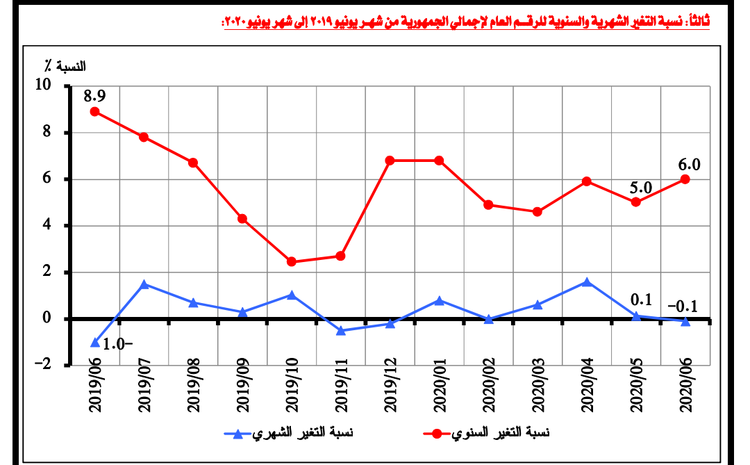 التضخم الشهري في مصر ينخفض 0.1% في يونيو مدفوعا بتراجع اللحوم والخضروات بواسطة سناء علام 9 يوليو 2020 | 8:06 ص كتب سناء علام 9 يوليو 2020 | 8:06 ص صورة ارشيفية النشر FacebookTwitterPinterestLinkedinWhatsappTelegramEmail 12 كشف الجهاز المركزي للتعبئة العامة والإحصاء عن انخفاض الرقم القياسي العام لأسعار المستهلكين لإجمالي الجمهورية خلال يونيو الماضي ليسجل 107.5 نقطة مسجلا تراجعا قدره 0.1% مقارنة بشهر مايو 2020 الذي سجل 107.7 نقطة. وأرجع أسباب هذا الانخفاض إلى تراجع أسعار اللحوم والدواجن بنسبة 5.6%، والخضروات بنسبة 5.5%، والأسماك والمأكولات البحرية بنسبة 2.9%. وتراجعت أسعار الألبان والجبن والبيض بنسبة 1.9%، والحبوب والخبز بنسبة 0.6%، وكذلك تكلفة خدمات الفنادق بنحو 0.3%. وذكر الجهاز أن ذلك التراجع جاء بالرغم من ارتفاع تكلفة خدمات مرضى العيادات الخارجية بنسبة 1.8% خلال يونيو، والملابس الجاهزة بنسبة 1.2%، والدخان بنسبة 4.2%. كما ارتفعت أسعار الوجبات الجاهزة في يونيو بنسبة 0.9%، وكذلك منتجات العناية الشخصية بنسبة 1%. وكان معدل التضخم الشهري في مصر قد ارتفع خلال مايو بنسبة 0.1% مقارنة بشهر ابريل الذي زاد بنسبة 1.6%، وكذلك في مارس بنسبة 0.6%، بينما كان مستقرا في شهر فبراير عند 105.2 نقطة، وهو نفس المعدل في شهر يناير 2020 والذي كان مرتفعا بنسبة 0.8% مقارنة بشهر ديسمبر 2019. إقرأ أيضاً بنمو 39%.. إيرادات السكك الحديدية في مصر تقارب 8 مليارات جنيه خلال 10 أشهر «الإحصاء»: 2.7% انخفاضا بإصابات العمل.. وقطاع الصناعات التحويلية في الصدارة «الإحصاء»: 2.5% انخفاض في عقود الزواج.. وارتفاع حالات الطلاق 3.1% خلال 2024 اللينك المختصرللمقال: https://amwalalghad.com/730p التضخمالتضخم الشهريالجهاز المركزي للتعبئة العامة والإحصاءالخضرواتالعيادات الخارجيةاللحومالملابس الجاهزةخدمات الفنادقمعدل التضخم