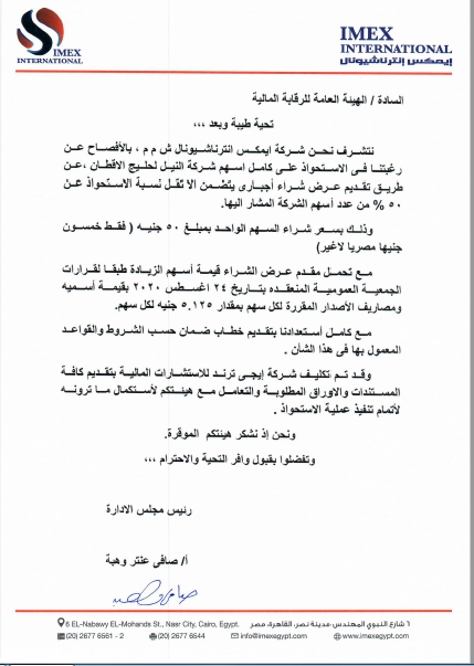 إيميكس انترناشونال تقدم عرض شراء إجباري بنسبة 50% على النيل لحليج الأقطان بواسطة أموال الغد 26 أغسطس 2020 | 7:33 م كتب أموال الغد 26 أغسطس 2020 | 7:33 م الرقابة المالية النشر FacebookTwitterPinterestLinkedinWhatsappTelegramEmail 93 خاطبت شركة إيميكس إنترناشونال، الهيئة العامة للرقابة المالية برغبتها في الاستحواذ على كامل أسهم شركة النيل لحليج الأقطان، عن طريق تقديم عرض شراء إجباري يتضمن ألا تقل نسبة الاستحواذ عن 50%. وبحسب إفصاح الهيئة المرسل للبورصة اليوم، فإن العرض يشمل شراء حتى عدد 52.992 مليون سهم بنسبة 100% من أسهم شركة النيل لحليج الأقطان بسعر نقدي 50 جنيه، وبشرط الا تقل نسبة الاستحواذ عن 50% من أسهم رأسمال الشركة. إقرأ أيضاً الرقابة المالية تكشف مواعيد اكتتاب زيادة رأسمال «توسع للتخصيم» 7.1 مليار جنيه تعويضات مسددة من شركات تأمينات الممتلكات و7.5 مليار بنشاط «الحياة» إسلام عزام: المرحلة المقبلة تركز على تعميق دور الأنشطة المالية غير المصرفية في دعم الاقتصاد وأوضحت أن ذلك وفقاً لأحكام الباب الثاني عشر من اللائحة التنفيذية لقانون سوق رأس المال رقم 95 لسنة 1992. اللينك المختصرللمقال: https://amwalalghad.com/r23b النيل لحليج الأقطانالهيئة العامة للرقابة الماليةعرض شراء إجباري