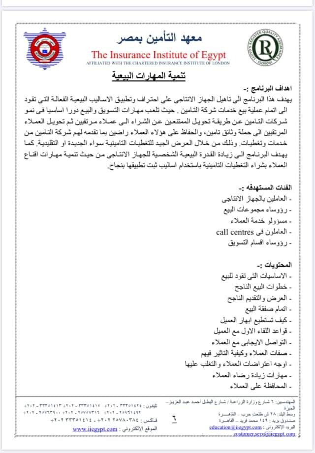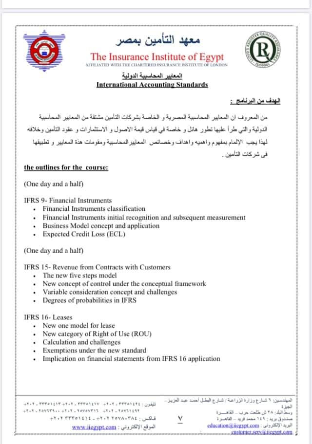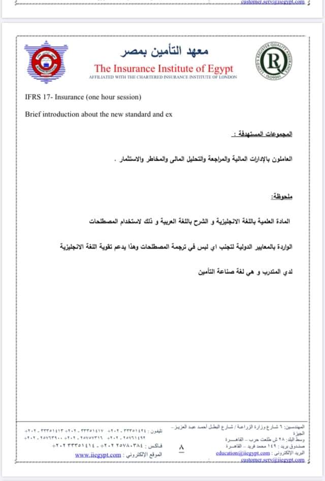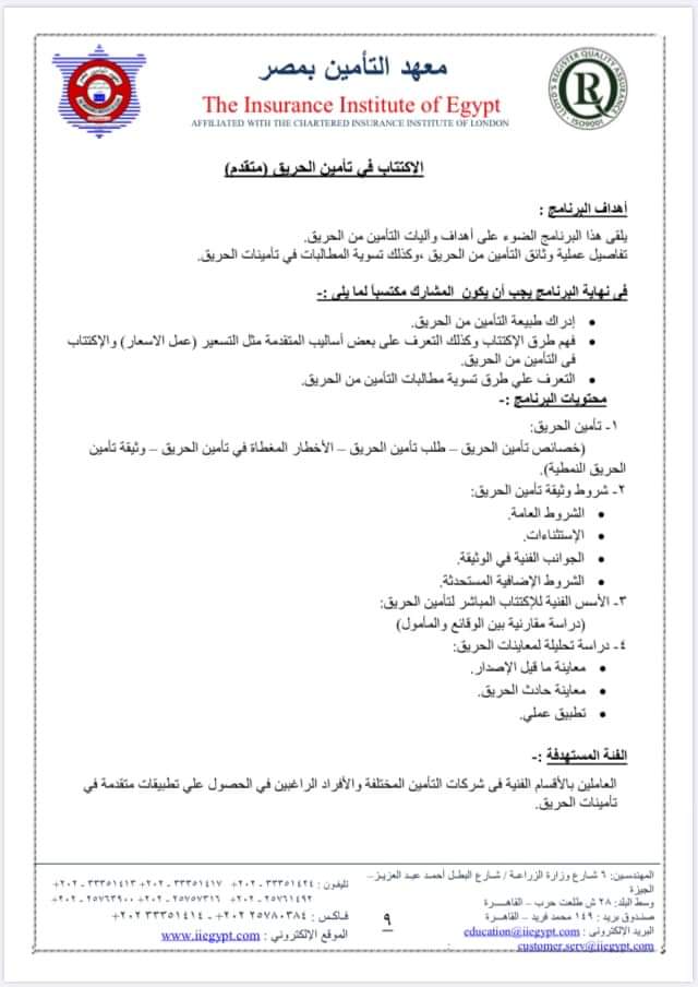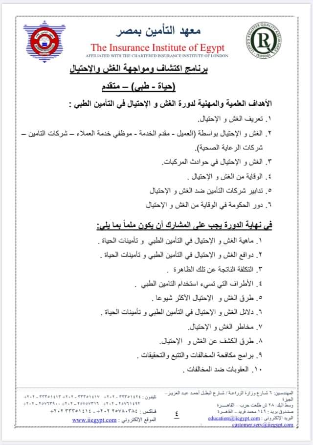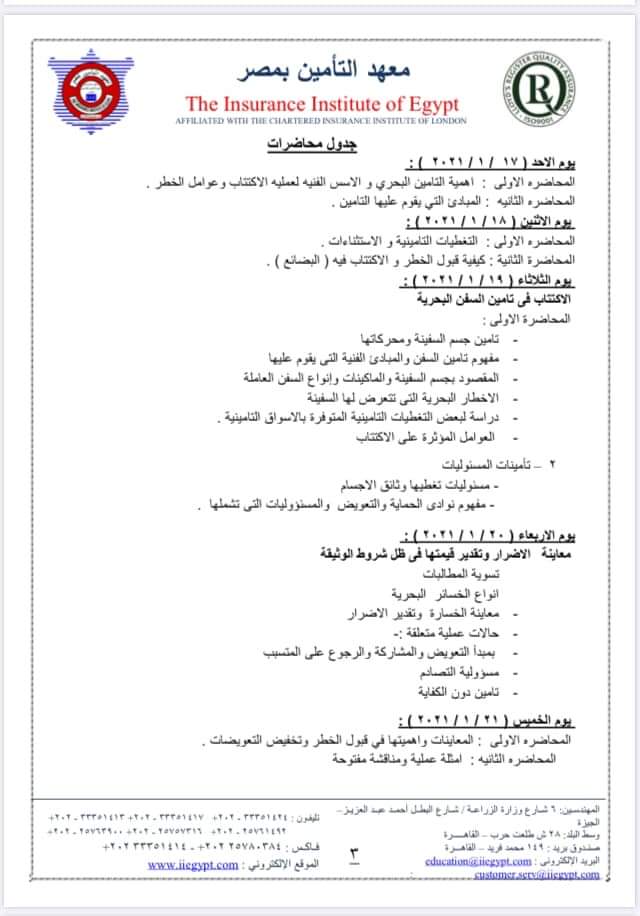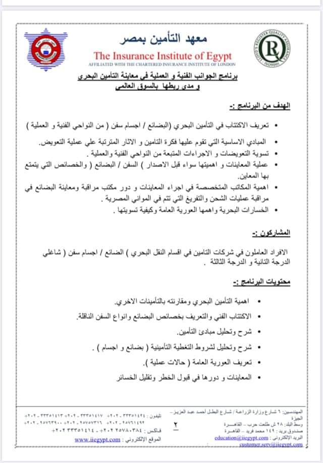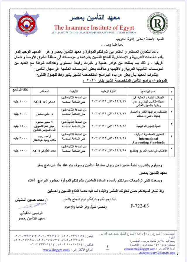 معهد التأمين المصري يعقد 5 دورات تدريبية خلال يناير..تعرف على تفاصيلها بواسطة أموال الغد 4 يناير 2021 | 12:01 م كتب أموال الغد 4 يناير 2021 | 12:01 م النشر FacebookTwitterPinterestLinkedinWhatsappTelegramEmail 206 يعتزم معهد التأمين المصري عقد 5 دورات تدريبية خلال شهر يناير الجاري، يقدمها نخبة متميزة من رجال صناعة التأمين، وخاطب المعهد من خلال رئيسه التنفيذي محمد حسين الدشيش، شركات التأمين العاملة بالسوق لتلقي ترشيحاتهم لحضور البرامج. وتشمل قائمة البرامج التدريبية دورات عن الجوانب الفنية والعملية في معاينة التأمين البحري ومدى ربطها بالسوق العالمي، بجانب دورة إكتشاف ومواجهه الغش والإحتيال ( حياة – طبي)، وتنمية المهارات البيعية، وكذلك المعايير المحاسبية الدولية، بالإضافة إلى دورة الإكتتاب في تأمين الحريق. إقرأ أيضاً مد مهلة زيادة رؤوس أموال شركات الوساطة والمعاينة والاستشارات في التأمين 6 أشهر لتسجل 141 شركة و25 فرعًا.. الرقابة المالية تضيف 3 كيانات لقائمة معيدي التأمين الرقابة المالية تمنح شركة هندية رخصة ممارسة وساطة إعادة التأمين لغير المقيمين وإليكم التفاصيل الكاملة للدورات التدريبيبة وهي كالتالي:- اللينك المختصرللمقال: https://amwalalghad.com/dcd0 إعادة التأمينالاحتيال في تأمينات الحياةالتأمين الطبيدورات تدريبيةمعهد التأمين بمصر