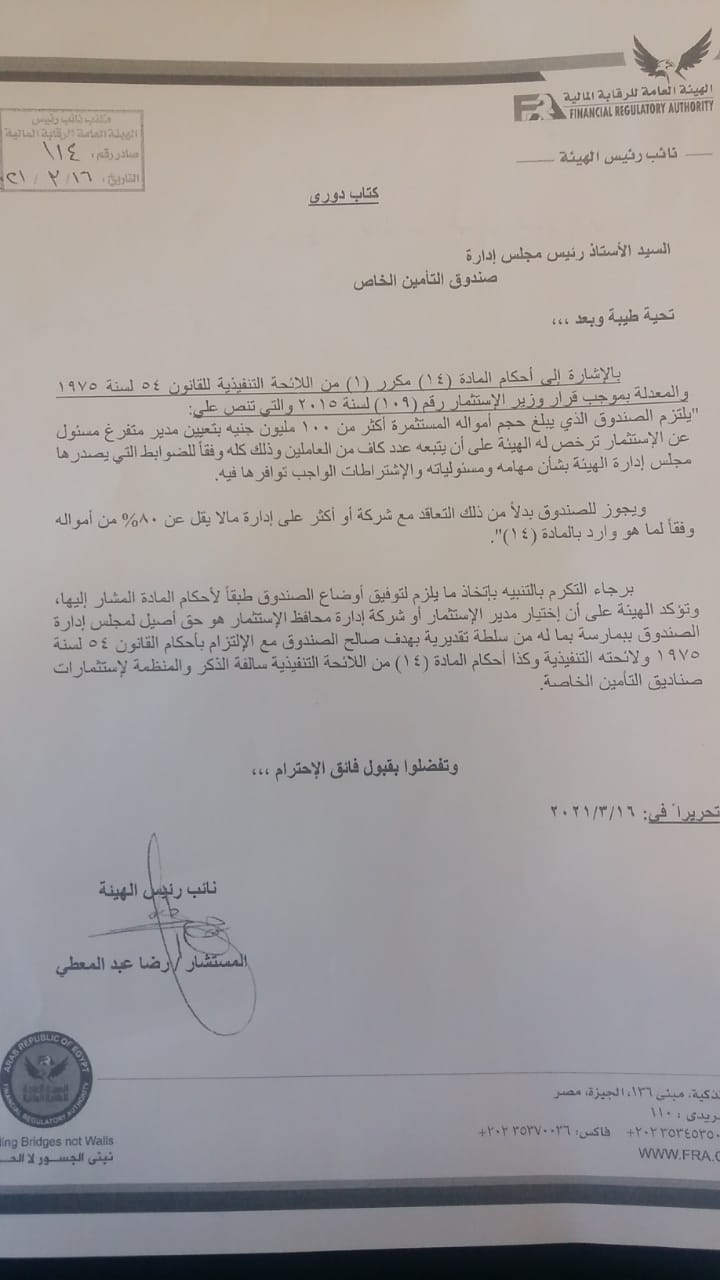 «الرقابة المالية» تخاطب صناديق التأمين الخاصة بتوفيق أوضاعها لإدارة محافظها الاستثمارية بواسطة إسلام عبد الحميد 17 مارس 2021 | 1:10 م كتب إسلام عبد الحميد 17 مارس 2021 | 1:10 م النشر FacebookTwitterPinterestLinkedinWhatsappTelegramEmail 80 أصدر المستشار رضا عبدالمعطي، نائب رئيس مجلس إدارة الهيئة العامة للرقابة المالية، كتاب دوري يخاطب به صناديق التأمين الخاصة للتنبيه بضرورة توفيق أوضاعها مع المادة 14 مكرر 1 من اللائحة التنفيذية للقانون 54 لسنة 1975؛ والمعدلة بموجب قرار وزير الاستثمار رقم 109 لسنة 2015. وتنص هذه المادة السابق ذكرها على أنه يلتزم الصندوق الذي يبلغ حجم أمواله المستثمرة أكثر من 100 مليون جنيه بتعيين مدير متفرغ مسئول عن الاستثمار ترخص له الهيئة على أن يتبعه عدد كافٍ من العاملين، وذلك كله وفقًا للضوابط التي يصدرها مجلس إدارة الهيئة بشأن مهامه ومسئولياته والاشتراطات الواجب توافرها فيه، ويجوز للصندوق بدلًا من ذلك التعاقد مع شركة أو أكثر على إدارة ما لا يقل عن 80% من أمواله وفقًا لما هور وارد بالمادة 14. إقرأ أيضاً الرقابة lلمالية تقلص مهلة تقديم خطط استيفاء التزامات شركات التأمين إلى 3 أشهر مهلة 6 أشهر لمكاتب تمثيل شركات التأمين و«الإعادة» الأجنبية لتوفيق أوضاعها للعمل بالسوق المصرية مهلة 6 أشهر لشركات التأمين لتوفيق أوضاعها مع الضوابط الجديدة لنشاط «متناهي الصغر» وأكد عبدالمعطي في كتابه الدوري على أن تعيين مدير استثمار أو شركة إدارة محافظ الاستثمار حق أصيل لمجلس إدارة الصندوق بممارسة بما له من سلطة تقديرية بالاختيار، بهدف صالح الصندوق مع الالتزام بأحكام القانون 54 لسنة 1975 ولائحته التنفيذية وكذلك أحكام المادة 14 من اللائحة التنفيذية، والمنظمة لاستثمارات صناديق التأمين الخاصة. وكان قد أعلن المستشار رضا عبدالمعطي، نائب رئيس الهيئة العامة للرقابة المالية، في تصريحات صحفية سابقة، أن الاستراتيجية القومية للخدمات المالية غير المصرفية المعدة من قبل الهيئة العامة للرقابة المالية تهدف رفع صافى استثمارات شركات التأمين إلى حوالى 150 مليار جنيه بحلول عام 2022، مقابل 86 مليار جنيه خلال عام 2017، وأن يصل حجم صناديق التأمين الخاصة إلى 100 مليار جنيه مقارنة بمبلغ 61 مليار جنيه خلال العام الماضي. وترتبط صناديق التأمين الخاصة بقطاع التأمين، والتي تُعد شكل آخر لأدوات الادخار، وهي عبارة عن أنظمة تأمينية يتم تسجيلها بحيث تصبح منفصلة عن الجهة المنشأة لها، ويتم تكوينها لأغراض منح مزايا لمجموعه من العاملين بالجهة المنشأة، وتكون في شكل مزايا تأمينيه أو معاشات إضافية أو مزايا اجتماعية أو رعاية صحية. وينظم قانون صناديق التأمين الخاصة رقم 54 لسنة 1975 ولائحته التنفيذية نشاط صناديق التامين الخاصة في مصر، وفى إطار تطوير القواعد المنظمة لصناديق التأمين الخاصه تم تعديل اللائحة التنفيذية للقانون عام 2015. اللينك المختصرللمقال: https://amwalalghad.com/0dpg استثماراتالهيئة العامة للرقابة الماليةرضا عبدالمعطيسوق المالصناديق التأمين الخاصة
