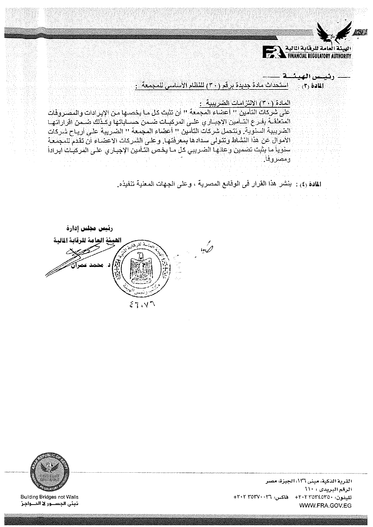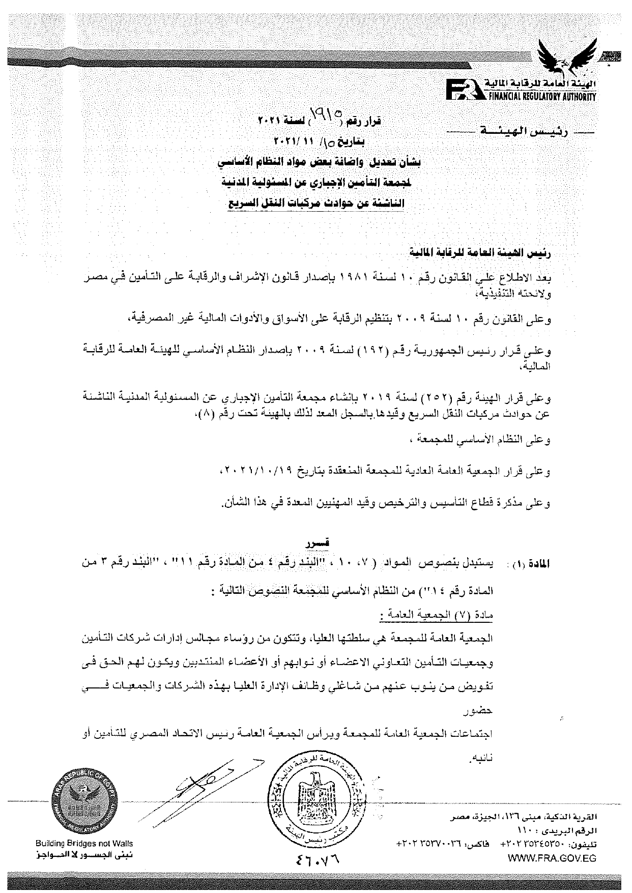 ننشر نص قرار تعديل وإضافة بعض مواد النظام الأساسي لمجمعة التأمين الإجباري على السيارات بواسطة إسلام عبد الحميد 25 نوفمبر 2021 | 12:36 م كتب إسلام عبد الحميد 25 نوفمبر 2021 | 12:36 م صورة ارشيفية النشر FacebookTwitterPinterestLinkedinWhatsappTelegramEmail 79 أصدرت الهيئة العامة للرقابة المالية قراراً رقم 1915 لسنة 2021 بشأن تعديل وإضافة بعض مواد النظام الأساسي لمجمعة التأمين الإجباري عن المسئولية المدنية الناشئة عن حوادث النقل السريع. وتضمن القرار – الذي حصل «أموال الغد» على نسخة منه – على إضافة مادة جديدة برقم (30) بالنظام الأساسي للمجمعة والتي تختص بالإلتزامات الضريبية لشركات التأمين الأعضاء المجمعة. إقرأ أيضاً شركات التأمين تسدد تعويضات تتخطى 18 مليار جنيه خلال الربع الثالث من العام 30.9 مليار جنيه حصيلة أقساط شركات التأمين خلال الربع الثالث من 2025 ارتفاع رؤوس الأموال المصدرة لشركات التمويل العقاري إلى 9.7 مليار جنيه بنهاية سبتمبر ونصت هذه المادة على الآتي:- “على شركات التأمين (أعضاء المجمعة) أن تثبت كل ما يخصها من الإيرادات والمصروفات المتعلقة بفرع التأمين الإجباري على المركبات ضمن حساباتها وكذلك ضمن إقراراتها الضريبية السنوية؛ وتتحمل شركات التأمين (أعضاء المجمعة) الضريبة على أرباح شركات الأموال عن هذا النشاط وتتولى سدادها بمعرفتها، وعلى الشركات الأعضاء أن تقدم للمجمعة سنوياً ما يثبت تضمين وعائها الضريبي كل ما يخص التأمين الإجباري على المركبات إيراداً ومصروفاً”. كما تضمن قرار الهيئة إضافة البند رقم 10 للمادة رقم 5 من النظام الأساسي للمجمعة والذي نص على “تتولى المجمعة احتساب المخصصات الفنية لوثائق التأمين الإجباري على المركبات من خلال احتساب (مخصص الأخطار السارية – مخصص التعويضات تحت التسوية) وفقاً للأسس الفنية والقانونية المتعارف عليها لحساب تلك المخصصات والتي يتم مراجعتها واعتمادها من قبل الخبير الإكتواري للمجمعة، على أن تقوم المجمعة بموافاة الهيئة العامة للرقابة المالية وشركات التأمين (أعضاء المجمعة) بهذه المخصصات بصفة دورية (ربع سنوية – سنوية) دون إدراجها بالقوائم المالية للمجمعة. وإليكم النص الكامل لقرار تعديل وإضافة بعض مواد النظام الأساسي لمجمعة التأمين الإجباري عن المسئولية المدنية الناشئة عن حوادث النقل السريع:- اللينك المختصرللمقال: https://amwalalghad.com/jf82 التأمين على السياراتالهيئة العامة للرقابة الماليةمجمعة التأمين الإجباري