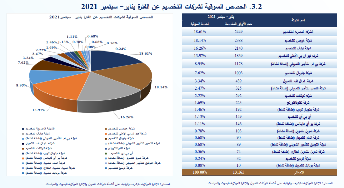 ننشر حجم نشاط أكبر 10 شركات تخصيم بالسوق بنهاية سبتمبر 2021 بواسطة تقى حاتم 5 ديسمبر 2021 | 12:43 م كتب تقى حاتم 5 ديسمبر 2021 | 12:43 م الهيئة العامة للرقابة المالية النشر FacebookTwitterPinterestLinkedinWhatsappTelegramEmail 49 كشفت الهيئة العامة للرقابة المالية عن الشركات المقيدة بمزاولة نشاط التخصيم في أحدث تقرير لها، حيث تتصدر شركة «المصرية» للتخصيم قائمة الشركات العاملة في قطاع التخصيم خلال أول 9 أشهر، لتبلغ حجم الأوراق المخصمة الخاصة بها 2.44 مليار جنيه بنهاية سبتمبر 2021، بحصة سوقية قدرها 18.6% من إجمالي حجم الأوراق المخصمة لشركات القطاع. وتأتي شركة «هيرمس» للتخصيم في المركز الثاني، حيث بلغ حجم الأوراق المخصمة للشركة 2.38 مليار جنيه بنهاية سبتمبر 2021، بحصة سوقية قدرها 18.1% من إجمالي حجم الأوراق المخصمة للشركات العاملة بالقطاع. إقرأ أيضاً الرقابة المالية تصدر 4 قرارات لتعزيز تنظيم تمويل المشروعات الصغيرة ومتناهية الصغر تابعة لـ«ماريدايف» توقع عقود بقطر بقيمة 10 ملايين دولار شركات التأمين تسدد تعويضات تتخطى 18 مليار جنيه خلال الربع الثالث من العام واستحوذت شركة «درايف» للتخصيم على المركز الثالث من قائمة شركات قطاع التخصيم، ليبلغ حجم الأوراق المخصمة للشركة 2.14 مليار جنيه بنهاية سبتمبر 2021، بحصة سوقية قدرها 16.2% من إجمالي حجم الأوراق المخصمة لشركات القطاع. ويليها شركة «كيو ان بي الأهلي» للتخصيم في المركز الرابع، ليبلغ حجم الأوراق المخصمة للشركة 1.83 مليار جنيه بنهاية سبتمبر 2021، بنسبة 13.9% من إجمالي حجم الأوراق المخصمة للشركات العاملة بقطاع التخصيم. وتأتي شركة «بي ام» للتأجير التمويلي “إضافة نشاط” في المركز الخامس، حيث يبلغ حجم الأوراق المخصمة للشركة 1.17 مليار جنيه بنهاية سبتمبر 2021، بنسبة قدرها 8.9% من إجمالي حجم الأوراق المخصمة للشركات العاملة في قطاع التخصيم. وتحتل شركة «جلوبال» للتخصيم المركز السادس، ليبلغ حجم الأوراق المخصمة للشركة 1.003 مليار جنيه بنهاية سبتمبر 2021، بحصة سوقية قدرها 7.6% من إجمالي حجم الأوراق المخصمة لشركات القطاع. ويليها شركة «ام ال اف» للتمويل في المركز السابع، حيث بلغ حجم الأوراق المخصمة للشركة 439 مليون جنيه بنهاية سبتمبر 2021، بحصة سوقية قدرها 3.3% من إجمالي حجم الأوراق المخصمة لشركات القطاع. وتأتي شركة «التعمير» للتأجير التمويلي “إضافة نشاط” في المركز الثامن، حيث بلغ حجم الأوراق المخصمة للشركة 325 مليون جنيه بنهاية سبتمبر 2021، بحصة سوقية قدرها 2.4% من إجمالي حجم الأوراق المخصمة للشركات العاملة بقطاع التخصيم. وتحتل شركة «كونتكت» للتخصيم المركز التاسع، حيث بلغ حجم الأوراق المخصمة للشركة 292 مليون جنيه بنهاية سبتمبر 2021، بحصة سوقية قدرها 2.2% من إجمالي حجم الأوراق المخصمة للشركات العاملة بالقطاع. ويليها شركة «تكنوفاكتورنج» في المركز العاشر، حيث بلغ حجم الأوراق المخصمة 223 مليون جنيه بنهاية سبتمبر 2021، بحصة سوقية قدرها 1.6% من إجمالي حجم الأوراق المخصمة للشركات العاملة بالقطاع. وسجل إجمالي حجم الأوراق المخصمة للشركات العاملة بقطاع التخصيم 13.16 مليار جنيه خلال أول 9 أشهر، مقابل 6.20 مليار جنيه بنهاية سبتمبر 2020، بمعدل نمو 112.1% وعلى صعيد شهر سبتمبر فقط، لازالت شركة «المصرية» تحافظ على صدارة قائمة الشركات العاملة بالقطاع، ليبلغ حجم الأوراق المخصمة للشركة في شهر سبتمبر 444 مليون جنيه، بحصة سوقية قدرها 29.1% من إجمالي حجم الأوراق المخصمة للشركات العاملة بقطاع التخصيم. اللينك المختصرللمقال: https://amwalalghad.com/e9qa الهيئة العامة للرقابة الماليةقطاع التخصيم
