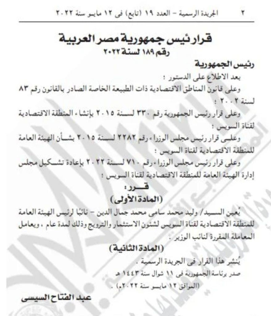 الرئيس السيسي يُعين وليد جمال الدين نائباً لرئيس المنطقة الاقتصادية لقناة السويس لشئون الاستثمار بواسطة سناء علام 15 مايو 2022 | 1:28 م كتب سناء علام 15 مايو 2022 | 1:28 م النشر FacebookTwitterPinterestLinkedinWhatsappTelegramEmail 20 أصدر الرئيس عبدالفتاح السيسي رئيس الجمهورية قراراً جمهورياً رقم 189 لسنة 2022، بتعيين وليد جمال الدين نائباً لرئيس الهيئة العامة للمنطقة الاقتصادية لقناة السويس لشئون الاستثمار والترويج وذلك لمدة عام، من تاريخ صدور القرار الذي نشر بالجريدة الرسمية في عددها رقم 19. من جهته، أعرب المهندس يحيى زكي رئيس المنطقة الاقتصادية لقناة السويس عن اعتزازه بكامل الدعم الذي تتلقاه المنطقة الاقتصادية لقناة السويس من القيادة السياسية، والذي يسهم بدوره في تعظيم دور ومجهودات الهيئة الاقتصادية لقناة السويس في استقطاب الاستثمارات المتنوعة؛ لدعم الاقتصاد المصري. إقرأ أيضاً الرئيس السيسي: مخزون السلع الأساسية في مصر آمن ويكفي لفترات مطمئنة الرئيس السيسي يؤكد على ضرورة استخدام الدولة لكل آليات ضبط السوق لتفادي غلاء الأسعار وزير الخارجية ينقل رسالة من الرئيس السيسي لرئيس وزراء العراق بشأن خفض التصعيد الإقليمي يذكر أن وليد جمال الدين كان يشغل منصب المدير التنفيذي للهيئة الاقتصادية لقناة السويس على مدار العامين الماضيين ،لما يتمتع به من خبرات في مجال إدارة الاستثمار، وقد تم تعيينه من قبل مجلس إدارة المنطقة الاقتصادية إيماناً بضخ دماء جديدة وتمكين الكوادر الشبابية بالهيئة، في إطار استراتيجية الدولة المصرية بتمكين الشباب. اللينك المختصرللمقال: https://amwalalghad.com/l202 اقتصادية قناة السويسالرئيس السيسيوليد جمال الدين