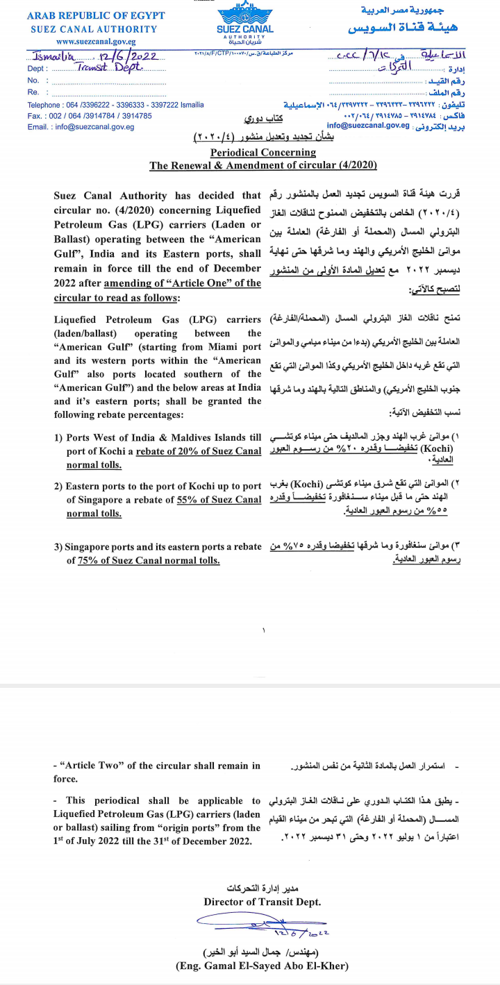 مع تخفيضها 5%.. قناة السويس تجدد الخصومات الممنوحة لناقلات الغاز البترولي المسال لنهاية 2022 بواسطة سناء علام 14 يونيو 2022 | 5:51 ص كتب سناء علام 14 يونيو 2022 | 5:51 ص قناة السويس النشر FacebookTwitterPinterestLinkedinWhatsappTelegramEmail 6 قررت هيئة قناة السويس تجديد العمل بالمنشور رقم (4/ 2020) الخاص بالتخفيض الممنوح لناقلات الغاز البترولي المسال (المحملة أو الفارغة) العاملة بين موانئ الخليج الأمريكي والهند وما شرقها حتى نهاية ديسمبر 2022 مع تعديل المادة الأولى من المنشور، مع خفضها بنسبة 4 و 5%. وأوضحت في كتابها الدوري بشأن منشور (4/2020) بتاريخ 12 يونيو الجاري، أنه سيتم منح ناقلات الغاز البترولي المسال (المحملة/الفارغة) العاملة بين الخليج الأمريكي (بدءا من ميناء ميامي والموانئ التي تقع غربه داخل الخليج الأمريكي وكذا الموانئ التي تقع جنوب الخليج الأمريكي) والمناطق التالية بالهند وما شرقها نسب التخفيض الآتية: إقرأ أيضاً قناة السويس: حصاد 840 طنا من أسماك البلطي واللوت خلال موسم 2025/ 2026 بنمو 17.5%.. إيرادات قناة السويس تقارب ملياري دولار منذ بداية العام المالي حتى الآن قرارات اقتصادية وتنموية جديدة من مجلس الوزراء لدعم الاستثمار والبنية التحتية موانئ غرب الهند وجزر المالديف حتى ميناء كوتشي (Kochi) تخفيضا وقدره 20% من رسوم العبور العادية، بدلا من 24% في منشور 4/ 2020 الموانئ التي تقع شرق ميناء كوتشى (Kochi) بغرب الهند حتى ما قبل ميناء سنغافورة تخفيضاً وقدره 55% من رسوم العبور العادية، بدلا من 60% في منشور 4/ 2020 موانئ سنغافورة وما شرقها تخفيضا وقدره 75% من رسوم العبور العادية، وهي نفس نسبة التخفيض في منشور 4/ 2020. وتوضح المادة الثانية شروط تطبيق المنشور: تتقدم الشركة المشغلة التي ترغب في الاستفادة من المنشور بطلب عن طريق التوكيل الملاحي قبل الإبحار من ميناء القيام محددا به بيانات السفينة وميناء القيام وتاريخ الإبحار وميناء الوصول والميعاد المتوقع لوصــــول السفينة للقناة وحالة السفينة (محملة/فارغة) ونوع وكمية الشحنة. ( وفق النموذج المرفق) عدم توقف السفينة في أي ميناء فيما بين مينائي القيام والوصول لأغراض تجارية ، وفى حالة التوقف في أي ميناء بين مينائي القيام والوصول لأغراض غير تجارية يتم موافاتنا بشهادة بأسباب التوقف من سلطات ميناء التوقف أو السلطات المختصة. يتم سداد رسوم عبور السفينة كاملة عند العبور على ان يتم تسوية التخفيض بعد استكمال جميع المستندات المطلوبة خلال سنة ميلادية تبدأ من اليوم التالي لتاريخ العبور علي أن ترسل دفعة واحدة. المستندات المطلوبة لتسوية قيمة التخفيض: أ)”شهادة قيام ” من أخر ميناء قيام موضحا بها تاريخ القيام وكمية ونوع الشحنة عند الإبحار معتمده من سلطة الميناء أو السلطات المختصة. ب) “شهادة وصول” من أول ميناء وصول موضحا بها تاريخ الوصول وكمية ونوع الشحنة عند الوصول معتمده من سلطة الميناء أو السلطات المختصة. ج) مطالبة من السادة المشغلين برد قيمة التخفيض موضحا بها رقم المنشور، ميناء القيام و تاريخ الإبحار منه، ميناء الوصول و تاريخ الوصول إليه، تاريخ العبور، نسبة التخفيض المطلوب ردها، اسم توكيل عبور السفينة لقناة السويس الواجب رد قيمة التخفيض إليه وذلك مع الإقرار بعدم التوقف بين ميناء القيام وميناء الوصول لأىغرض تجارى . 5) في حالة عدم استكمال المستندات في المــدة المحددة أو توقف السفينة في أي ميناء بين مينائي القيام والوصول لأي غرض تجاري أو الإخلال بأي شرط من شروط المنشور المذكورة عاليه يتم إلغاء قيمة التخفيض الممنوح للسفينة وفق هذا المنشور. ويطبق هذا الكتاب الدوري على ناقلات الغاز البترولي المسال (المحملة أو الفارغة) التي تبحر من ميناء القيام اعتباراً من 1 يوليو 2022 وحتى 31 ديسمبر 2022. اللينك المختصرللمقال: https://amwalalghad.com/r0pn أخبار قناة السويسخصومات قناة السويسرسوم عبور ناقلات الغاز البترولي المسال لقناة السويسناقلات الغاز البترولي المسالهيئة قناة السويس