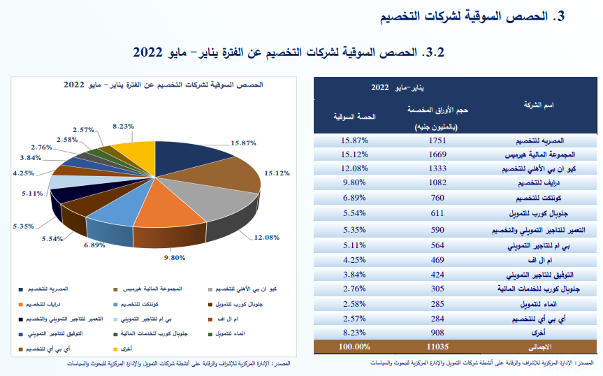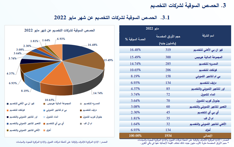 المصرية للتخصيم تستحوذ على 15.87% من إجمالي حجم النشاط خلال 5 أشهر بواسطة تقى حاتم 28 يوليو 2022 | 10:50 ص كتب تقى حاتم 28 يوليو 2022 | 10:50 ص النشر FacebookTwitterPinterestLinkedinWhatsappTelegramEmail 34 كشفت الهيئة العامة للرقابة المالية عن الحصص السوقية لشركات التخصيم خلال أول 5 أشهر من عام 2022. وينشر «أموال الغد» الحصص السوقية لأكبر 10 شركات عاملة في القطاع من حيث حجم الأوراق المخصمة، لتتصدر شركة المصرية للتخصيم قائمة الشركات العاملة في السوق بحصة سوقية قدرها 15.87%، وتسجل حجم الأوراق المخصمة بالشركة 1.7 مليار جنيه. إقرأ أيضاً التوفيق للتأجير التمويلي تعلن إتمام الإصدار الأول لسندات توريق بقيمة 1.8 مليار جنيه تابعة لـ«ماريدايف» توقع عقود بقطر بقيمة 10 ملايين دولار شركات التأمين تسدد تعويضات تتخطى 18 مليار جنيه خلال الربع الثالث من العام وتأتي المجموعة المالية هيرميس في المركز الثاني بحصة سوقية قدرها 15.12% من إجمالي حجم الأوراق المخصمة، بمبلغ قدره 1.6 مليار جنيه، يليها كيو ان بي الأهلي للتخصيم في المركز الثالث بوزن نسبي 12.08%، وتبلغ حجم الأوراق المخصمة للشركة 1.3 مليار جنيه. كما تحتل شركة درايف للتخصيم المركز الرابع بوزن نسبي 9.8% من إجمالي حجم الأوراق المخصمة، بمبلغ 1.08 مليار جنيه، يليها كونتكت للتخصيم بنسبة 6.89%، وتصل حجم الأوراق المخصمة للشركة إلى 760 مليون جنيه خلال 5 أشهر. وفي المركز السادس، تأتي جلوبال كورب للتمويل من حيث حجم الأوراق المخصمة بحصة سوقية 5.54%، بمبلغ قدره 611 مليون جنيه، يليها شركة التعمير للتأجير التمويلي والتخصيم بوزن نسبي 5.35%، بمبلغ قدره 590 مليون جنيه. كما تأتي شركة بي ام للتأجير التمويلي في المركز الثامن بوزن نسبي 5.11% من إجمالي حجم الأوراق المخصمة، بمبلغ 564 مليون جنيه، يليها ام ال اف بحصة سوقية قدرها 4.25%، وتسجل حجم الأوراق المخصمة للشركة 469 مليون جنيه خلال 5 أشهر. وفي المركز العاشر تأتي شركة التوفيق للتأجير التمويلي بحصة سوقية قدرها 3.84% من إجمالي حجم الأوراق المخصمة، بمبلغ قدره 424 مليون جنيه. وبلغ إجمالي حجم الأوراق المخصمة 11.034 مليار جنيه خلال الـ5 أشهر الأولى من عام 2022، مقابل 6.085 مليار جنيه خلال الفترة ذاتها من عام 2021، بمعدل نمو قدره 81.3%. كما سجل إجمالي حجم الأوراق المخصمة مع حق الرجوع 6.857 مليار جنيه خلال الـ5 أشهر الأولى من عام 2022، مقابل 3.107 مليار جنيه خلال الفترة ذاتها من عام 2021، بزيادة قدرها 120.7%. وبلغ إجمالي حجم الأوراق المخصمة بدون حق الرجوع 4.177 مليار جنيه خلال الـ5 أشهر الأولى من عام 2022، مقابل 2.977 مليار جنيه خلال الفترة ذاتها من عام 2021، بمعدل نمو قدره 40.3%. وقد بلغت حجم الأرصدة المدينة بنشاط التخصيم 11.58 مليار جنيه بنهاية مايو 2022 بعدد عملاء (الشركات المحيلة) بلغ 478 عميل، مقابل 7.756 مليار جنيه بعدد عملاء 381 بنهاية مايو 2021. وحول حجم النشاط خلال مايو 2022، بلغ إجمالي حجم الأوراق المخصمة خلال هذا الشهر نحو 1.934 مليار جنيه، مقابل 1.315 مليار جنيه خلال مايو 2021، بمعدل نمو قدره 47%. كما سجل إجمالي حجم الأوراق المخصمة مع حق الرجوع 1.236 مليار جنيه خلال مايو 2022، مقابل 63.7 مليون جنيه خلال مايو 2021. وبلغ إجمالي حجم الأوراق المخصمة بدون حق الرجوع 697 مليون جنيه خلال مايو 2022، مقابل 1.252 مليار جنيه خلال الفترة ذاتها من عام 2021، بمعدل تراجع 44.3%. اللينك المختصرللمقال: https://amwalalghad.com/xwg6 الشركة المصرية للتخصيمالقطاع المالي غير المصرفيالهيئة العامة للرقابة الماليةنشاط التخصيم