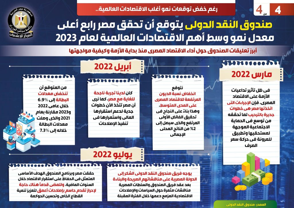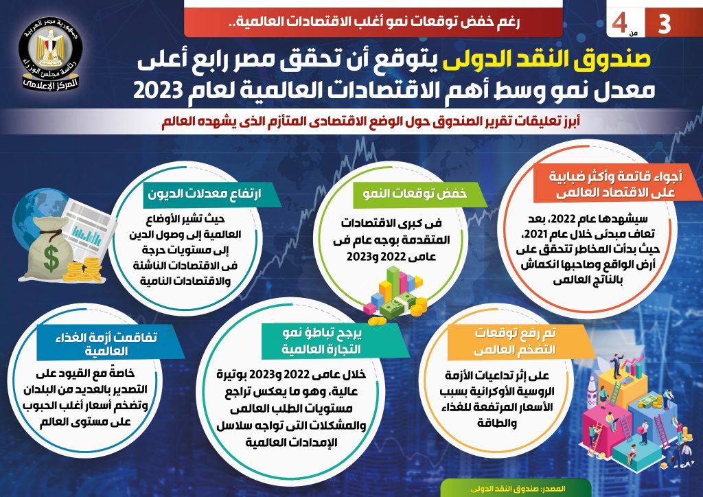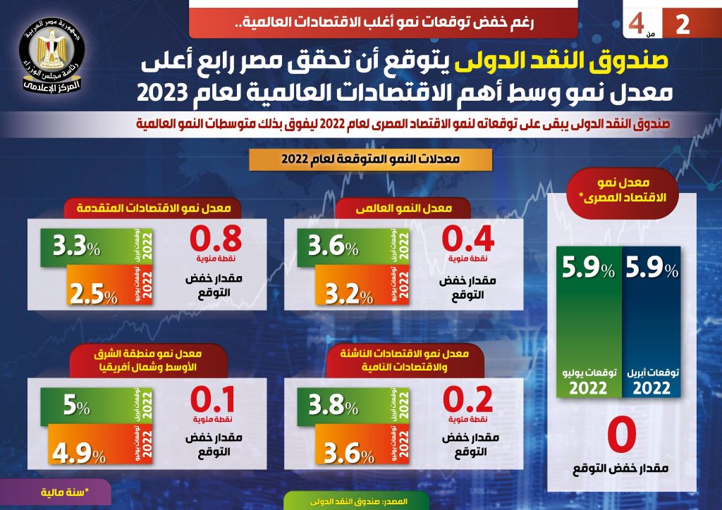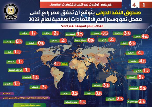 صندوق النقد يتوقع تحقيق مصر رابع أعلى معدل نمو خلال 2023 (انفوجراف) بواسطة إيناس شعبان 31 يوليو 2022 | 11:47 ص كتب إيناس شعبان 31 يوليو 2022 | 11:47 ص صندوق النقد الدولي النشر FacebookTwitterPinterestLinkedinWhatsappTelegramEmail 66 نشر المركز الإعلامي لمجلس الوزراء تقريراً تضمن إنفوجرافات تسلط الضوء على توقعات صندوق النقد الدولي بتحقيق مصر رابع أعلى معدل نمو وسط أهم الاقتصادات العالمية لعام 2023، وذلك على الرغم من خفض توقعات نمو أغلب الاقتصادات العالمية. وأشار التقرير إلى إبقاء صندوق النقد الدولي على توقعاته لنمو الاقتصاد المصري لعام 2021/2022، ليفوق بذلك متوسطات النمو العالمية، وذلك بمعدل نمو 5.9% في توقعات يوليو 2022، وهي نفس توقعات الصندوق لمعدل نمو الاقتصاد المصري خلال شهر أبريل من نفس العام. إقرأ أيضاً الاقتصاد المصري يسجّل أعلى معدل نمو فصلي منذ أكثر من 3 سنوات بـ5.3% في الربع الأول من 2026/2025 معيط: تطوير وتنوع منتجات التأمين الطبي ضرورة لمواجهة المخاطر الصحية المقبلة صندوق النقد يرحب بخطة السلام في غزة: «إنجاز كبير» لتحقيق الاستقرار الاقتصادي بالمنطقة وأورد التقرير توقعات صندوق النقد الدولي لمعدلات النمو في يوليو 2022 مقارنة بأبريل 2022، حيث خفض الصندوق توقعاته لمعدل النمو العالمي بمقدار 0.4 نقطة مئوية، ليسجل 3.2% مقارنة بـ 3.6%، فضلاً عن خفض توقعاته لمعدل نمو الاقتصادات المتقدمة بمقدار 0.8 نقطة مئوية، ليسجل 2.5% مقارنة بـ 3.3%. واستكمل التقرير توقعات الصندوق في يوليو 2022 مقارنة بأبريل 2022، حيث خفض الصندوق توقعاته لمعدل نمو الاقتصادات الناشئة والاقتصادات النامية بمقدار 0.2 نقطة مئوية، ليسجل 3.6% مقارنة بـ 3.8%، بينما خفض توقعاته لمعدل نمو منطقة الشرق الأوسط وشمال أفريقيا بمقدار 0.1 نقطة مئوية، ليسجل 4.9% مقارنة بـ 5%. وأورد التقرير توقعات صندوق النقد الدولي لمعدلات نمو عام 2023، حيث توقع أن تسجل مصر نمواً بمعدل 4.8%، وأن تسجل الهند نمواً بمعدل 6.1%، وباكستان بمعدل 3.5%، وإيران بمعدل 2%، وذلك عام 2022/2023. ورصد التقرير توقعات الصندوق لمعدلات نمو أهم الاقتصادات العالمية خلال عام 2023، حيث متوقع أن يسجل 5.2% بإندونيسيا، و5% بالفلبين، و4.7% بماليزيا، و4.6% بالصين، و4% بتايلاند، و3.9% بكازاخستان، و3.7% بالسعودية، و3.5% بتركيا، و3.2% بنيجريا، و3% بالأرجنتين، و2.2% باستراليا، و2.1% بكوريا الجنوبية. واستكمالاً لما سبق، فقد توقع الصندوق أن يسجل معدل النمو خلال عام 2023 بكل من إسبانيا وبولندا 2%، وأن يسجل 1.8% بكندا، و1.7% باليابان، و1.4% بجنوب أفريقيا، و1.2% بالمكسيك، و1.1% بالبرازيل، و1% بكل من فرنسا وهولندا والولايات المتحدة، و0.8% بألمانيا، و0.7% بإيطاليا، و0.5% بالمملكة المتحدة. وفي سياق متصل، توقع الصندوق أن تسجل روسيا انكماشاً بمعدل 3.5%، علماً بأن الاقتصادات المختارة تمثل ما يقرب من 83% من الناتج المحلي العالمي. وتطرق التقرير إلى أبرز تعليقات صندوق النقد الدولي حول أداء الاقتصاد المصري منذ بداية الأزمة وكيفية مواجهتها، مشيراً إلى ما ذكره في مارس 2022 بأن الإجراءات التي اتخذتها مصر تعد خطوات جديرة بالترحيب لما تحققه من توسع في الحماية الاجتماعية الموجهة لمستحقيها وتطبيق للمرونة في حركة سعر الصرف في ظل تأثير تداعيات الأزمة على الاقتصاد. كما أشار التقرير إلى توقع الصندوق في أبريل 2022، انخفاض نسبة الديون المرتفعة للاقتصاد المصري على المدى المتوسط، بناءً على النجاح في تحقيق الفائض الأولي المرتفع والذي سيصل إلى 2% من الناتج المحلي الإجمالي. كما أكد الصندوق في أبريل 2022 بأن لديه تجربة ناجحة للغاية مع مصر، مشدداً على أن مصر تتخذ الآن خطوات جدية لدعم استقرارها المالي واستمرارها في تنفيذ الإصلاحات، كما توقع أن تنخفض معدلات البطالة إلى 6.9% خلال عامي 2022 و2023 مقارنة بعام 2021، والذي وصلت معدلات البطالة خلاله إلى 7.3%. وفي يوليو 2022، وجه فريق صندوق النقد الدولي، وفقاً للتقرير، الشكر إلى الدولة المصرية على مناقشاتهم الصريحة والبناءة، وذلك بعد عقد فريق الصندوق والسلطات المصرية مناقشات مثمرة