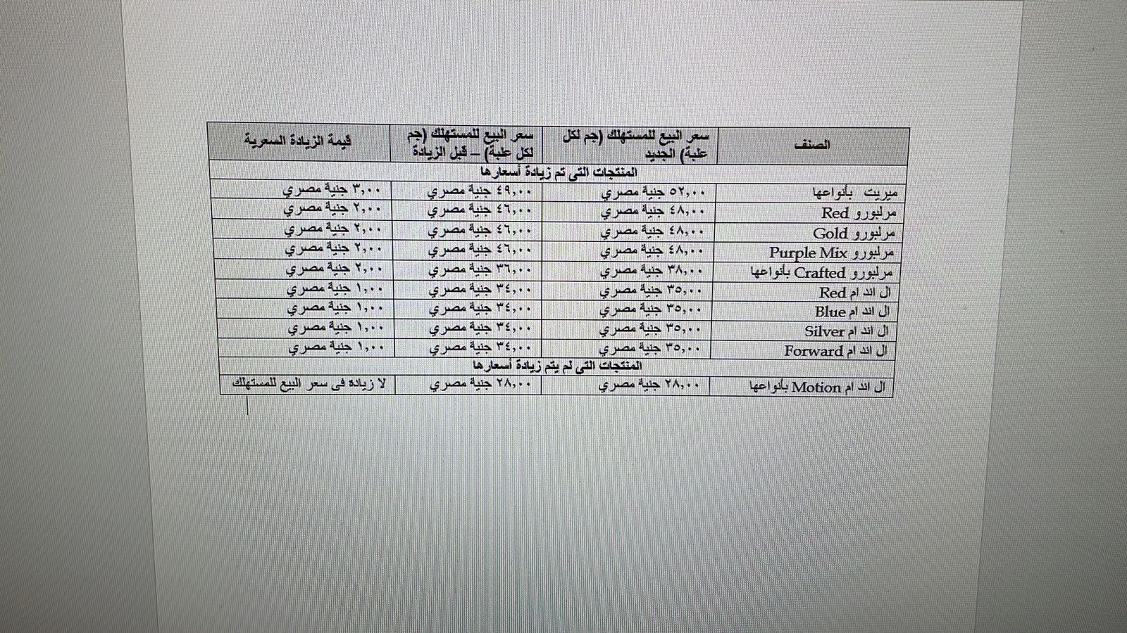 فيليب موريس ترفع أسعار منتجاتها في مصر.. و3 جنيهات زيادة في الميريت بواسطة هشام إبراهيم و سناء علام 6 سبتمبر 2022 | 6:18 م كتب هشام إبراهيم و سناء علام 6 سبتمبر 2022 | 6:18 م النشر FacebookTwitterPinterestLinkedinWhatsappTelegramEmail 95 قررت شركة فيليب موريس مصر، رفع سعر منتجاتها في مصر ابتداءا من غدا الأربعاء من السجائر “إل إم” بانواعها، والميريت والمارلبورو. وقال إبراهيم إمبابي رئيس شعبة السجائر باتحاد الصناعات، إن الشركة قررت رفع سعر السجائر الـ” “إل إم” بواقع جنيهًا للعلبة الواحدة، و 2 جنيه في مارلبورو، و 3 جنيهات في الميريت. إقرأ أيضاً منتجات بلا هوية تعني مخاطر صحية بلا حدود «كليوباترا» بسعر 44 جنيهًا..«إيسترن كومباني» تعلن أسعار سجائرها بالسوق المصرية «وينستون» تسجل 67 جنيها..«جي تي اي» ترفع أسعار سجائرها بالسوق المصرية وتشمل قائمة أسعار منتجات الشركة بحسب خطابها والذي حصل “أموال الغد” على نسخة منه الأتي :- إل إم أحمر: 35 جنيهًا. إل إم أزرق: 35 جنيهًا. إل إم فضي: 35 جنيهًا. إل إم Forward أصبحت 35 جنيها مارلبورو أحمر: 48 جنيهًا. مارلبورو دهبي: 48 جنيهًا. مارلبورو purple mix أصبحت 48 جنيهت مالبورو crafted بأنواعها: 38 جنيهًا. إل إم motion بأنواعها :28 جنيهًا. الميريت بأنوعها: 52 جنيها اللينك المختصرللمقال: https://amwalalghad.com/0lgy أسعار السجائرفيليب موريس