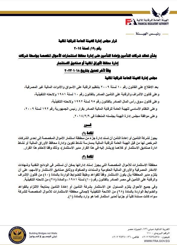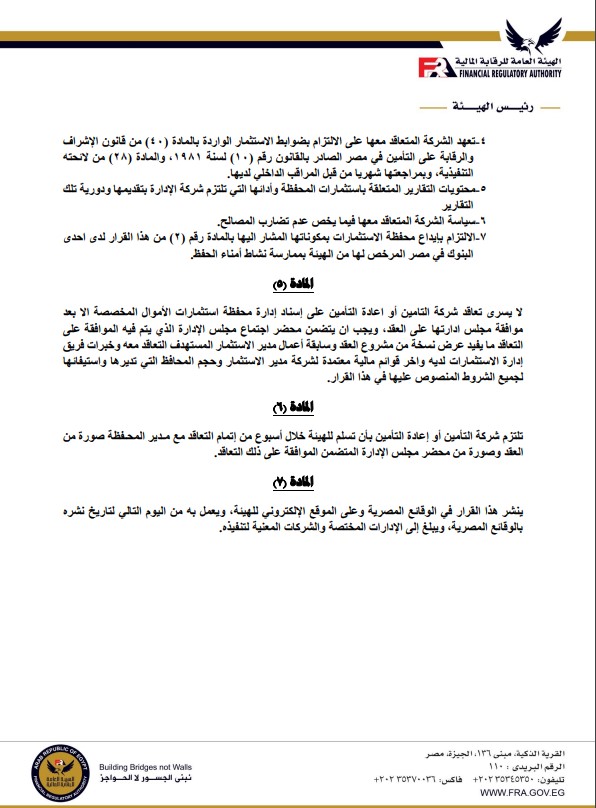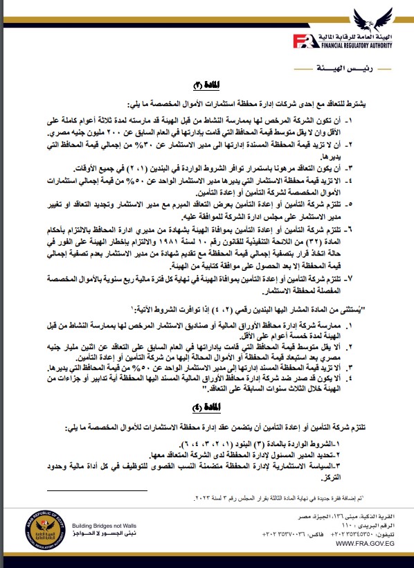 «الرقابة المالية» تقرر تعديل ضوابط تعاقد شركات التأمين على إدارة محافظ استثماراتها بواسطة إسلام عبد الحميد 30 يناير 2023 | 8:55 ص كتب إسلام عبد الحميد 30 يناير 2023 | 8:55 ص النشر FacebookTwitterPinterestLinkedinWhatsappTelegramEmail 145 قررت الهيئة العامة للرقابة المالية تعديل القرار رقم 19 لسنة 2014 بشأن تعاقد شركات التأمين وإعادة التأمين علي إدارة محافظ استثمارات الأموال المخصصة بواسطة شركات إدارة محافظ الأوراق المالية أو صناديق الاستثمار. وأصدر الدكتور محمد فريد، رئيس مجلس إدارة الهيئة، قراراً رقم 3 لسنة 2023 تضمن إضافة فقرة جديدة فى نهاية المادة الثالثة من قرار مجلس إدارة الهيئة المشار إليه أعلاه. إقرأ أيضاً «الرقابة المالية» تضيف 3 قنوات على تليجرام ضمن القائمة السلبية لمخالفة قوانينها قيد 3 شركات جديدة بسجل نشاط وساطة إعادة التأمين لغير المقيمين بمصر هيئة الرقابة المالية تمنح ثراء للوساطة في التأمين الموافقة على التأسيس ويكون نص هذه الفقرة كالتالي: “يستثنى من المادة المشار إليها البندان رقما (2 ، 4) إذا توافرت بعض الشروط منها ممارسة شركة إدارة محافظ الأوراق المالية أو صناديق الاستثمار المرخص لها بممارسة النشاط من قبل الهيئة لمدة خمسة أعوام على الأقل”. كما تضمنت الشروط ألا يقل متوسط قيمة المحافظ التى قامت بإدارتها فى العام السابق على التعاقد عن ملياري جنيه بعد استبعاد قيمة المحفظة أو الأموال المحالة إليها من شركة التأمين أو إعادة التأمين، وألا تزيد قيمة المحفظة المسند إدارتها إلى مديــر الاستثمار الواحـــد على (50%) من قيمة المحافظ التى يديرها، وألا يكون قد صدر ضد شركة إدارة محافظ الأوراق المالية المسند إليها المحفظة أية تدابير أو جزاءات من الهيئة خلال الثلاث سنوات السابقة على التعاقد. وجاء هذا القرار بعد الاطلاع على القانون رقم 10 لسنة 2009 بتنظيم الرقابة على الأسواق والأدوات المـالية غـير المصـرفية؛ وعلى قانون الإشراف والرقابة على التأمين الصادر بالقانون رقم 10 لسنة 1981 ولائحته التنفيذية؛ وعلى قانون سوق رأس المال الصادر بالقانون رقم 95 لسنة 1992 ولائحته التنفيذية؛ وعلى النظام الأساسـى للهيئة العامة للرقابـة المالية الصادر بقرار رئيس الجمهورية رقم 192 لسنة 2009. كما صدر القرار عقب الإطلاع على قرار مجلس إدارة الهيئة رقم 19 لسنة 2014 بشأن تعاقد شركات التأمين وإعادة التأمين على إدارة محافظ استثمارات الأموال المخصصة بواسطة شركات إدارة محافظ الأوراق المالية أو صناديق الاستثمار. اللينك المختصرللمقال: https://amwalalghad.com/veje استثمارات شركات التأمينالأوراق الماليةالهيئة العامة للرقابة الماليةشركات التأمينمحمد فريدهيئة الرقابة المالية