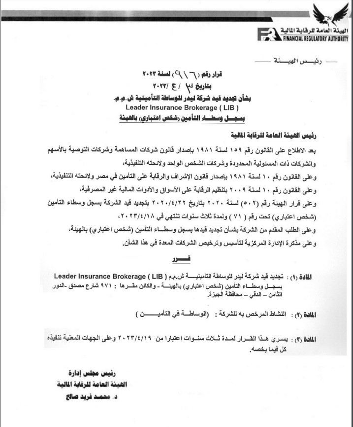 هيئة الرقابة المالية تجدد قيد «ليدر» بسجل شركات الوساطة التأمينية لمدة 3 سنوات بواسطة إسلام عبد الحميد 5 أبريل 2023 | 12:07 م كتب إسلام عبد الحميد 5 أبريل 2023 | 12:07 م النشر FacebookTwitterPinterestLinkedinWhatsappTelegramEmail 51 قرر الدكتور محمد فريد، رئيس مجلس إدارة الهيئة العامة للرقابة المالية تجديد قيد شركة ليدر للوساطة التأمينية بسجـل وسطاء التأمين (شخص اعتباري) بالهيئة. جاء ذلك وفقاً لقرار فريد الصادر برقم 916 لسنة 2023، والتي أوضح تجديد قيد شركة ليدر بسجل الهيئة العامة للرقابة المالية لشركات الوساطة التأمينية لمدة 3 سنوات اعتباراً من 19 إبريل 2023. إقرأ أيضاً العضو المنتدب لـ«عناية»: استراتيجية لزيادة المحفظة 15% وتعزيز الملاءة المالية خلال 2026 رئيس الرقابة المالية: خريطة جديدة للتأمين ترتكز على التحول الرقمي وتوسيع قاعدة المستفيدين قناة السويس لتأمينات الحياة تحقق 605.5 مليون جنيه أقساطًا وصافي أرباحها يتخطى 151 مليونًا وقد صدر القرار استناداً لما نص عليه القانون رقم 159 لسنة 1981 بإصدار قانون شركات المساهمة وشركات التوصية بالأسهم والشركات ذات المسئولية المحدودة وشركات الشخص الواحد ولائحته التنفيذية؛ وعلى القانون رقم 10 لسنة 1981 بإصدار قانون الإشراف والرقابة على التامين في مصر ولائحته التنفيذية. كما جاء القرار بناءً على القانون رقم 10 لسنة 2009 بتنظيم الرقابة على الأسواق والأدوات المالية غير المصرفية، وعلى قرار الهيئة رقم (502) لسنة 2020 بشأن قيد ليدر للوساطة التأمينية بسجل وسطاء التأمين (شخص اعتباري) برقم (71) ولمدة ثلاث سنوات تنتهي في 18 إبريل الجاري، وعلى الطلب المقدم من الشركة بشأن تجديد قيدها يسجل وسطاء التأمين (شخص اعتباري) بالهيئة، وعلى مذكرة الإدارة المركزية لتأسيس وترخيص الشركات المعدة في هذا الشأن. ويشار إلى أن نشاط الوساطة التأمينية هو تمثيل العميل أمام شركات التأمين بغرض الحصول على أنسب الشروط والأسعار ومعاونتهم فنياً، والحصول على تعويض عادل وتقديم كافة الاستشارات الفنية الخاصة بالوثيقة والتغطيات الصادرة لهم. ويذكر أنه قد رخصت الهيئة العامة للرقابة المالية لأول شركة بمزاولة نشاط الوساطة التأمينية في شهر فبراير 2009، ويصل عدد الشركات المزاولة لنشاطي وساطة التأمين وإعادة التأمين بالسوق المصرية حتى الآن 103 شركة. وكان قد أصدر مجلس إدارة الهيئة العامة للرقابة المالية، قراره رقم 114 لسنة 2021 بشأن ضوابط تنظيم عمل شركات الوساطة في التأمين والوساطة في إعادة التأمين، والتي أكد على عدم الإخلال بقرار مجلس إدارة الهيئة رقم 23 لسنة 2014 بشأن القواعد الحاكمة لممارسة نشاط وساطة التأمين داخل جمهورية مصر العربية، موضحا أن الضوابط الواردة بهذا القرار تسري في شأن تنظيم عمل شركات الوساطة في التأمين والوساطة في إعادة التأمين. وألزم القرار شركات الوساطة في التأمين أو الوساطة في إعادة التأمين بتوضيح خطتها في استخدام البرامج الإلكترونية والتطبيقات التكنولوجية في التسويق، وكذلك بيان طبيعة وسمات القطاعات التي تستهدف الشركة التعامل معها، مع تقدير حجم الأقساط التي يمكن الحصول عليها من كل قطاع وعمولاته ونسبتهما إلى إجمالي إيرادات الشركة. اللينك المختصرللمقال: https://amwalalghad.com/6qs9 الهيئة العامة للرقابة الماليةشركات الوساطةشركات الوساطة التأمينيةليدر للوساطة التأمينيةهيئة الرقابة المالية