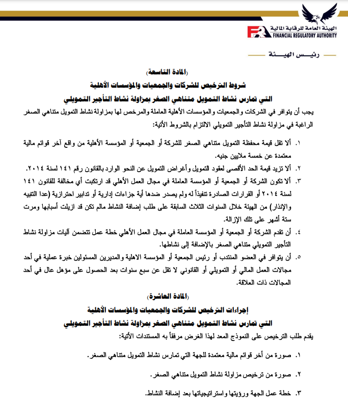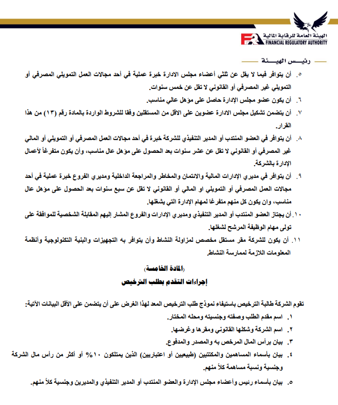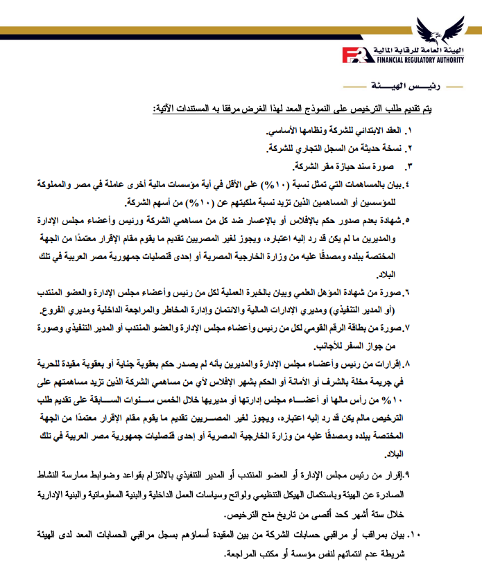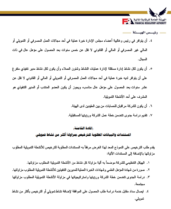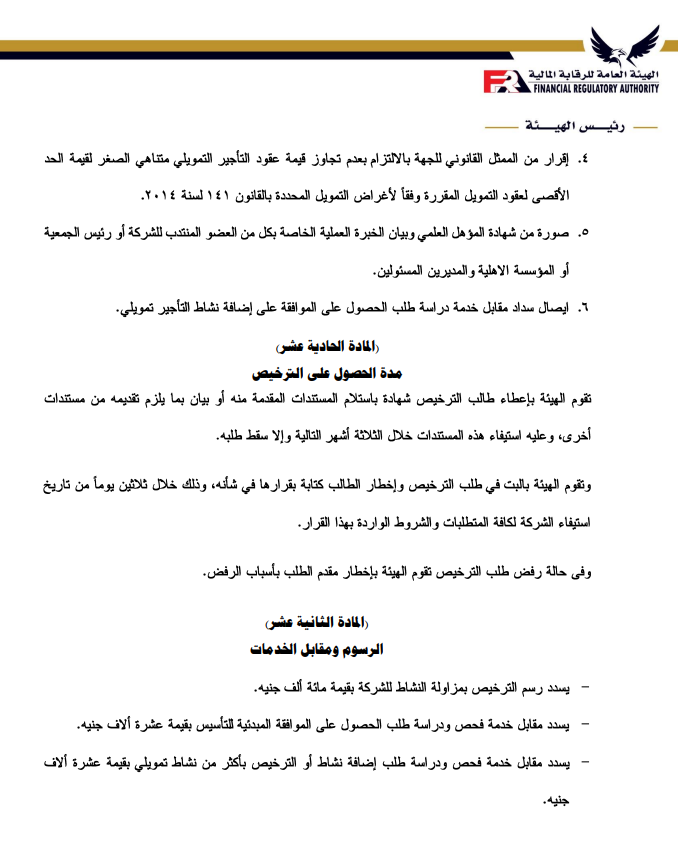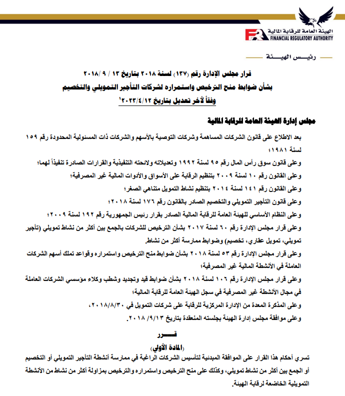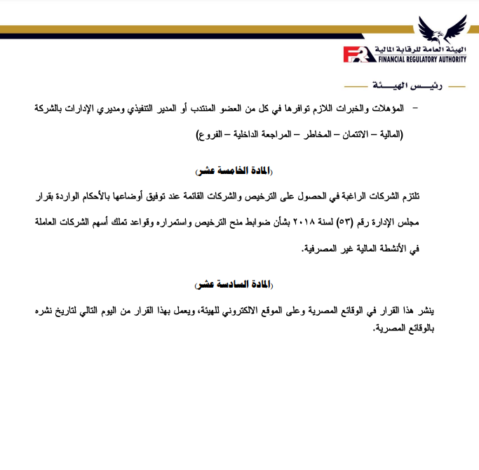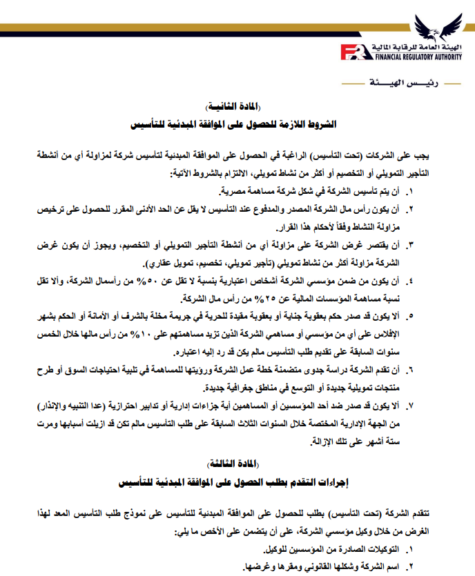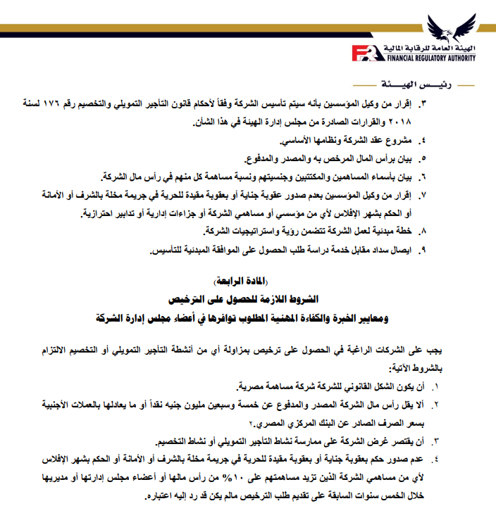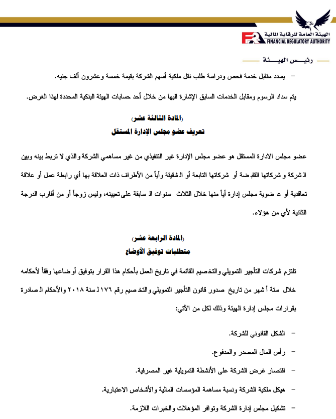ننشر تعديلات ضوابط منح الترخيص واستمراره لشركات التأجير التمويلي والتخصيم بواسطة تقى حاتم 3 مايو 2023 | 10:02 ص كتب تقى حاتم 3 مايو 2023 | 10:02 ص التأجير-التمويلي إنكوليس النشر FacebookTwitterPinterestLinkedinWhatsappTelegramEmail 304 أصدرت الهيئة العامة للرقابة المالية، قرار بشأن ضوابط منح الترخيص واستمراره لشركات التأجير التمويلي والتخصيم وفقاً لأخر تعديل، بعد الإطلاع على قانون التأجير التمويلي والتخصيم الصادربالقانون رقم 176 لعام 2018. وتتضمن المادة الأولى في أن تسري أحكام هذا القرار على الموافقة المبدئية لتأسيس الشركات الراغبة في ممارسة أنشطة التأجير التمويلي أو التخصيم أو الجمع بين أكثر من نشاط تمويلي، وكذلك على منح الترخيص واستمراره والترخيص بمزاولة أكثر من نشاط من الأنشطة التمويلية الخاضعة لرقابة الهيئة. إقرأ أيضاً عبير صالح مستشارًا لرئيس هيئة الرقابة المالية لشئون التأمين انضمام رئيس هيئة الرقابة المالية لعضوية المجموعة الوزارية الاقتصادية وزير الشباب والرياضة ورئيس هيئة الرقابة المالية يبحثان تعزيز أطر التعاون المشترك وتتمثل المادة الثانية في الشروط اللازمة للحصول على الموافقة المبدئية للتأسيس؛ وتتضمن الشروط أن يتم تأسيس الشركة في شكل شركة مساهمة مصرية، وأن يكون رأس مال الشركة المصدر والمدفوع عند التأسيس لا يقل عن الحد الأدنى المقرر للحصول على ترخيص مزاولة النشاط وفقاً لأحكام هذا القرار. وتأتي المادة الثالثة في إجراءات التقدم بطلب الحصول على الموافقة المبدئية للتأسيس، على أن يتضمن على الأخص؛ التوكيلات الصادرة من المؤسسين للوكيل، وأسم الشركة وشكلها القانوني ومقرها وغرضها، وبيان برأس المال المرخص به والمدفوع. وتنص المادة الرابعة على الشروط اللازمة للحصول على الترخيص ومعايير الخبرة والكفاءة المهنية المطلوب توافرها في أعضاء مجلس إدارة الشركة، حيث يجب أن يكون الشكل القانوني للشركة شركة مساهمة مصرية، وأن يقتصر غرض الشركة على ممارسة نشاط التأجير التمويلي أو نشاط التخصيم ويجب أن تلتزم الجهات المرخص لها بمزاولة أحد الأنشطة التمويلية “التمويل العقاري، التأجير التمويلي، التخصيم” عند الجمع بين أحد هذه الأنشطة أن تتقدم بطلب من الممثل القانوني للشركة للحصول على الموافقة المبدئية لإضافة النشاط، على أن يكون متضمناً رؤية الشركة وخطتها حال إضافة أحد هذه الأنشطة أو جميعها. ويتمثل القرار في أن تلتزم شركات التأجير التمويلي والتخصيم القائمة في تاريخ العمل بأحكام هذا القرار بتوفيق أوضاعها وفقاً لأحكامة خلال 6 أشهر من تاريخ صدور قانون التأجير التمويلي والتخصيم رقم 176 لعام 2018، والأحكام الصادرة بقرارات مجلس إدارة الهيئة. ويتضمن القرار أن تلتزم الشركات الراغبة في الحصول على الترخيص والشركات القائمة عند توفيق أوضاعها بالأحكام الواردة بقرار مجلس الإدارة رقم 53 لعام 2018، بشأن ضوابط منح الترخيص واستمراره وقواعد تملك أسهم الشركات العاملة في الأنشطة المالية غير المصرفية. اللينك المختصرللمقال: https://amwalalghad.com/k49a التأجير التمويليالتخصيمالقطاع المالي غير المصرفيالهيئة العامة للرقابة المالية