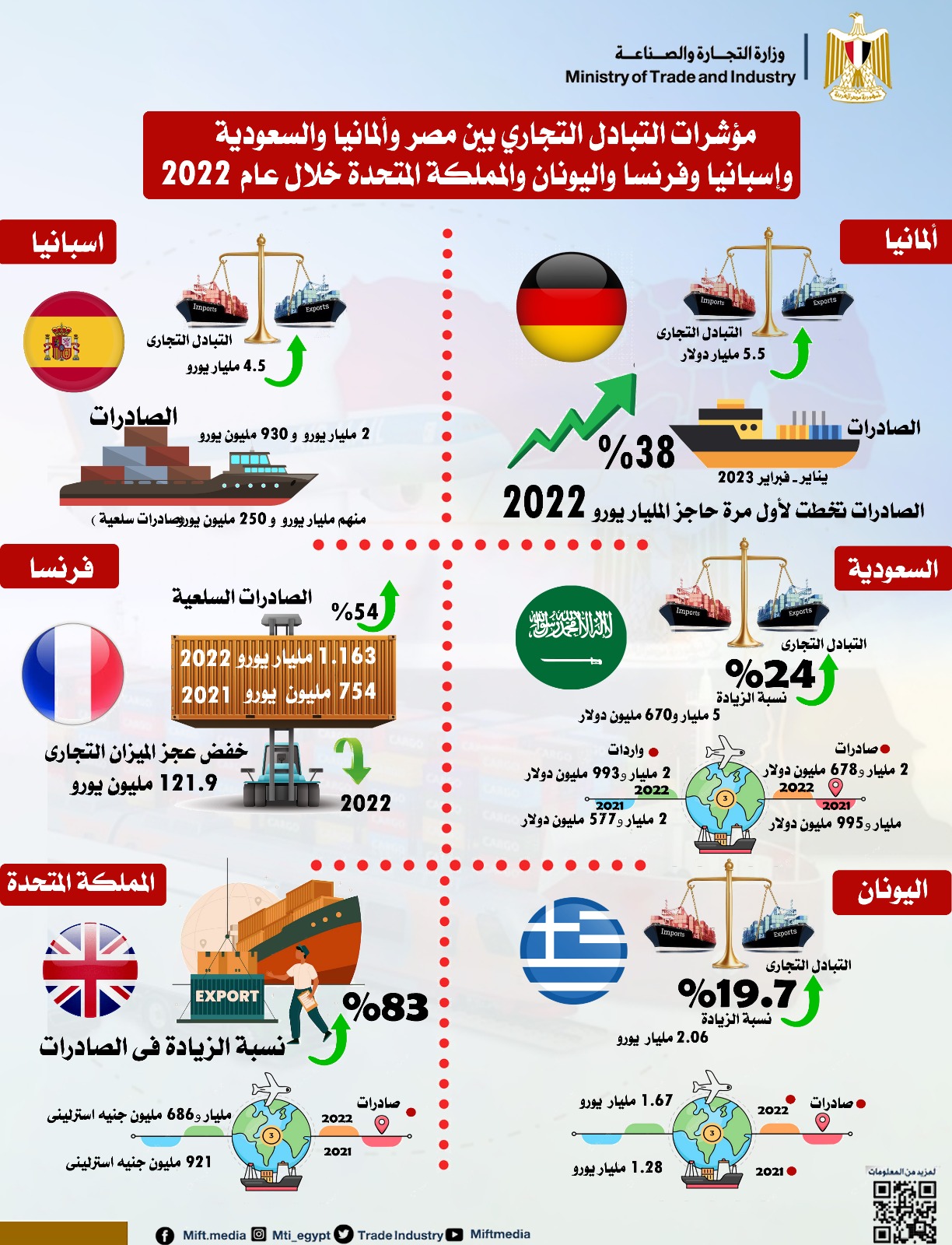وزير الصناعة يلتقي رؤساء عدد من المكاتب التجارية المصرية في الخارج بواسطة هشام ابراهيم & سناء علام 16 مايو 2023 | 2:43 م كتب هشام ابراهيم & سناء علام 16 مايو 2023 | 2:43 م أحمد سمير وزير التجارة والصناعة النشر FacebookTwitterPinterestLinkedinWhatsappTelegramEmail 41 عقد المهندس أحمد سمير وزير التجارة والصناعة عدد من اللقاءات عبر تقنية الفيديو كونفرانس، مع رؤساء المكاتب التجارية في الخارج بدول ألمانيا والسعودية وإسبانيا وفرنسا واليونان. شهدت استعراض تطور حركة التبادل التجاري بين مصر وهذه الدول خلال عام 2022، واحدث تقرير حول معدلات التجارة البينية والاستثمارات المشتركة بين مصر والمملكة المتحدة خلال العام الماضي والصادر عن المكتب التجاري المصري بلندن. إقرأ أيضاً التمثيل التجاري يبحث استعدادات الاجتماع المرتقب لآلية المراجعة الزراعية مع بريطانيا التجارة بين مصر والسعودية تقارب 6 مليارات دولار خلال النصف الأول وزير الاستثمار: ننتهي من مجموعة الاصلاحات الاقتصادية والتجارية والاستثمارية خلال شهر 5,5 مليار يورو قيمة التجارة بين مصر وألمانيا وقال إن حجم التبادل التجاري بين مصر والمانيا بلغ عام 2022 نحو 5,5 مليار يورو، مشيراً الى ان الصادرات السلعية المصرية للسوق الالماني تخطت ولأول مرة حاجز المليار يورو العام الماضي. كما واصلت ارتفاعها خلال شهري يناير وفبراير من العام الجاري حيث بلغت 260 مليون يورو محققةً نسبة زيادة بلغت 38% مقارنة بنفس الفترة من العام الماضي. 34 % نموًا بصادرات مصر للسعودية لتسجل 2,7 مليار دولار وأوضح سمير أن معدلات التبادل التجاري بين مصر والسعودية ارتفعت خلال عام ٢٠٢٢ بنسبة 24% حيث بلغت 5,67 مليار دولار، كما بلغت الصادرات المصرية إلى السوق السعودي 2,678 مليار دولار مقابل 1,995 مليار دولار خلال عام 2021 بنسبة ارتفاع بلغت 34%. وذكر أن الواردات السلعية المصرية من السعودية ارتفعت بنسبة 16% حيث بلغت 2,993 مليار دولار عام 2022 مقارنة بنحو 2,577 مليار دولار خلال عام 2021. التجارة بين مصر وإسبانيا تصل لـ 4,5 مليار يورو ولفت سمير أن حجم التبادل التجاري بين مصر وإسبانيا بلغ 4.5 مليار يورو خلال عام 2022، حيث بلغت قيمة الصادرات المصرية نحو 2 مليار و930 مليون يورو منها مليار و250 مليون يورو صادرات سلعية قفزة بصادرات مصر إلى فرنسا بنسبة نمو 136% خلال 2022 ونوه بتطور مؤشرات التجارة الخارجية بين مصر وفرنسا حيث ارتفعت معدلات الصادرات المصرية إلى السوق الفرنسي بنسبة 136% بنهاية عام 2022 حيث بلغت 2.16 مليار يورو مقارنة بنحو 917 مليون يورو خلال عام 2021. وسجلت الصادرات المصرية السلعية للسوق الفرنسي عام 2022 ارتفاعاً بنسبة 54% بقيمة 1.163 مليار يورو مقارنة بنحو 754 مليون يورو خلال عام 2021 وهو ما ساهم في خفض العجز في الميزان التجاري بين البلدين بنهاية عام 2022 الى 121.9 مليون يورو مقارنة بما قيمته 940.8 مليون يورو خلال عام 2021. 2 مليار دولار قيمة التجارة بين مصر واليونان وأضاف أن معدلات التبادل التجاري بين مصر واليونان ارتفعت خلال عام 2022 بنسبة 19.7% حيث بلغت 2.06 مليار يورو مقابل 1.72 مليار يورو عام 2021. وذكر سمير أن الصادرات المصرية إلى السوق اليوناني حققت عام 2022 نمواً غير مسبوق بنسبة 30% حيث بلغت 1.67 مليار يورو مقارنة بنحو 1.28 مليار يورو عام 2021، الأمر الذي ساهم في زيادة فائض الميزان التجاري لصالح مصر بنسبة 51% حيث بلغ 1.28 مليار يورو عام 2022 مقابل 847 مليون يورو عام 2021. 83 % نموًا بصادرات مصر إلى المملكة المتحدة وفي سياق متصل استعرض احدث تقرير حول حركة التبادل التجاري بين مصر والمملكة المتحدة والصادر عن المكتب التجاري المصري بلندن حيث اشار التقرير الى ان الصادرات المصرية للمملكة المتحدة حققت نموا غير مسبوق خلال عام 2022 بنسبة زيادة 83% حيث بلغت 1,686 مليار جنيه إسترليني مقارنة بنحو 921 مليون جنيه إسترليني خلال عام 2021. وأشار إلى أن مصر حققت لأول مرة فائض في الميزان التجاري مع المملكة المتحدة بقيمة 57 مليون جنيه إسترليني خلال عام 2022 مقارنة بعجز مزمن في الميزان التجاري معها خلال السنوات الماضية