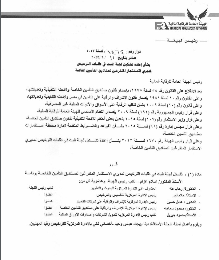 تشكيل لجنة للبت في طلبات الترخيص لمديري الاستثمار المتفرغين لصناديق التأمين الخاصة برئاسة الدكتور إسلام عزام نائب رئيس هيئة الرقابة المالية بواسطة إسلام عبد الحميد 12 يونيو 2023 | 4:33 م كتب إسلام عبد الحميد 12 يونيو 2023 | 4:33 م النشر FacebookTwitterPinterestLinkedinWhatsappTelegramEmail 92 قرر الدكتور محمد فريد، رئيس مجلس إدارة الهيئة العامة للرقابة المالية، تشكيل لجنة البت في طلبات الترخيص لمديري الاستثمار المتفرغين لصناديق التأمين الخاصة برئاسة الدكتور إسلام عزام، نائب رئيس الهيئة. وضمت اللجنة رحاب طه، المشرف على الإدارة المركزية للبحوث والتطوير، نائباً لرئيس اللجنة، بجانب عضوية كلاً حاتم نور، رئيس الإدارة المركزية للتأسيس والترخيص، والدكتور عادل حسين، رئيس الإدارة المركزية للإشراف والرقابة على شركات التأمين، والدكتور محمود سماحة، رئيس الإدارة المركزية للإشراف والرقابة على صناديق التأمين الخاصة، ومحمود جبريل، نائب رئيس الإدارة المركزية لتمويل الشركات وإصدارات الأوراق المالية. إقرأ أيضاً ننشر نموذج وثيقة الصندوق الحكومي للتأمين ضد الأخطار الناجمة عن الأخطاء الطبية الرقابة المالية تصدر نموذج وثيقة التأمين ضد الأخطار الناتجة عن الأخطاء الطبية الرقابة المالية تُلزم شركات التأمين بدراسات اكتوارية لضبط عمولات الوسطاء وحماية حقوق العملاء وتقوم دينا بهجت عباس، أخصائي ثاني بالإدارة المركزية للتراخيص وقيد المهنيين، بأعمال أمانة اللجنة. وحول اختصاصات اللجنة، أوضح القرار الصادر من الدكتور محمد فريد، برقم 1464 لسنة 2023، بأن هذه اللجنة تختص بإبداء الرأي في مذكرات الدراسة المعدة بشأن طلبات الترخيص لمديري الاستثمار المتفرغين لصناديق التأمين الخاصة وإبداء توصياتها بشأنها. وتجتمع اللجنة بصورة شهرية أو كلما دعت الحاجة بناءً على دعوة من رئيسها، ولرئيس اللجنة دعوة من يراه من داخل الهيئة أو خارجها لحضور اجتماعاتها في الأحوال التي تتطلب ذلك، دون أن يكون له صوت معدود في المعداولات. ووفقاً للقرار، لا يكون انعقاد اللجنة صحيحاً إلا بحضور ثلثي أعضائها على الأقل وتصدر توصياتها بأغلبية أعضائها الحاضرين، وتعد اللجنة محضراً يتضمن النتائج والتوصيات يرفع لرئيس هيئة الرقابة المالية للاعتماد. وقد تضمن القرار في مادته الخامسة إلغاء قرار الهيئة رقم 1670 لسنة 2022. ويشار إلى أن مشروع قانون التأمين الموحد المزمع إقراره من مجلس النواب خلال الفترة المقبلة، ألزم صندوق التأمين الخاص الذى يبلغ رصيد أمواله 50 مليون جنيه فأكثر بتعيين مدير استثمار لتلك الأموال. ونصت المادة 96 بالقانون كما أقرها مجلس الشيوخ، الذى وافق عليه نهائيا على “على أن يلتزم الصندوق الذي يبلغ حجم أمواله المستثمرة خمسين مليون جنيه فأكثر بتعيين مدير استثمار متفرغ مسئول عن إدارة استثمار أموال الصندوق ترخص له الهيئة بذلك، أو أن يعهد بإدارة واستثمار أمواله إلى شركة أو أكثر من الشركات المرخص لها بإدارة صناديق الاستثمار وفقاً لقانون سوق رأس المال وذلك كله وفقاً للقواعد والضوابط التي يضعها مجلس إدارة الهيئة في هذا الشأن”. اللينك المختصرللمقال: https://amwalalghad.com/z929 إسلام عزامالهيئة العامة للرقابة الماليةصناديق التأمين الخاصةهيئة الرقابة المالية