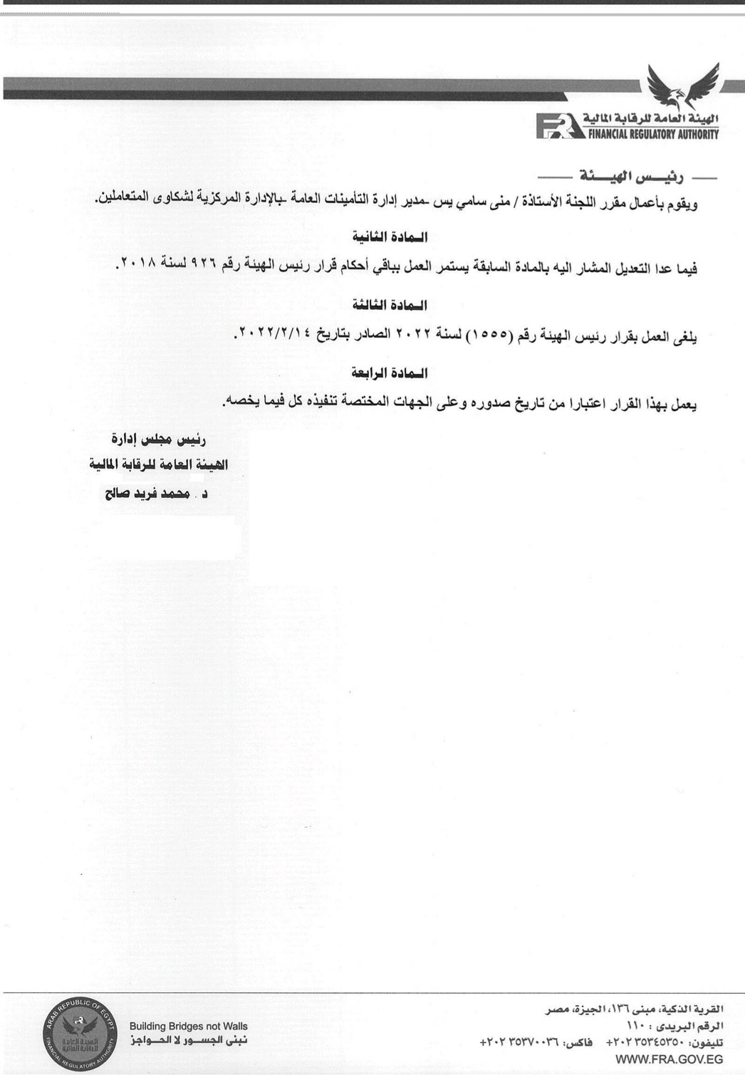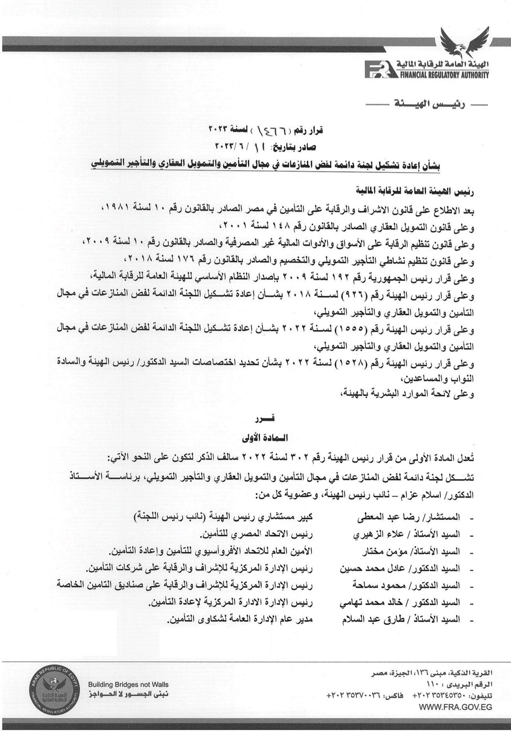 «الرقابة المالية» تشكل لجنة دائمة لفض المنازعات لأنشطة التأمين والتمويل العقاري والتأجير التمويلي بواسطة تقى حاتم 12 يونيو 2023 | 8:18 م كتب تقى حاتم 12 يونيو 2023 | 8:18 م الهيئة العامة للرقابة المالية النشر FacebookTwitterPinterestLinkedinWhatsappTelegramEmail 365 أصدرت الهيئة العامة للرقابة المالية قراراً رقم 1466؛ بشأن إعادة تشكيل لجنة دائمة لفض المنازعات في مجال التأمين والتمويل العقاري والتأجير التمويلي. وينص القرار على أن تعدل المادة الأولى من قرار رئيس الهيئة رقم 302 لعام 2022، وأن تشكل لجنة دائمة لفض المنازعات في مجال التأمين والتمويل العقاري والتأجير التمويلي، برئاسة الدكتور إسلام عزام نائب رئيس الهيئة، ويتولى منصب نائب رئيس اللجنة المستشار رضا عبدالمعطي، كبير مستشاري رئيس الهيئة. إقرأ أيضاً «الرقابة المالية»: «المهندس للتأمين» ملتزمة بالمعايير الفنية والمحاسبية ولا توجد مخالفات جوهرية عليها شطب «الشرق الأدنى» من سجلات شركات المعاينة وتقدير الأضرار بقطاع التأمين استثمارات الدلتا للتأمين ترتفع إلى 2.24 مليار جنيه بنهاية 2025 وأصولها تتراجع 13% ويشارك بعضوية اللجنة علاء الزهيري رئيس الاتحاد المصري للتأمين، ومؤمن مختار الأمين العام للاتحاد الأفروأسيوي للتأمين وإعادة التأمين، وعادل محمد حسين، رئيس الإدارة المركزية للإشراف والرقابة على شركات التأمين، ومحمود سماحة رئيس الإدارة المركزية للإشراف والرقابة على صناديق التأمين الخاصة، وخالد محمد التهامي رئيس الإدارة المركزية لإعادة التأمين، وطارق عبدالسلام مدير عام الإدارة العامة لشكاوي التأمين. ويقوم بأعمال مقرر اللجنة؛ منى سامي يس، مدير إدارة التأمينات العامة بالإدارة المركزية لشكاوي المتعاملين. وتنص المادة الثانية، بأنه فيما عدا التعديل المشار إليه سابقا يستمر العمل بباقي أحكام قرار رئيس الهيئة رقم 926 لعام 2018، وتتمثل المادة الثالثة في أن يلغى العمل بقرار رئيس الهيئة رقم 1555 لعام 2022. وجاء القرار بعد الإطلاع على قانون الإشراف والرقابة على التأمين في مصر الصادر بالقانون رقم 10 لعام 1981، وعلى قانون التمويل العقاري الصادر بالقانون رقم 148 لعام 2001. اللينك المختصرللمقال: https://amwalalghad.com/a1r9 التأجير التمويليالتمويل العقاريالقطاع المالي غير المصرفيالهيئة العامة للرقابة الماليةقطاع التأمين