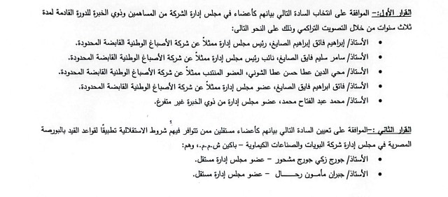 «باكين» تنتخب مجلس إدارة جديدًا لمدة 3 سنوات بواسطة أموال الغد 24 يوليو 2023 | 12:54 م كتب أموال الغد 24 يوليو 2023 | 12:54 م باكين النشر FacebookTwitterPinterestLinkedinWhatsappTelegramEmail 117 انتخبت الجمعية العامة العادية لشركة البويات والصناعات الكيماوية – باكين، مجلس إدارة الشركة لمدة 3 سنوات. وأوضحت الشركة، في بيان للبورصة اليوم، أنه تقرر تعيين إبراهيم الصايغ رئيساً لمجلس إدارة الشركة ممثلاً عن شركة الأصباغ الوطنية القابضة. إقرأ أيضاً الصناعة المصرية تعلن جاهزيتها لتطبيق المواصفات الدولية للدهانات الخالية من الرصاص «المواصفات والجودة» تمنح أول علامة خضراء في مصر لشركة «باكين» البورصة توافق على شطب قيد أسهم «باكين» وإدراجها بسوق خارج المقصورة كما تقرر تعيين سامر سليم الصايغ نائباً لرئيس مجلس إدارة باكين ممثلاً عن الأصباغ الوطنية القابضة، وكذلك تعيين محيي الدين عطا حسن الشوني عضواً منتدباً وممثلاً عن الأصباغ المحدودة. وتقرر تعيين فايق الصايغ عضواً بمجلس الإدارة وممثلاً عن الأصباغ الوطنية، ومحمد عبد الفتاح عضو مجلس إدارة من ذوي الخبرة غير متفرغ، وتعيين جورج زكي وجبران مأمون أعضاء مستقلين بمجلس الإدارة. اللينك المختصرللمقال: https://amwalalghad.com/qy6r أخبار سهم باكينباكينسهم باكين