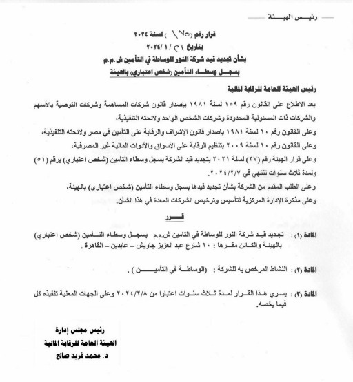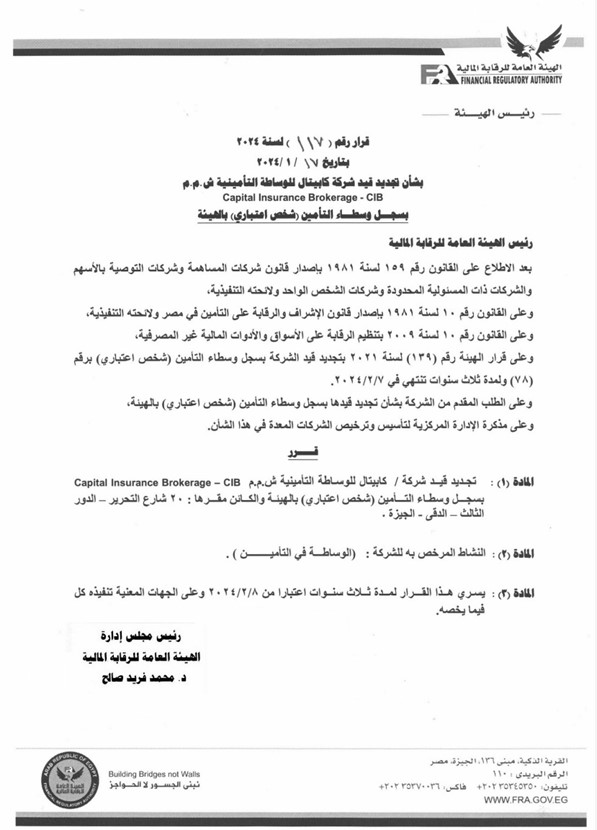 هيئة الرقابة المالية تجدد قيد شركتي «كابيتال» و«النور» للوساطة التأمينية بسجلاتها لمدة 3 سنوات تنتهي في فبراير 2027 بواسطة إسلام عبد الحميد 4 فبراير 2024 | 1:18 م كتب إسلام عبد الحميد 4 فبراير 2024 | 1:18 م النشر FacebookTwitterPinterestLinkedinWhatsappTelegramEmail 90 أصدر الدكتور محمد فريد، رئيس مجلس إدارة الهيئة العامة للرقابة المالية، قرارين بشأن تجديد شركتي كابيتال للوساطة التأمين والنور للوساطة في التأمين بسجل وسطاء التأمين (شخص اعتباري) بالهيئة. ووفقاً للقرارين الصادرين برقمي 117 و175 لسنة 2024، فقد تقرر تجديد قيد شركتي «كابيتال» و«النور» بسجلات شركات الوساطة التأمينية بالهيئة لمدة 3 سنوات اعتباراً من 8 فبراير الجاري، وعلى الجهات المعنية تنفيذ القرار. إقرأ أيضاً المهندس للتأمين تقتنص تغطية الطبي للعاملين بهيئة الرقابة المالية وأسرهم استثمارات الدلتا للتأمين ترتفع إلى 2.24 مليار جنيه بنهاية 2025 وأصولها تتراجع 13% هيئة الرقابة المالية تدرس سبل تطوير ورقمنة صناديق التأمين الخاصة ورفع كفاءة أدائها وجاءت هذه القرارات بعد الاطلاع على القانون رقم 159 لسنة 1981 بإصدار قانون شركات المساهمة وشركات التوصية بالأسهم والشركات ذات المسئولية المحدودة وشركات الشخص الواحد ولائحته التنفيذية؛ وعلى القانون رقم 10 لسنة 1981 بإصدار قانون الإشراف والرقابة على التامين في مصر ولائحته التنفيذية. اللينك المختصرللمقال: https://amwalalghad.com/2h82 التأمينالنورالنور للوساطة في التأمينالهيئة العامة للرقابة الماليةشركات الوساطة التأمينيةكابيتال للوساطة التأمينيةهيئة الرقابة المالية