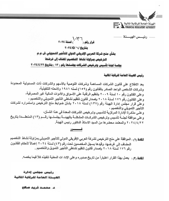 العربي الإفريقي الدولي للتأجير التمويلي تضيف «التخصيم» إلى نشاطها بواسطة تقى حاتم 16 مايو 2024 | 2:16 م كتب تقى حاتم 16 مايو 2024 | 2:16 م النشر FacebookTwitterPinterestLinkedinWhatsappTelegramEmail 102 منحت الهيئة العامة للرقابة المالية شركة العربي الإفريقي الدولي للتأجير التمويلي ترخيص مزاولة نشاط التخصيم المضاف إلى غرضها. وأصدر الدكتور محمد فريد، رئيس مجلس إدارة الهيئة، قراراً رقم 1036 لسنة 2024 بشأن قيد شركة العربي الإفريقي الدولي بسجل المخصمين تحت رقم 43 لسنة 2024 إعمالاً لأحكام القانون رقم 176 لسنة 2018 بإصدار قانون تنظيم نشاطي التأجير التمويلي والتخصيم. إقرأ أيضاً «الرقابة المالية»: 12.2 مليار جنيه حجم الأوراق المخصمة بالسوق المصرية خلال يناير عقود التأجير التمويلي بالسوق المصرية تلامس 15 مليار جنيه خلال يناير 65.6 مليار جنيه إجمالي التمويل الممنوح من الجهات الخاضعة لإشراف «الرقابة المالية» بنهاية يناير ووفقاً للقرار، يعمل بهذا القرار اعتباراً من تاريخ صدوره وعلى الإدارات المعنية تنفيذه كلاً فيما يخصه. وكانت قد أعلنت الهيئة العامة للرقابة المالية عن مؤشرات الأنشطة المالية غير المصرفية خلال شهر فبراير 2024، موضحةً أن قيمة الأوراق المخصمة بلغت 4 مليارات جنيه خلال تلك الفترة. اللينك المختصرللمقال: https://amwalalghad.com/fi4t التأجير التمويليالتخصيمالعربي الإفريقي الدوليالعربي الإفريقي الدولي للتأجير التمويلي