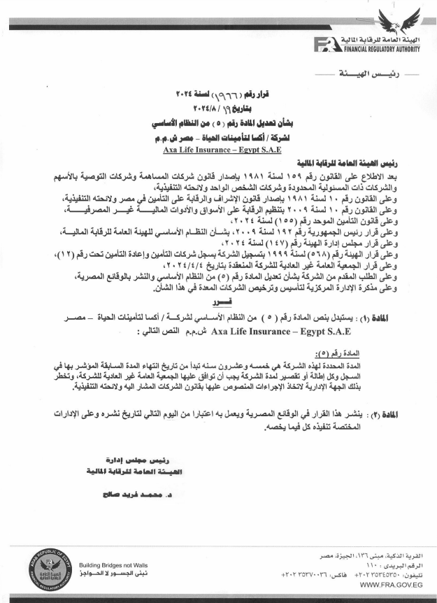 قررت الهيئة العامة للرقابة المالية تعديل المادة رقم (5) من النظام الأساسي لشركة أكسا لتأمينات الحياة – مصر، وفقاً للقرار الصادر من الدكتور محمد فريد، رئيس مجلس إدارة الهيئة برقم 1966 لسنة 2024.