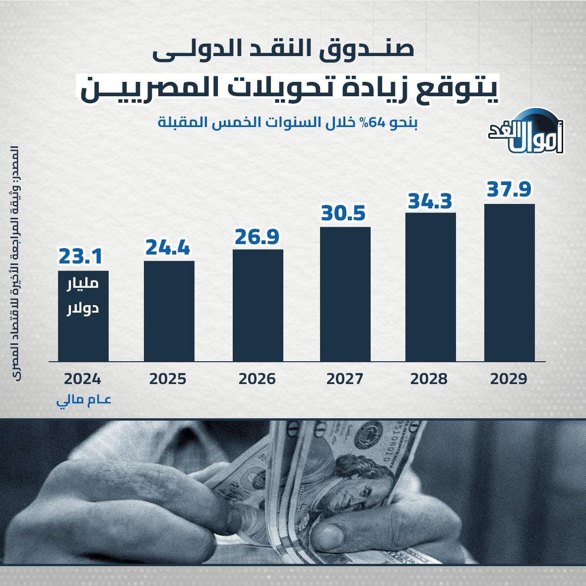 «صندوق النقد» يتوقع زيادة تحويلات المصريين العاملين بالخارج 64% خلال 5 سنوات بواسطة مصطفى محمود 28 أغسطس 2024 | 4:20 م كتب مصطفى محمود 28 أغسطس 2024 | 4:20 م النشر FacebookTwitterPinterestLinkedinWhatsappTelegramEmail 201 توقع صندوق النقد الدولي زيادة تحويلات المصريين العاملين بالخارج بنحو 64% خلال السنوات الخمس المقبلة، لتصل إلى 37.9 مليار دولار في عام 2029، وذلك وفق وثيقة المراجعة الثالثة للاقتصاد المصري. إقرأ أيضاً رئيس الوزراء: توجيهات رئاسية بإطلاق حزمة متكاملة من التيسيرات لقطاعات الدولة رئيس الوزراء: تنسيق مستمر مع البنك المركزي للحفاظ على المسار النزولي للتضخم البنك المركزي يقبل سيولة بقيمة 103.3 مليار جنيه في عطاء السوق المفتوحة اللينك المختصرللمقال: https://amwalalghad.com/ybtg اتفاق مصر صندوق النقد الدوليالبنك المركزي المصريتحويلات المصريينتحويلات المصريين العاملين بالخارجصندوق النقد الدولي