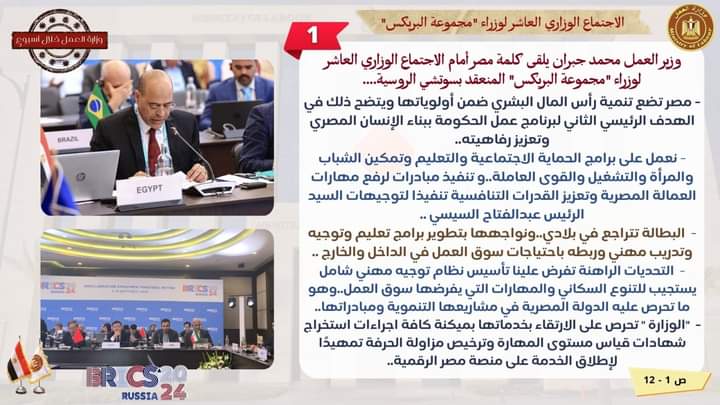 وزير العمل يستعرض أمام البريكس جهود الدولة في تنفيذ برامج الحماية الإجتماعية بواسطة أموال الغد 14 سبتمبر 2024 | 10:57 ص كتب أموال الغد 14 سبتمبر 2024 | 10:57 ص النشر FacebookTwitterPinterestLinkedinWhatsappTelegramEmail 54 نشرت وزارة العمل ،اليوم السبت “إنفوجراف” ،يوضح جهود “الوزارة ” خلال الـ7 أيام الماضية ،والتي شملت مجموعة من الفعاليات أبرزها مُشاركة السيد محمد جبران ،وزير العمل، فى أعمال الاجتماع الوزاري العاشر للوزراء العمل والتشغيل التابع لمجموعة البريكس، المُنعقد في سوتشي الروسية، بدعوة رسمية من انتون كوتياكوف، وزير العمل والحماية الاجتماعية الروسية،لمُناقشة العديد من الملفات المُتعلقة بالعمل والإنتاج، بحضور وفود من الدول الاعضاء لمجموعة البريكس…وكانت المبادرات، والتوجيهات الرئاسية،وبرنامج الحكومة،مُرتكزات،اعتمد عليها وزير العمل،خلال أحاديثه في الاجتماعات..فالمبادرة الرئاسة “حياة كريمة”، نُموذج يُحتذى به في “الحماية الاجتماعية”..كما أن مُبادرة “مِهنتك مُستقبلك “،مُرتبطة بشكل مباشر بملف تطوير منظومة التدريب المهني لتتماشى مع تحديات واحتياجات سوق العمل في الداخل والخارج ..وتطرق الوزير إلى محاور برنامج الحكومة،وما تضمنه من بند “بناء الإنسان” كواحد من أبرز حقوق الإنسان ..كما أن توجيهات الرئيس السيسي، بإعداد استراتجية وطنية للسلامة والصحة المهنية ، وسُرعة الانتهاء من مناقشة مشروع قانون العمل وطرحه على “الحوار الاجتماعي”،لتحقيق المزيد من الأمان الوظيفي للعامل ،والتشجيع على الإستثمار ،وكذلك رفع الحد الأدنى للأجور للقطاعين الحكومي والخاص،وأيضًا ميكنة الخدمات ،و”التحول الرقمي” ،جميعها ثوابت ومعايير دولية لبيئة عمل لائقة داخل “الجمهورية الجديدة”،تتوفر فيها وسائل السلامة والصحة المهنية ،والعِمالة الماهرة والمُدربة ،ومنظومة التدريب المهني المتواكبة مع تحديات سوق العمل،والتشريعات العادلة والمتوزانة ..وإختتم وزير العمل مُشاركته في إجتماعات “البريكس” بحضور الجلسة الختامية ،وإلقاء،أكد خلالها على تثمينه للنتائج والتوصيات التي صدرت عن “الإجتماعات”، خاصة “الإعلان الوزاري”،والذي من شأنه الإسهام في تعزيز التعاون المشترك بين جميع الدول الأعضاء فى مجموعة البريكس، في مجالات العمل المختلفة..وخلال مشاركته هذه الفعاليات في روسيا ،إلتقى وزير العمل،مع د. عبدالرحمن العور، وزير الموارد البشرية والتوطين في دولة الإمارات العربية المتحدة..وشهد الاجتماع مناقشة تعزيز العلاقات الثنائية بين البلدين في مجالات العمل،لا سيما ما يتعلق بالتدريب المهني، وتوفير فرص العمل،وتبادل الخبرات بشأن تشريعات عالم العمل في البلدين .. وشهد هذا الأسبوع أيضًا قيام محمد جبران وزير العمل ،بتفقد إختبارات نظرية لشباب تقدموا بأوراقهم، لشغل فرص العمل التي أعلنت عنها “الوزارة”،منذ أسبوعين ،للعمل في مهن تخص قطاع البناء والتشييد ،في البوسنة والهرسك..وخلال لقاء الوزير مع الشباب في مقر الاختبارات بمدينة نصر،وجههم بأن يكونوا سفراء لبلادهم ،في الاخلاص والإتقان في العمل ..وتأتي هذه الاختبارات ،تنفيذاً لتوجيهات وزير العمل بتوفير فرص عمل لائقة في الخارج ، للشباب المصري،وكان الإدارة العامة للتشغيل،بدأت بمقرها بمدينة نصر ،بمشاركة مندوبين من دولة البوسنة والهرسك ،في عمليات الاختبارات النظرية، للشباب الذي تقدم منذ أيام على الفرص التي أعلنت عنها “الوزارة” بالتنسيق مع الجانب المسؤول في البوسنة والهرسك.. ، كما نشرت وزارة العمل، فيديو مُصور يشرح عملية الإختبارات النظرية، والعملية التي تقوم بها “الوزارة” ،بمدينة نصر،وبمركز تدريب بولاق الدكرور،وإمبابة بالتنسيق مع الجانب السربي…وخلال الأسبوع أعلن السيد محمد جبران وزير العمل ،عن تعاون مُرتقب بين “الوزارة” ،وشركة وداي النيل للمقاولات والاستثمارات العقارية ، برئاسة المهندس هاني ضاحي ،كإحدى الشركات الوطنية المنفذة للمشروع القومي لتطوير قرى 