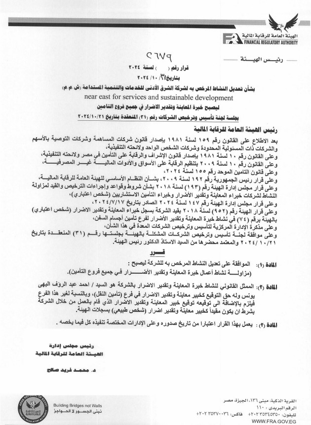 «الشرق الأدنى للخدمات» تحصل على رخصة نشاط خبراء المعاينة وتقدير الأضرار بكافة فروع التأمين بواسطة إسلام عبد الحميد 18 نوفمبر 2024 | 11:43 ص كتب إسلام عبد الحميد 18 نوفمبر 2024 | 11:43 ص النشر FacebookTwitterPinterestLinkedinWhatsappTelegramEmail 54 قررت الهيئة العامة للرقابة المالية تعديل النشاط المرخص به لشركة الشرق الأدنى للخدمات والتنمية المستدامة ليصبح خبرة المعاينة وتقدير الأضرار في جميع فروع التأمين. ووفقاً للقرار الصادر برقم 2679 لسنة 2024، يصبح الممثل القانوني لنشاط خبرة المعاينة وتقدير الأضرار بشركة “الشرق الأدنى” هو أحمد عبدالرؤوف وله حق التوقيع كخبير معاينة وتقدير الأضرار في فرع تأمين النقل. إقرأ أيضاً رئيس الرقابة المالية: إطلاق حملة توعية بنشاط التأمين تستهدف زيادة معدلات ادخار المواطنين اتحاد التأمين يوصي الشركات بابتكار منتجات خضراء والمساهمة في تمويل المشروعات البيئية الرقابة المالية تصدر ضوابط مباشرة شركات الوساطة التأمينية أعمالها رقميًا وبالنسبة لغير هذا الفرع التأميني “النقل” فيلزم بالإضافة إلى توقيع الممثل القانوني؛ توقيع خبير المعاينة والأضرار الذي قام بالعمل من خلال الشركة شريطة أن يكون مقيدًا كخبير معاينة وتقدير أضرار (شخص طبيعي) بسجلات الهيئة العامة للرقابة المالية. يذكر أنه بلغ عدد شركات المعاينة وتقدير الأضرار بقطاع التأمين بالسوق المصرية نحو 31 شركة بنهاية يونيو 2024، وفقاً للتقرير الربع سنوي الصادر عن الهيئة العامة للرقابة المالية. ويشار إلى أن نشاط المعاينة وتقدير الأضرار يتمثل في الكشـف عـن الأضـرار التي يتعرض لها المؤمن له وممتلكاته وتقديرها ودراسة أسبابها ومدى تغطية الوثيقة التأمينية لتلك الأضرار وكذلك تقديم المقترحات في شأن تحسين وسائل الوقاية من الأخطار والمحافظة على موضوع التأمين إذا طلب منه ذلك. اللينك المختصرللمقال: https://amwalalghad.com/juni الشرق الأدنى للخدماتالهيئة العامة للرقابة الماليةخبراء المعاينة وتقدير الأضرارفروع التأمينقطاع التأمين