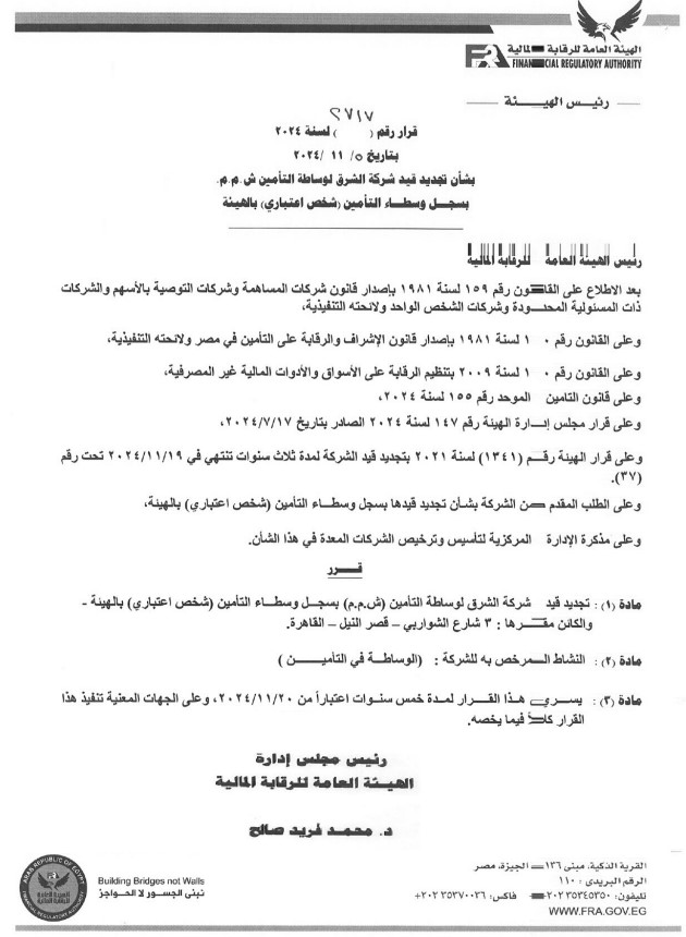 تجديد قيد الشرق لوساطة التأمين بسجلات «الرقابة المالية» لمدة 5 سنوات بواسطة إسلام عبد الحميد 20 نوفمبر 2024 | 1:14 م كتب إسلام عبد الحميد 20 نوفمبر 2024 | 1:14 م مقر الهيئة العامة للرقابة المالية - أرشيفية النشر FacebookTwitterPinterestLinkedinWhatsappTelegramEmail 122 قررت الهيئة العامة للرقابة المالية تجديد قيد شركة الشرق لوساطة التأمين بسجل وسطاء التأمين (شخص اعتباري) بالهيئة. وقد أصدر الدكتور محمد فريد، رئيس مجلس إدارة الهيئة ، قراراً رقم 2717 لسنة 2024 بشأن تجديد قيد الشركة بسجلات الهيئة لمدة 5 سنوات اعتباراً من 20 نوفمبر 2024. إقرأ أيضاً المهندس للتأمين تقتنص تغطية الطبي للعاملين بهيئة الرقابة المالية وأسرهم هيئة الرقابة المالية تدرس سبل تطوير ورقمنة صناديق التأمين الخاصة ورفع كفاءة أدائها عقود التأجير التمويلي بالسوق المصرية تلامس 15 مليار جنيه خلال يناير وصدر هذا القرار بعد الاطلاع على القانون رقم 159 لسنة 1981 بإصدار قانون شركات المساهمة وشركات التوصية بالأسهم والشركات ذات المسئولية المحدودة وشركات الشخص الواحد ولائحته التنفيذية، وعلى القانون رقم 10 لسنة 1981 بإصدار قانون الإشراف والرقابة على التأمين في مصر ولائحته التنفيذية، وعلى قانون التأمين الموحد رقم 155 لسنة 2024. ويشار إلى أن نشاط الوساطة التأمينية هو تمثيل العميل أمام شركات التأمين بغرض الحصول على أنسب الشروط والأسعار ومعاونتهم فنياً، والحصول على تعويض عادل وتقديم كافة الاستشارات الفنية الخاصة بالوثيقة والتغطيات الصادرة لهم. ويذكر أنه قد رخصت الهيئة العامة للرقابة المالية لأول شركة بمزاولة نشاط الوساطة التأمينية في شهر فبراير 2009، ويصل عدد الشركات المزاولة لنشاطي وساطة التأمين وإعادة التأمين بالسوق المصرية حتى الآن 106 شركات. اللينك المختصرللمقال: https://amwalalghad.com/4jxh الشرق لوساطة التأمينشركات الوساطة التأمينيةقانون التأمين الموحدهيئة الرقابة المالية
