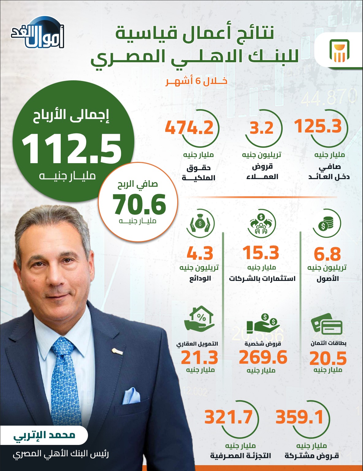 طفرة فى نتائج أعمال البنك الاهلي المصري خلال النصف الأول من 2024.. إنفوجراف بواسطة ندى عبد العزيز 1 ديسمبر 2024 | 12:45 م كتب ندى عبد العزيز 1 ديسمبر 2024 | 12:45 م النشر FacebookTwitterPinterestLinkedinWhatsappTelegramEmail 231 حقق البنك الأهلي المصري طفرة في نتائج أعماله خلال النصف الأول من العام الجاري 2024، إذ قفزت أرباح البنك قبل الضرائب إلى 112.489 مليار جنيه بنهاية يونيو 2024، مقابل 46.340 مليار جنيه بنهاية يونيو 2023، بنمو بنسبة 142.7%. وارتفعت ودائع العملاء بالبنك لتسجل 4.294 تريليون جنيه بنهاية يونيو 2024، مقابل 3.733 مليار جنيه بنهاية عام 2023، بمعدل نمو 15.03%. إقرأ أيضاً البنوك تفتح الحسابات مجانا بمناسبة فعاليات «اليوم العربي للشمول المالي» تراجع يصل لـ 1.05 جنيه.. الدولار يفقد مكاسبه أمام الجنيه في بنكي الأهلي ومصر بنسب تصل لـ 58.5%.. تباين في معدلات توظيف القروض للودائع بالبنوك بنهاية 2025 اللينك المختصرللمقال: https://amwalalghad.com/e89k البنك الأهلى المصريبنوك مصرنتائج أعمال البنك الأهلى المصري
