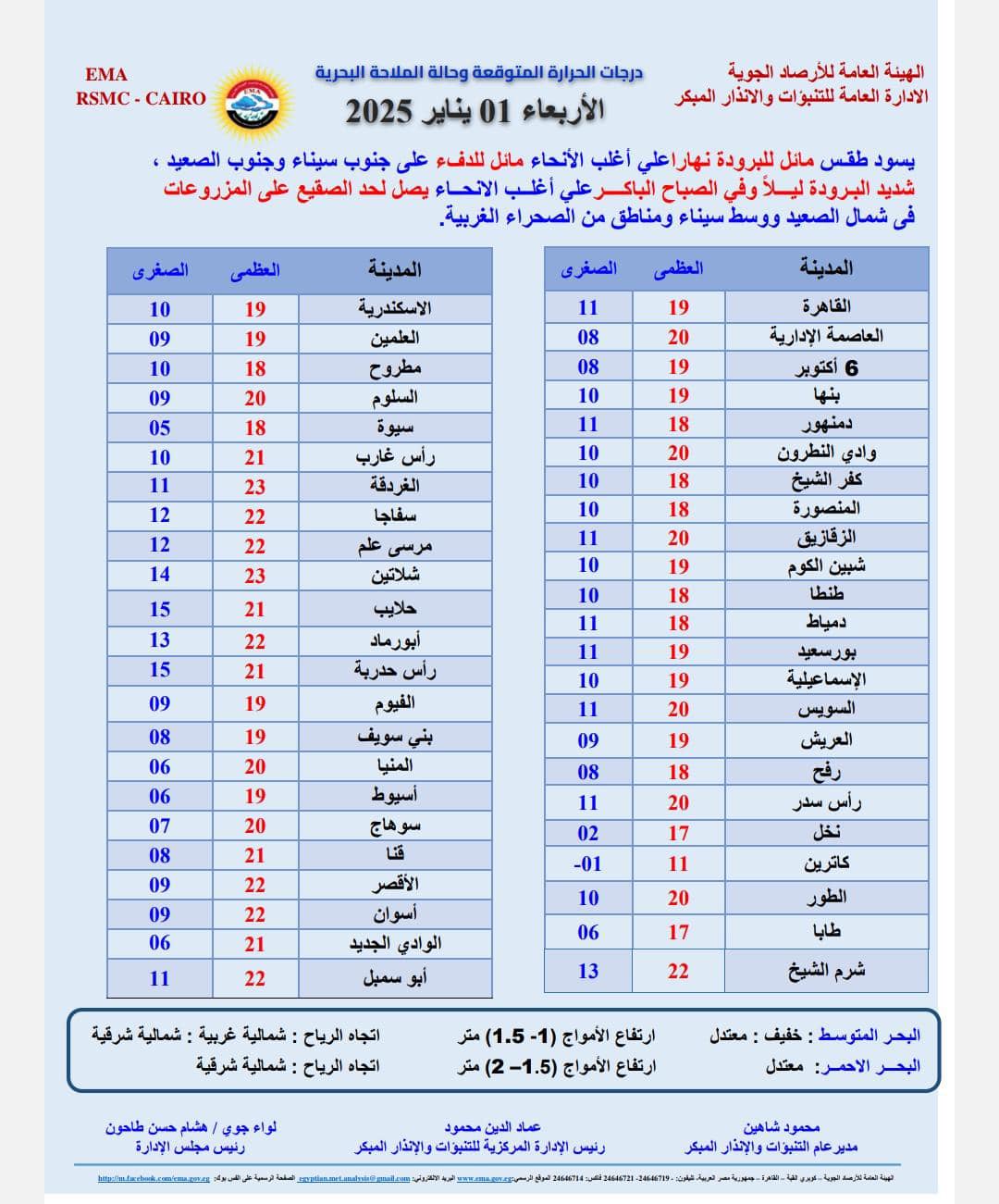 توقعات الطقس غدًا الأربعاء 1 يناير 2025.. «استمرار حالة البرودة الشديدة» بواسطة اسلام فضل 31 ديسمبر 2024 | 5:27 م كتب اسلام فضل 31 ديسمبر 2024 | 5:27 م توقعات حالة الطقس غدا الأربعاء 1 يناير 2025 النشر FacebookTwitterPinterestLinkedinWhatsappTelegramEmail 550 حول حالة الطقس غدًا .. توقعت الهيئة العامة للأرصاد الجوية الإدارة العامة للتنبؤات والإنذار المبكر أن يسود طقس بارد نهارا على أغلب الأنحاء، مائل للدفء على جنوب سيناء وجنوب الصعيد، شديد البرودة ليلا وفى الصباح الباكر على أغلب الأنحاء، يصل الى حد الصقيع على المزروعات فى شمال الصعيد ووسط سيناء ومناطق من الصحراء الغربية. حالة الطقس غدًا الأربعاء 1 يناير 2025 وفقا لبيان هيئة الأرصاد، فإن حالة الطقس غدًا الأربعاء 1 يناير 2025 يسودها مجموعة من الظواهر الجوية، ففى القاهرة الكبرى وجنوب الوجه البحرى ومدن القناة تتكاثر السحب ويكون الجو غائم جزئيا مع رياح معتدلة بسرعة 24 كيلو متر/ ساعة إقرأ أيضاً حالة الطقس غدا الجمعة.. أجواء باردة وأمطار على هذه المحافظات توقعات حالة الطقس في مصر من الجمعة 12 حتى الثلاثاء 16 ديسمبر 2025 حالة الطقس غدا.. الأمطار تضرب سواحل المتوسط والشبورة تسيطر على الطرق وفى السواحل الشمالية الغربية، قالت هيئة الأرصاد إنها ستشهد شبورة مائية قد تكون كثيفة أحيانا مع نشاط للرياح بسرعة 20 كيلو متر/ساعة،وهى نفس حالة الطقس التى تسود منطقة السواحل الشمالية الشرقية ز وشمال الوجه البحرى. وفى مناطق سيناء وسلاسل جبال الأحمر، فلا توجد أمطار، مع سرعة رياح تنشط أحيانًا 30 كيلومتر/ساعة وأجواء غائمة جزئيا، وكذا فى محافظات شمال الصعيد، أما فى جنوب الصعيد فإن الأجواء مشمسة فى الغالب مع سرعة رياح 24 كيلو متر/ ساعة. درجات الحرارة غدا درجة الحرارة غدا في القاهرة: العظمى 19 والصغرى 11 درجة الحرارة غدا فى العاصمة الإدارية: العظمى 20 الصغرى 8 درجة الحرارة غدا في الاسكندرية: العظمى 19 والصغرى 10 درجة الحرارة غدا في بورسعيد: العظمى 19 والصغرى 11 درجة الحرارة غدا في الاسماعيلية: العظمى 19 والصغرى 10 درجة الحرارة غدا في العريش: العظمى 19 والصغرى 9 درجة الحرارة غدا في رأس سدر: العظمى 21 والصغرى 10 درجة الحرارة غدا في شرم الشيخ: العظمى 22 والصغرى 13 درجة الحرارة غدا في الغردقة: العظمى 23 والصغرى 11 درجة الحرارة غدا في الاقصر: العظمى 22 والصغرى 9 درجة الحرارة غدا في أسوان: العظمى 22 والصغرى 9 درجة الحرارة غدا في مطروح: العظمى 18 والصغرى 10 درجة الحرارة غدا في العلمين الجديدة: العظمى 19 والصغرى 9 حالة الطقس ودرجات الحرارة بجميع المدن المصرية حالة الملاحة المتوقعة غدًا الأربعاء 1 يناير 2025 طبقا لتقرير هيئة الأرصاد الجوية، فإنه من المتوقع أن يكون البحر المتوسط خفيف إلى معتدل وارتفاع الموج 1 إلى 1.5 متر واتجاه الرياح: شمالية غربية: شمالية شرقية. إما البحر الأحمر فيكون معتدل وارتفاع الموج بين 1.5 إلى 2 متر واتجاه الرياح: شمالية شرقية. اللينك المختصرللمقال: https://amwalalghad.com/7h2g توقعات حالة الطقستوقعات درجات الحرارةتوقعات هيئة الأرصاد الجويةحالة الطقس اليومحالة الطقس غدادرجات الحرارة اليومدرجات الحرارة غدا