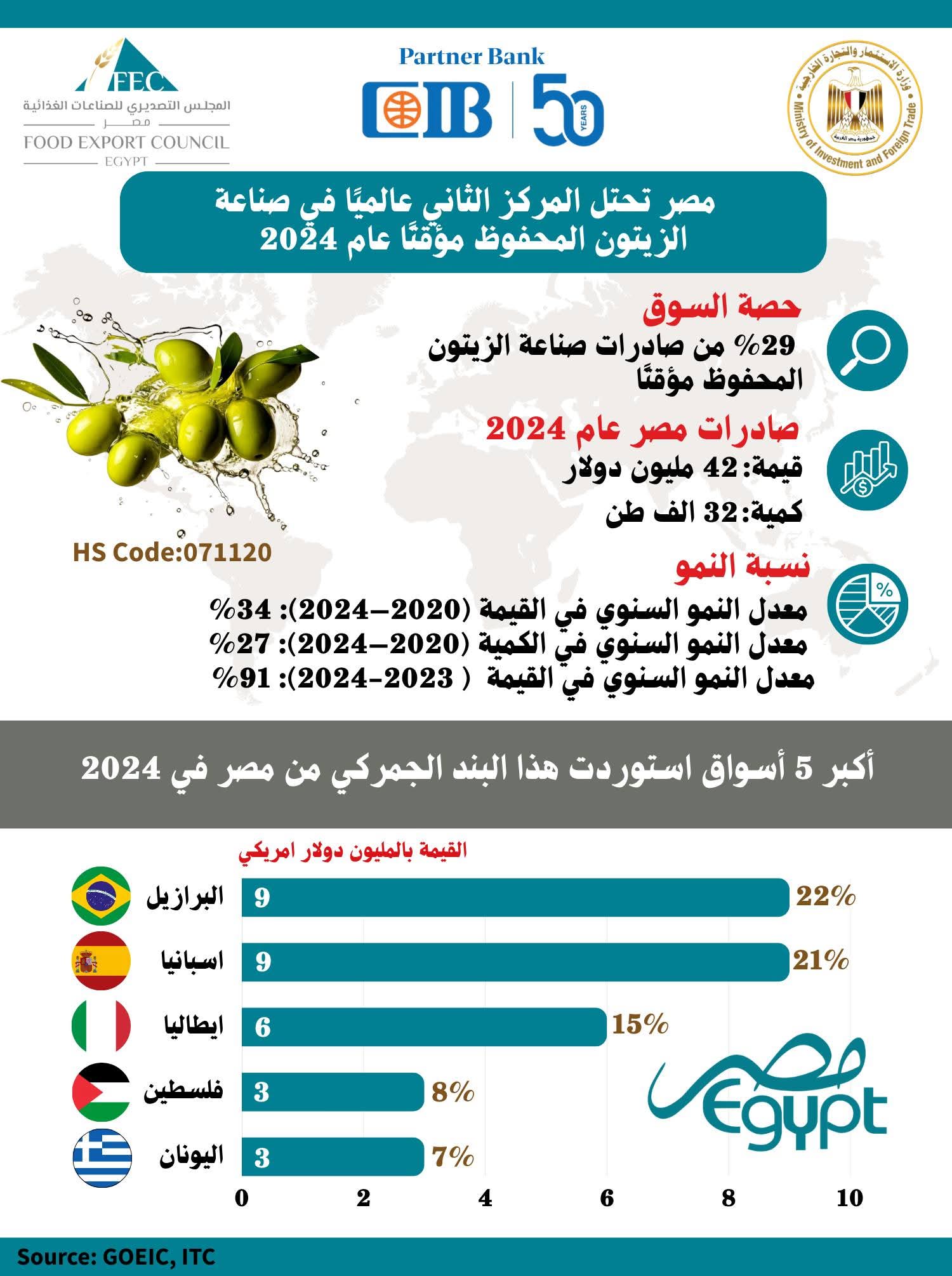 مصر ثاني أكبر مصدر عالميًا للزيتون المحفوظ بحصة 29% في 2024 بواسطة سناء علام 19 أغسطس 2025 | 2:54 م كتب سناء علام 19 أغسطس 2025 | 2:54 م النشر FacebookTwitterPinterestLinkedinWhatsappTelegramEmail 107 أكد المجلس التصديري للصناعات الغذائية أن مصر رسّخت مكانتها العالمية في قطاع تصدير الزيتون المحفوظ مؤقتًا (HS Code 071120)، حيث جاءت في المركز الثاني عالميًا خلال عام 2024 بحصة سوقية بلغت 29% من إجمالي الصادرات العالمية، لتواصل تنافسيتها المتزايدة في سوق المنتجات الزراعية المُعالجة. وأوضح المجلس أن قيمة الصادرات المصرية من الزيتون المحفوظ مؤقتًا سجلت 42 مليون دولار في عام 2024، بكمية بلغت 32 ألف طن. إقرأ أيضاً «التصديري للغذائية»: 100 مليون دولار فرص تصديرية غير مستغلة للمنتجات المصرية في بريطانيا «التصديري للغذائية»: «البريكست» فتح فرصًا جديدة لزيادة حصة الغذاء المصري في السوق البريطانية قفزة 59%.. صادرات الأغذية المصرية للمملكة المتحدة تسجل 137 مليون دولار في 2025 وقد شهد هذا البند طفرة كبيرة في معدلات النمو، حيث ارتفعت قيمة الصادرات بنسبة 91% مقارنة بعام 2023، بينما بلغ معدل النمو السنوي المركب للفترة (2020 – 2024) نحو 34% في القيمة و27% في الكمية. ويرى المجلس أن هذه الأرقام تعكس قدرة مصر على تعزيز سلاسل القيمة الزراعية عبر التصنيع الغذائي، إذ أن الزيتون المحفوظ مؤقتًا يعد مادة أولية مهمة لصناعات متعددة في الأسواق الأوروبية والأمريكية اللاتينية. وكشف المجلس عن قائمة أكبر خمسة أسواق استوعبت صادرات مصر من هذا البند في 2024، حيث تصدرت البرازيل وإسبانيا القائمة بقيمة 9 ملايين دولار لكل منهما، بما يمثل 22% و21% على التوالي من إجمالي الصادرات. كما جاءت إيطاليا ثالثًا بقيمة 6 ملايين دولار (15%)، تلتها فلسطين بـ 3 ملايين دولار (8%)، واليونان بـ 3 ملايين دولار (7%). وأشار المجلس إلى أن هذه الأسواق الخمسة تستحوذ مجتمعة على 83% من إجمالي صادرات مصر من الزيتون المحفوظ مؤقتًا، وهو ما يعكس ثقة هذه الدول – خاصة في أوروبا وأمريكا اللاتينية – في جودة وتنافسية المنتج المصري. وذكر المجلس أن الأداء الاستثنائي للصادرات المصرية في هذا القطاع يبرز قدرة مصر على المنافسة عالميًا في الصناعات الغذائية، ويعزز من مكانتها كأحد الموردين الرئيسيين لزيتون المائدة ومشتقاته. وأضاف أن استمرار النمو بهذا المعدل يفتح آفاقًا جديدة للتوسع في أسواق واعدة، خصوصًا في آسيا وأفريقيا، بالتوازي مع تعزيز الحصة السوقية في أوروبا التي تُعد أكبر مستهلك عالمي للزيتون. وشدد المجلس على أن تطوير صادرات الزيتون المحفوظ مؤقتًا يمثل نموذجًا لنجاح استراتيجيات تعظيم القيمة المضافة للمنتجات الزراعية المصرية، مما يساهم في دعم الاقتصاد الوطني وزيادة موارد النقد الأجنبي. اللينك المختصرللمقال: https://amwalalghad.com/qpnb المجلس التصديري للصناعات الغذائيةصادرات الزيتون المخللصادرات الزيتون المصري