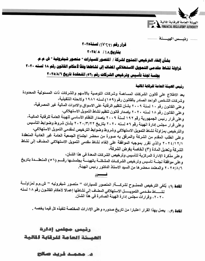 الرقابة المالية تلغي ترخيص «المنصور للسيارات» لمزاولة مقدمي التمويل الاستهلاكي بواسطة تقى حاتم 24 أغسطس 2025 | 12:10 م كتب تقى حاتم 24 أغسطس 2025 | 12:10 م نشاط التمويل الاستهلاكي - ارشيفية النشر FacebookTwitterPinterestLinkedinWhatsappTelegramEmail 146 أعلنت الهيئة العامة للرقابة المالية عن إلغاء الترخيص الممنوح لشركة المنصور للسيارات «منصور شيفروليه» لمزاولة نشاط مقدمي التمويل الاستهلاكي المضاف إلى نشاطها. وقد أصدرت الرقابة المالية القرار تحت رقم 1722 لعام 2025، وفقاً لأحكام القانون رقم 18 لعام 2020، بجلسة لجنة تأسيس وترخيص الشركات رقم 56 المتعقدة في 6 أغسطس 2025. إقرأ أيضاً سي آي كابيتال تُتم إصدار سندات توريق بـ2.2 مليار جنيه لصالح حالا للتمويل الاستهلاكي مهلة 6 أشهر لشركات التأمين لتعديل نماذج وثائق السيارات 5 شركات جديدة تحصل على رخصة نشاط وساطة إعادة التأمين للأجانب غير المقيمين بمصر اطلعت الهيئة على قانون الشركات المساهمة وشركات التوصية بالأسهم والشركات ذات المسئولية المحدودة وشركات الشخص الواحد الصادر بالقانون رقم 159 لعام 1981 ولائحته التنفيذية. ووافقت الرقابة المالية على قرار رئيس الجمهورية رقم 192 لعام 2009 بإصدار النظام الأساسي للهيئة العامة للرقابة المالية، وقرار مجلس إدارة الهيئة رقم 56 لعام 2020 بتاريخ 22 مارس بشأن شروط وضوابط التأسيس والترخيص بمزاولة نشاط التمويل الاستهلاكي وشروط وضوابط الترخيص لمقدمي التمويل الاستهلاكي. اللينك المختصرللمقال: https://amwalalghad.com/xfki التمويل الاستهلاكيالقطاع المالي غير المصرفيالهيئة العامة للرقابة الماليةشركة المنصور للسيارات