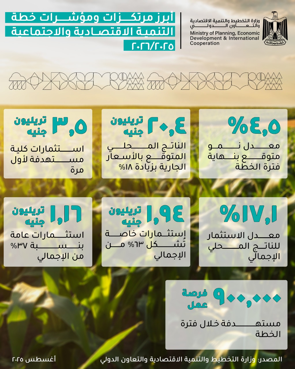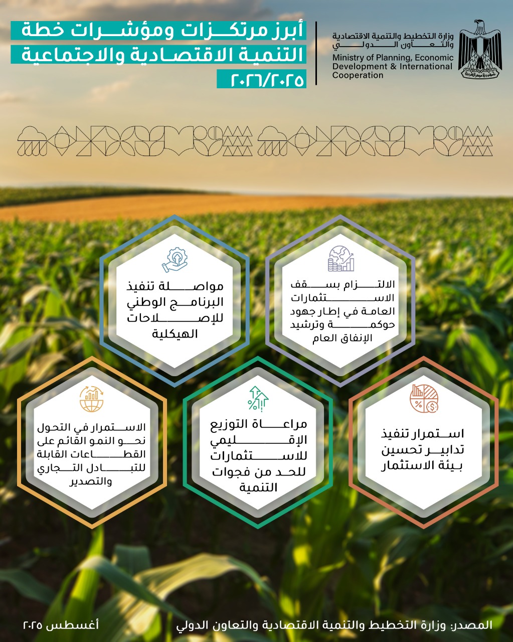 «التخطيط» تُعلن مرتكزات خطة التنمية الاقتصادية والاجتماعية للعام المالي 2025/2026 بواسطة فاطمة إبراهيم 28 أغسطس 2025 | 11:37 ص كتب فاطمة إبراهيم 28 أغسطس 2025 | 11:37 ص النشر FacebookTwitterPinterestLinkedinWhatsappTelegramEmail 32 أعلنت وزارة التخطيط والتنمية الاقتصادية والتعاون الدولي، مرتكزات خطة التنمية الاقتصادية والاجتماعية للعام المالي 2025/2026، التي بدأ تنفيذها رسميًا بدءًا من يوليو الماضي، والتي تأتي في وقت تسعى فيه الدولة المصرية لمواصلة مسيرة التنمية وسط توترات واضطرابات إقليمية ودولية متتالية، تلقي بظلالها على المشهد الاقتصادي العالمي. وأوضحت الدكتورة رانيا المشاط، وزيرة التخطيط والتنمية الاقتصادية والتعاون الدولي، أن مشروع خطة 25/2026 يُجسد النهج الجديد الذي تتبعه الوزارة بعد دمج حقيبتي التخطيط والتنمية الاقتصاديّة والتعاون الدولي، وهو التمويل من أجل التنمية، الذي يضمن الاتساق والربط بين خطط واستراتيجيّات التنمية على الـمُستوى القومي والقطاعي، وتعظيم الاستفادة من مصادر التمويل الـمُختلفة، سواء من الخزانة العامة أو من تدفّقات التمويل التنموي الـمُيسّر من شركاء التنمية في الإطار الثنائي ومُتعدّد الأطراف، وبما يخدم خطط وبرامج الدولة وتوجّهاتها التنموية. إقرأ أيضاً «المشاط» تبحث مع «جايكا» الأولويات القطاعية للمشروعات الاستثمارية وزيادة التمويلات للقطاع الخاص «التخطيط»: انعقاد لجان مشتركة بين مصر و8 دول لتعزيز التعاون التجاري والاستثماري «المشاط» تبحث مع رئيس «التصدير والاستيراد الصيني» زيادة استثمارات البنك في مصر وأضافت أن الوزارة حرصت في إعداد مشروع الخطّة على مُواصلة الالتزام بالسقف الـمُقرّر للاستثمارات العامة في إطار جهود ترشيد وحوكمة الإنفاق العام، باعتباره الركيزة الأساسيّة لتحقيق استقرار الاقتصاد الكلّي، وحشد مصادر التمويل الأخرى من خلال جذب الاستثمار الأجنبي الـمُباشر وعقد الشراكات الاستثماريّة الكُبرى العربيّة والإقليميّة، وتعزيز توجّه الدولة لإفساح الـمجال لـمُشاركة القطاع الخاص في الجهود الإنمائيّة. وتبلورت الركائز الأساسيّة لـمُستهدفات الخطّة لصياغة منهجيّة جديدة لإعداد مشروع وثيقة خطّة التنمية لعام 25/2026، تُراعي أن يكون إعداد خطّة العام في إطار مُوازني مُتوسّط الأجل (25/2026 – 28/2029) والذي يضُم سنة الـمُوازنة وثلاث سنوات لاحقة، وذلك توحيدًا للـمدى الزمني للخطة من منظور وزارة التخطيط والتنمية الاقتصاديّة والتعاون الدولي ووزارة الـماليّة. بالإضافة إلى تعزيز النهج التشاركي في إعداد الخطة في إطار الالتزام بقانون التخطيط رقم 18 لعام 2022، واتباع الأدوات التخطيطيّة الـمُتطورّة التي استحدثتها وزارة التخطيط والتنمية الاقتصاديّة والتعاون الدولي لرفع كفاءة الاستثمار العام ومُتابعة التمويلات الدوليّة والاستثمارات العامة، ومُتابعة وتقويم الأداء، والتنسيق والتعاون مع الوزارات والجِهات ذات الصلة لتحسين جودة الخطط التنمويّة من خلال إمداد كافة جهات الإسناد بدليل إعداد الخطّة، والذي يُقرّر معايير اختيار الـمشروعات ومعايير إجراء وتقويم دراسات الجدوى الاقتصاديّة ومعايير تقويم الاستثمار العام لكل جهة إسناد. كما ترتكز أولويات الخطة على مواصلة تنفيذ البرنامج الوطني للإصلاحات الهيكلية بمحاوره الثلاثة، والتي تشمل: تعزيز استقرار الاقتصاد الكلي، وزيادة القُدرة التنافسيّة وتحسين بيئة الأعمال لزيادة مُشاركة القطاع الخاص، ودعم الانتقال إلى الاقتصاد الأخضر، إلى جانب دفع الاقتصاد المصري نحو القطاعات القابلة للتبادل التجاري والتصدير لتعزيز القدرات الإنتاجية. وأوضحت وثيقة خطة التنمية الاقتصادية والاجتماعية، أنها ترتكز على تطبيق فكر الأولويات لترشيد أوجه الإنفاق العام ورفع كفاءته، والذي يُعطي أولويّة لدفع عجلة النمو الاقتصادي في قطاعات الزراعة والصناعة التحويليّة والاتصالات وتكنولوجيا الـمعلومات، والقطاعات الأخرى التي تحظى فيها مصر بميزة نسبيّة كال