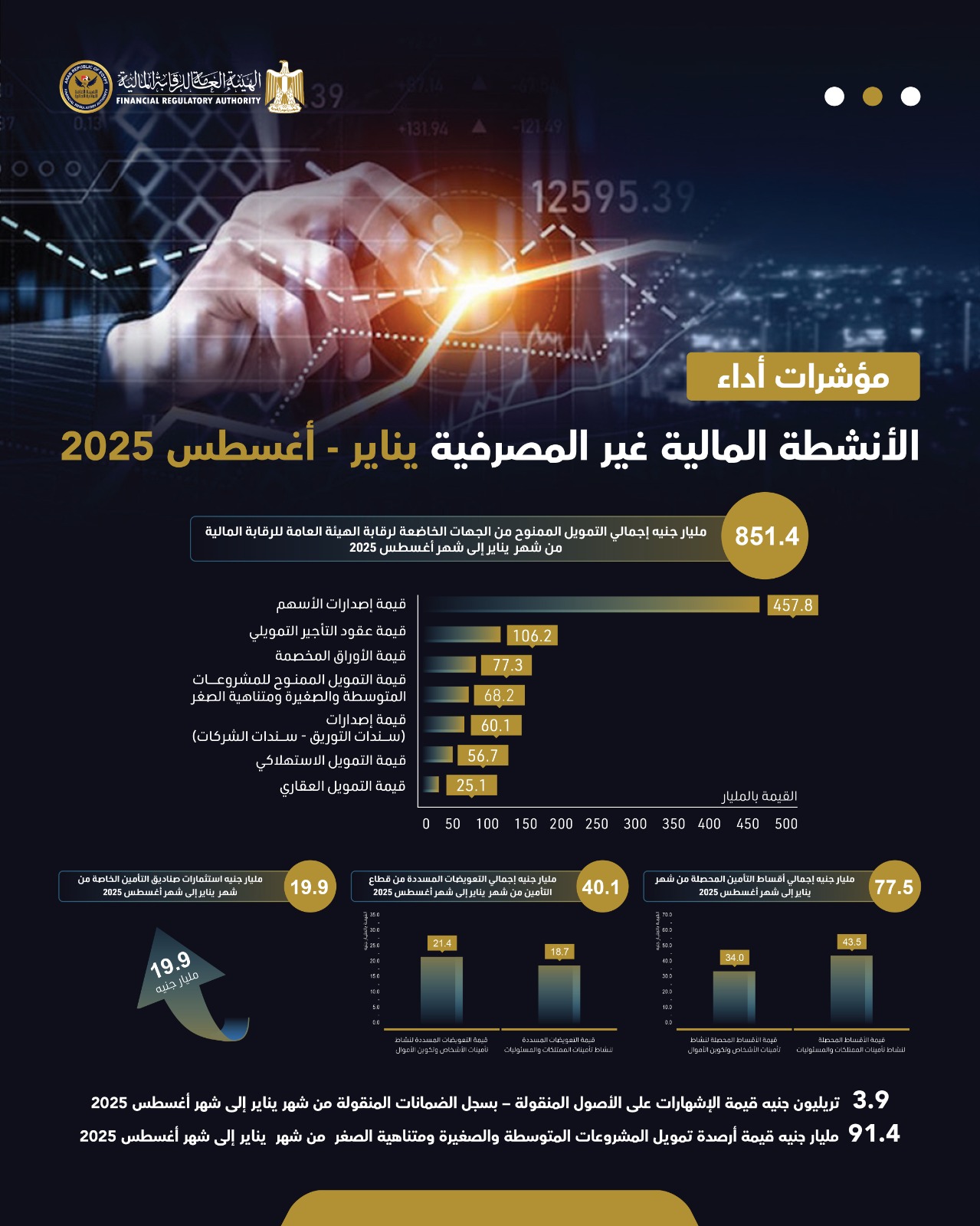 851.4 مليار جنيه حجم أنشطة سوق المال والتمويل غير المصرفي خلال 8 أشهر 77.5 مليار جنيه حصيلة أقساط التأمين بواسطة إسلام عبد الحميد 21 أكتوبر 2025 | 1:57 م كتب إسلام عبد الحميد 21 أكتوبر 2025 | 1:57 م النشر FacebookTwitterPinterestLinkedinWhatsappTelegramEmail 68 بلغ إجمالي التمويل الممنوح من خلال الجهات الخاضعة لرقابة الهيئة العامة للرقابة المالية(أنشطة سوق رأس المال، أنشطة التمويل غير المصرفي) نحو 851.4 مليار جنيه خلال الـ8 أشهر الأولى من 2025، بحسب تقرير صادر عن الهيئة. وتوزعت هذه التمويلات بين 457.8 مليار جنيه قيمة إصدارات الأسهم ، ونحو 60.1 مليار جنيه قيمة إصدارات الأوراق المالية بخلاف الأسهم، كما سجلت قيمة عقود التأجير التمويلي 106.2 مليار جنيه ، وبلغت قيمة التمويل الممنوح للمشروعات المتوسطة والصغيرة ومتناهية الصغر نحو 68.2 مليار جنيه، كما سجلت قيمة التمويل الاستهلاكي 56.7 مليار جنيه. إقرأ أيضاً الرقابة المالية تصدر 4 قرارات لتعزيز تنظيم تمويل المشروعات الصغيرة ومتناهية الصغر بنك saib يتعاون مع صندوق الإسكان الاجتماعي لتوفير تمويل عقاري للمواطنين بقيمة 1.5 مليار جنيه التوفيق للتأجير التمويلي تعلن إتمام الإصدار الأول لسندات توريق بقيمة 1.8 مليار جنيه وبلغت قيمة الأوراق المخصمة 77.3 مليار جنيه، وسجلت قيمة التمويل العقاري 25.1 مليار جنيه، وارتفعت قيمة الإشهارات على الأصول المنقولة – بسجل الضمانات المنقولة بنهاية شهر أغسطس 2025 لتسجل نحو 3.9 تريليون جنيه. وأوضح تقرير الهيئة أن قيمة أرصدة تمويل المشروعات المتوسطة والصغيرة ومتناهية الصغر سجلت 91.4 مليار جنيه بنهاية أغسطس. وبلغ إجمالي أقساط التأمين المحصلة خلال الـ8 أشهر الأولى من 2025 نحو 77.5 مليار جنيه، حيث بلغت قيمة الأقساط المحصلة لنشاط التأمينات الممتلكات والمسئوليات 43.5 مليار جنيه، فيما سجلت قيمة الأقساط المحصلة لنشاط تأمينات الأشخاص وتكوين الأموال 34 مليار جنيه. كما سددت شركات التأمين تعويضات بقيمة 40.1 مليار جنيه، حيث بلغت قيمة التعويضات المسددة لتأمينات الممتلكات والمسئوليات 18.7 مليار جنيه، فيما سجلت قيمة التعويضات المسددة للأشخاص وتكوين الأموال 21.4 مليار جنيه. وقد اعتمدت الهيئة 19.9 مليار جنيه استثمارات جديدة لصناديق التأمين الخاصة بنهاية أغسطس 2025. اللينك المختصرللمقال: https://amwalalghad.com/57hu التأجير التمويليالتأمينالتخصيمالتمويل الاستهلاكيالتمويل العقاريالتمويل متناهي الصغرالضمانات المنقولةالهيئة العامة للرقابة الماليةسوق المالصناديق التأمين الخاصةقطاع التأمين