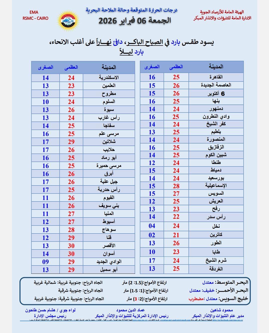 توقعات حالة الطقس غدا : ارتفاع الحرارة مستمر وتحذيرات من الأتربة والرياح على عدة مناطق بواسطة أموال الغد 5 فبراير 2026 | 5:02 م كتب أموال الغد 5 فبراير 2026 | 5:02 م توقعات حالة الطقس غدا النشر FacebookTwitterPinterestLinkedinWhatsappTelegramEmail 267 أعلنت الهيئة العامة للأرصاد الجوية تفاصيل توقعات حالة الطقس في مصر ليوم الجمعة 6 فبراير 2026، مشيرة إلى استمرار الارتفاع التدريجي في درجات الحرارة على أغلب أنحاء الجمهورية، مع أجواء باردة خلال ساعات الصباح الباكر، تميل إلى الدفء نهارًا، ثم تعود للانخفاض ليلًا. وأوضحت الهيئة أن الطقس يسود باردًا في الصباح الباكر على معظم المناطق، بينما يكون دافئًا نهارًا على القاهرة الكبرى والوجه البحري والسواحل الشمالية وشمال الصعيد، ومائلًا للحرارة على جنوب الصعيد، على أن تنخفض درجات الحرارة ليلًا لتسود أجواء باردة على أغلب الأنحاء. إقرأ أيضاً توقعات حالة الطقس غدا في مصر.. دافىء نهاراً بارد ليلا وأمطار ورياح توقعات حالة الطقس غدا في مصر.. تحسن نسبي بالأحوال الجوية في أغلب الأنحاء حالة الطقس.. تقلبات جوية وأمطار والسحب تمتد إلى القاهرة خلال ساعات وحذرت الأرصاد من تكوّن شبورة مائية قد تكون كثيفة أحيانًا خلال الساعات الأولى من الصباح، خاصة على بعض الطرق الزراعية والسريعة والقريبة من المسطحات المائية، الممتدة من شمال البلاد وحتى القاهرة الكبرى، إضافة إلى شمال الصعيد ومدن القناة ووسط سيناء، ما قد يؤثر على مستوى الرؤية الأفقية. وبشأن فرص سقوط الأمطار، أشارت الهيئة إلى وجود احتمالات لأمطار خفيفة على مناطق من السواحل الشمالية وشمال الوجه البحري، تمتد بنسبة ضعيفة قد تصل إلى نحو 20% على مناطق من وسط سيناء وشمال الصعيد، وقد تصل بشكل محدود إلى بعض مناطق القاهرة الكبرى، دون أن تؤثر بشكل كبير على الأنشطة اليومية. كما نبهت الأرصاد إلى نشاط الرياح المثيرة للأتربة على بعض المناطق المكشوفة، خاصة على السواحل الشمالية والوجه البحري والقاهرة الكبرى ومدن القناة وشمال ووسط سيناء، وهو ما قد يزيد الإحساس ببرودة الطقس خلال فترات المساء. وعن حالة الملاحة البحرية، أوضحت الهيئة أن البحر المتوسط يكون معتدلًا، مع ارتفاع للأمواج يتراوح بين 1.5 و2 متر، بينما يكون البحر الأحمر خفيفًا إلى معتدل، مع ارتفاع للأمواج بين متر و1.5 متر. أما خليج السويس، فتشهد الملاحة به اضطرابًا نسبيًا نتيجة نشاط الرياح، حيث تتراوح سرعتها بين 40 و50 كيلومترًا في الساعة، مع ارتفاع للأمواج من 2 إلى 3 أمتار. وبالنسبة لدرجات الحرارة المتوقعة، تسجل القاهرة الكبرى 25 درجة مئوية للعظمى و16 للصغرى، بينما تصل العظمى على السواحل الشمالية إلى نحو 24 درجة، وتسجل محافظات شمال الصعيد درجات حرارة عظمى تتراوح بين 27 و29 درجة، في حين ترتفع في جنوب الصعيد لتصل إلى 30 درجة مئوية، مع انخفاض ملحوظ في درجات الحرارة الصغرى خلال ساعات الليل. وأكدت الهيئة العامة للأرصاد الجوية استمرار متابعة الحالة الجوية على مدار الساعة، مع إصدار التحديثات اللازمة في حال حدوث أي تغيرات، مناشدة المواطنين توخي الحذر أثناء القيادة في فترات الشبورة، واتباع التعليمات الصادرة، خاصة للعاملين في الأنشطة البحرية، حفاظًا على السلامة العامة. اللينك المختصرللمقال: https://amwalalghad.com/jjwu أمطار خفيفةالطقس في مصرالهيئة العامة للأرصاد الجويةتوقعات حالة الطقس غداًحالة الطقس اليومحالة الملاحة البحريةدرجات الحرارةشبورة مائيةطقس الجمعة
