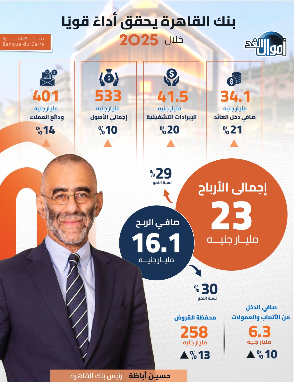 بنك القاهرة يحقق أداءً قويا خلال عام 2025 .. انفوجراف بواسطة محمد حمدي 11 فبراير 2026 | 5:40 م كتب محمد حمدي 11 فبراير 2026 | 5:40 م النشر FacebookTwitterPinterestLinkedinWhatsappTelegramEmail 135 حقق بنك القاهرة أداءً إيجابيًا خلال العام المالي 2025، حيث سجل نموًا في صافي أرباحه بنسبة 30% مقارنة بالعام السابق، ليصل إلى 16.1 مليار جنيه، بزيادة 30% عن صافي أرباح عام 2024 التي بلغت 12.4 مليار جنيه. وارتفعت الأرباح قبل الضرائب بنسبة 29%، مدفوعاً بتحسن نتائج أعمال البنك في مختلف القطاعات ومن أبرزها التجزئة المصرفية والخزانة وائتمان الشركات والمشروعات الصغيرة والمتوسطة. إقرأ أيضاً بنك القاهرة يتخارج من «الأفريقي للاستيراد والتصدير» خلال 2025 بنك القاهرة يرفع استثماراته في صندوق القطاع المالي ويعلن تغيير اسم كايرو للتأجير التمويلي صافي أرباح بنك القاهرة ينمو 46% ليسجل 12.6 مليار جنيه بنهاية سبتمبر 2025 اللينك المختصرللمقال: https://amwalalghad.com/mewx أرباح بنك القاهرة 2025نتائج أعمال بنك القاهرة