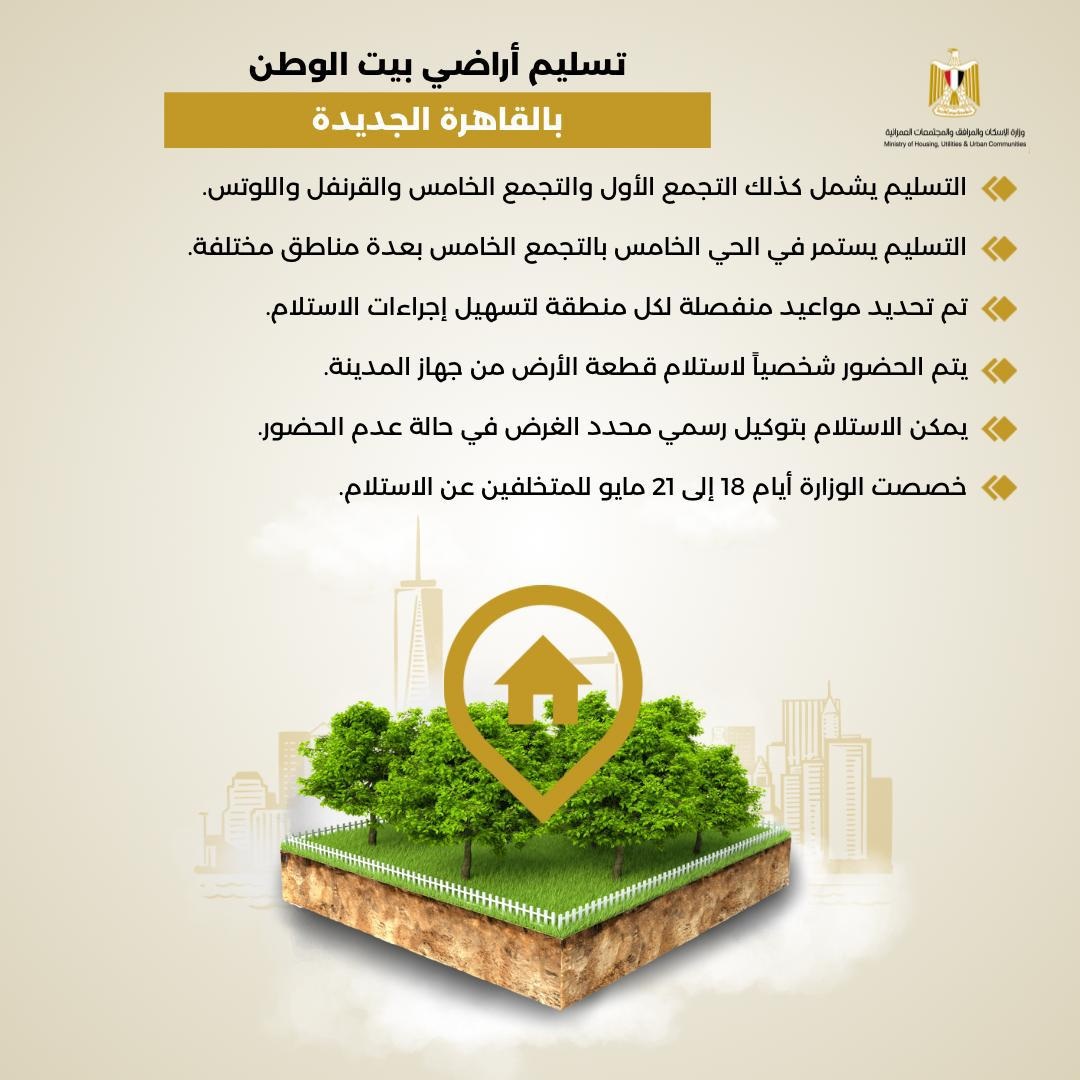 «الإسكان»: بدء تسليم قطع أراضي «بيت الوطن» المرحلة الثامنة والتاسعة بالقاهرة الجديدة..24 مارس بواسطة مها عصام 8 مارس 2026 | 11:55 ص كتب مها عصام 8 مارس 2026 | 11:55 ص وزارة الإسكان النشر FacebookTwitterPinterestLinkedinWhatsappTelegramEmail 41 أعلنت المهندسة راندة المنشاوي، وزيرة الإسكان والمرافق والمجتمعات العمرانية، عن تسليم قطع أراضي “بيت الوطن” المرحلة الثامنة والتاسعة للمصريين العاملين بالخارج بعددٍ من المناطق والأحياء بمدينة القاهرة الجديدة، وذلك اعتبارًا من يوم الثلاثاء 24/3/2026، وحتى يوم الخميس 21/5/2026، وفقاً للمواعيد المقررة. وفي هذا الإطار، أوضحت المهندسة راندة المنشاوي، أنه يتم إتاحة قطع أراضٍ ووحدات سكنية بمشروع “بيت الوطن” بالمدن الجديدة للعاملين بخارج مصر، بهدف التيسير على أبناء مصر في الخارج في تملك مسكنهم الملائم وفق الاشتراطات، وربطهم بوطنهم الأم، مشددةً في هذا الصدد على تذليل أي عقبات قد تواجه تنفيذ مشروع بيت الوطن، والمتابعة الدورية للمشروع. إقرأ أيضاً وزيرة الإسكان تتابع مشروعات «ظلال» والبنية الأساسية وأعمال التطوير بمدينة الشيخ زايد وزيرة الإسكان تتابع موقف تنفيذ عدد من المشروعات بمدينتي «حدائق أكتوبر» و«6 أكتوبر» نائب وزيرة الإسكان يتفقد مشروعات الصرف الصحي ضمن مبادرة حياة كريمة بمحافظة المنيا ومن جانبه، أوضح المهندس أحمد رشاد، رئيس جهاز تنمية مدينة القاهرة الجديدة، أنه سيتم تسليم قطع الأراضي بالمرحلتين الثامنة والتاسعة (الأساسية والتكميلية) بمنطقة شمال بيت الوطن A: يوم الثلاثاء 24/3/2026، وبمنطقة شمال بيت الوطن B: يوم الأربعاء 25/3/2026، وبمنطقة شمال بيت الوطن C: يوم الأحد 29/3/2026، وبمنطقة شمال بيت الوطن D: يوم الثلاثاء 31/3/2026، وبمنطقة شمال بيت الوطن E: يوم الخميس 2/4/2026، وبمنطقة شمال بيت الوطن F: يوم الأحد 5/4/2026، وبمنطقة شمال بيت الوطن G: يوم الثلاثاء 7/4/2026. وأضاف رئيس جهاز مدينة القاهرة الجديدة، أنه سيتم تسليم قطع أراضي بيت الوطن بالحي السابع بالمنطقة A: يوم الأربعاء 8/4/2026: وبالمنطقة B: يوم الخميس 9/4/2026، وبالمنطقة C: يوم الأحد 12/4/2026، وبالمنطقة F: يوم الثلاثاء 14/4/2026، وبالمنطقة D: يوم الأربعاء 15/4/2026، وبالمنطقة شمال الرحاب K: يوم الخميس 16/4/2026، وبمنطقة امتداد غرب الجولف م4، يوم الأحد 19/4/2026: والتجمع الأول: يوم الإثنين 20/4/2026، والتجمع الخامس – الحي الثالث: يوم الثلاثاء 21/4/2026، والقرنفل: يوم الأربعاء 22/4/2026، واللوتس المناطق G – H: يوم الأحد 26/4/2026. وأضاف: سيتم تسليم قطع الأراضي بالتجمع الخامس A: يوم الإثنين 27/4/2026، وبالحي الخامس B: يوم الثلاثاء 28/4/2026، وبالحي الخامس C: يوم الأربعاء 29/4/2026، وبالحي الخامس D: يوم الأحد 3/5/2026، وبالحي الخامس E: يوم الإثنين 4/5/2026، وبالحي الخامس F: يوم الثلاثاء 5/5/2026، وبالحي الخامس G: يوم الأربعاء 6/5/2026، وبالحي الخامس H: يوم الخميس 7/5/2026، وبالحي الخامس I: يوم الأحد 10/5/2026، وبالحي الخامس J: يوم الإثنين 11/5/2026، وبالحي الخامس L: يوم الثلاثاء 12/5/2026، وبالحي الخامس M: يوم الأربعاء 13/5/2026، وبالحي الخامس N: يوم الخميس 14/5/2026، وبالحي الخامس Q: يوم الأحد 17/5/2026. وأضاف رئيس الجهاز، أنه تم تخصيص الأيام من الإثنين 18/5/2026 وحتى يوم الخميس 21/5/2026، للذين تخلفوا عن الاستلام في المواعيد السابقة، ويتم الحضور شخصياً للاستلام أو بموجب توكيل رسمي محدد الغرض للاستلام. اللينك المختصرللمقال: https://amwalalghad.com/umrg اراضي بيت الوطنوزارة الإسكان والمرافق والمجتمعات العمرانية
