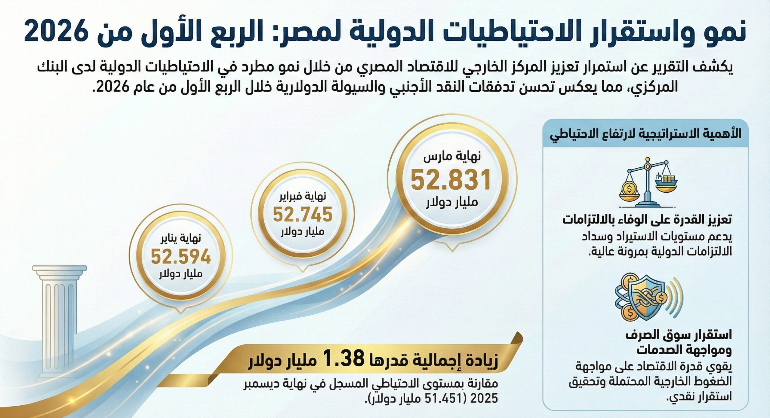 الاحتياطي النقدي الأجنبي يرتفع 1.4 مليار دولار في الربع الأول من 2026 بواسطة ندى عبد العزيز 6 أبريل 2026 | 12:18 م كتب ندى عبد العزيز 6 أبريل 2026 | 12:18 م البنك المركزي المصري النشر FacebookTwitterPinterestLinkedinWhatsappTelegramEmail 74 واصل صافي الاحتياطيات الدولية لدى البنك المركزي المصري تسجيل مسار تصاعدي خلال الربع الأول من عام 2026، ليعكس تحسنًا مستمرًا في وضع المركز الخارجي للاقتصاد المصري، مع استقرار نسبي في تدفقات النقد الأجنبي وتعزيز مستويات السيولة الدولارية. وكشفت بيانات البنك المركزي المصري عن ارتفاع صافي الاحتياطي النقدي إلى 52.831 مليار دولار بنهاية مارس 2026، مقارنة بنحو 51.451 مليار دولار بنهاية ديسمبر 2025، بزيادة إجمالية بلغت نحو 1.38 مليار دولار خلال الربع الأول من العام. إقرأ أيضاً محافظ البنك المركزي ينعى إسماعيل حسن المحافظ الأسبق وفاة إسماعيل حسن محافظ البنك المركزي الأسبق بعد مسيرة حافلة سعر الدولار مقابل الجنيه اليوم السبت 11-4-2026 وأظهرت البيانات أن الاحتياطي سجل 52.594 مليار دولار بنهاية يناير 2026، قبل أن يرتفع إلى 52.745 مليار دولار بنهاية فبراير، ثم يواصل صعوده في مارس ليصل إلى مستواه الحالي 52.831 مليار دولار. ويعكس هذا الأداء استمرار تعزيز قوة المركز الخارجي للاقتصاد المصري، مع الحفاظ على مستويات مرتفعة من الاحتياطي النقدي الأجنبي، بما يدعم قدرة الدولة على الوفاء بالتزاماتها الخارجية، سواء المرتبطة بالاستيراد أو سداد الالتزامات الدولية. ويأتي هذا الارتفاع في إطار اتجاه عام لتحسن المؤشرات النقدية، بما يعزز من استقرار سوق الصرف ويقوي من قدرة الاقتصاد على مواجهة أي ضغوط خارجية محتملة. اللينك المختصرللمقال: https://amwalalghad.com/a9d4 احتياطي النقد الاجنبيالبنك المركزي المصري