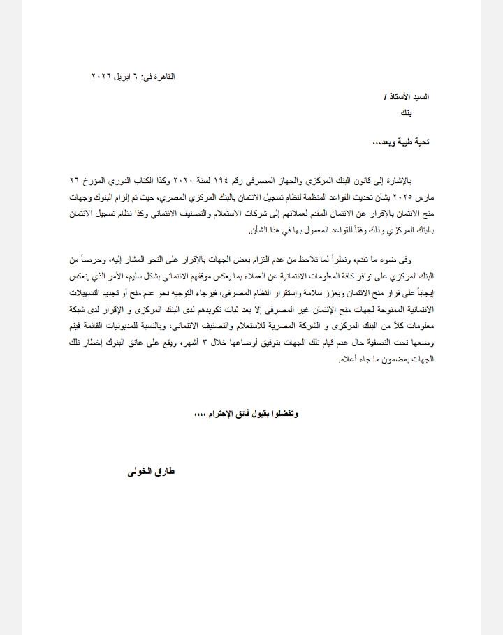 البنك المركزي يحظر التسهيلات الائتمانية للجهات غير المكودة بواسطة ندى عبد العزيز 7 أبريل 2026 | 8:47 م كتب ندى عبد العزيز 7 أبريل 2026 | 8:47 م البنك المركزي المصري النشر FacebookTwitterPinterestLinkedinWhatsappTelegramEmail 78 وجّه البنك المركزي المصري البنوك العاملة في السوق المحلية بعدم منح أو تجديد التسهيلات الائتمانية للعملاء إلا بعد مراجعة موقفهم الائتماني، والتأكد من استيفاء البيانات والإقرار بها في كل من نظام تسجيل الائتمان بالبنك المركزي والشركة المصرية للاستعلام والتصنيف الائتماني. وأوضح البنك المركزي، في خطاب موجه إلى البنوك، أن ذلك يأتي بالإشارة إلى قانون البنك المركزي والجهاز المصرفي رقم 194 لسنة 2020، والكتاب الدوري الصادر في 25 مارس 2025، والذي تضمن تحديث القواعد المنظمة لنظام تسجيل الائتمان بالبنك المركزي المصرى. إقرأ أيضاً محافظ البنك المركزي ينعى إسماعيل حسن المحافظ الأسبق وفاة إسماعيل حسن محافظ البنك المركزي الأسبق بعد مسيرة حافلة سعر الدولار مقابل الجنيه اليوم السبت 11-4-2026 وحرصاً من البنك المركزي على توافر كافة المعلومات الائتمانية عن العملاء بما يعكس موقفهم الائتماني بشكل سليم، الأمر الذي ينعكس إيجاباً على قرار منح الائتمان ويعزز سلامة واستقرار النظام المصرفي، شدد على عدم منح أو تجديد التسهيلات الائتمانية للعملاء إلا بعد ثبات تكويدهم الائتماني لدى البنك المركزي المصري أو بعد تأكيد استيفاء البيانات والإقرار في شبكة معلومات كل من البنك المركزي والشركة المصرية للاستعلام والتصنيف الائتماني. واضاف انه بالنسبة للمديونات القائمة فسيتم وضعها تحت التصنيف حال عدم قيام تلك الجهات بتوفيق أوضاعها خلال 3 أشهر، ويقع على عاتق البنوك إخطار تلك الجهات بمضمون ما جاء أعلاه. اللينك المختصرللمقال: https://amwalalghad.com/glcn البنك المركزي المصريالبنوك المصريةمنح الائتمان