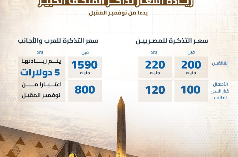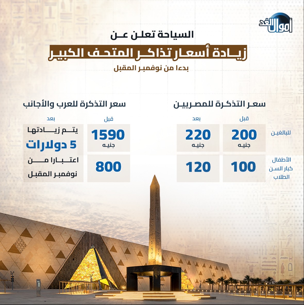 انفوجراف.. زيادة أسعار تذاكر المتحف الكبير بدءا من نوفمبر المقبل بواسطة هاجر بركات 15 أبريل 2026 | 3:30 م كتب هاجر بركات 15 أبريل 2026 | 3:30 م النشر FacebookTwitterPinterestLinkedinWhatsappTelegramEmail 18 أعلنت وزارة السياحة والآثار عن زيادة أسعار تذاكر دخول المتحف اعتباراً من الأول من نوفمبر المقبل، بواقع 5 دولارات للزائر الأجنبي و20 جنيهاً مصرياً للزائر المصري. إقرأ أيضاً زيادة جديدة في أسعار تذاكر المتحف المصري الكبير بدءًا من نوفمبر المقبل السياحة: موقع (Visit-GEM.com) هو المنصة الرسمية والوحيدة المعتمدة لشراء تذاكر زيارة المتحف المصري الكبير يبدأ من الغد.. تفاصيل نظام الدخول الجديد وأسعار تذاكر المتحف المصري الكبير أسعار تذاكر المتحف الكبيرحجز تذاكر المتحف المصري